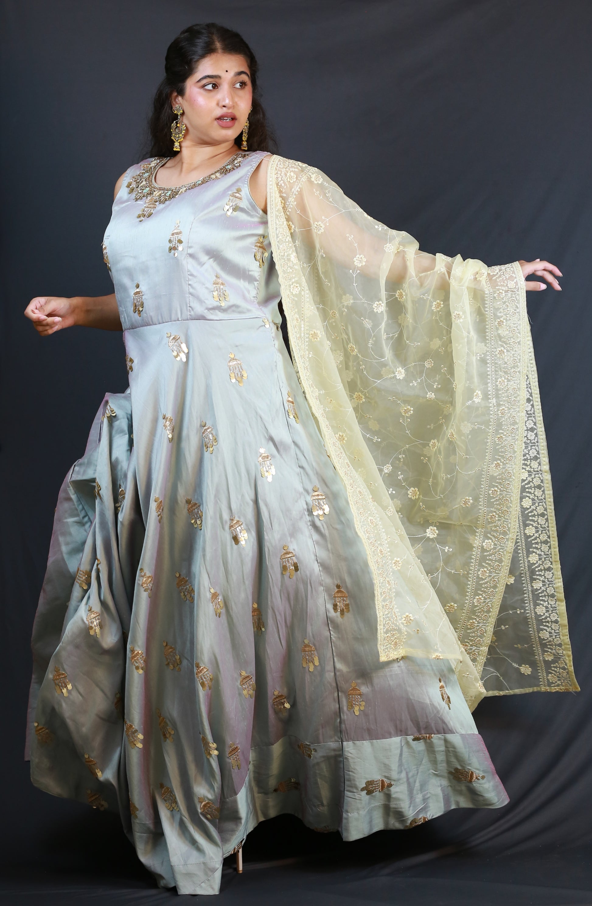 Elevate your ethnic wardrobe with this expertly crafted grey Anarkali dress. Designed to offer a graceful silhouette, its flowing fabric ensures comfort while enhancing your natural elegance. Perfect for formal occasions, this dress combines traditional style with modern sophistication, making it a versatile addition to your collection.