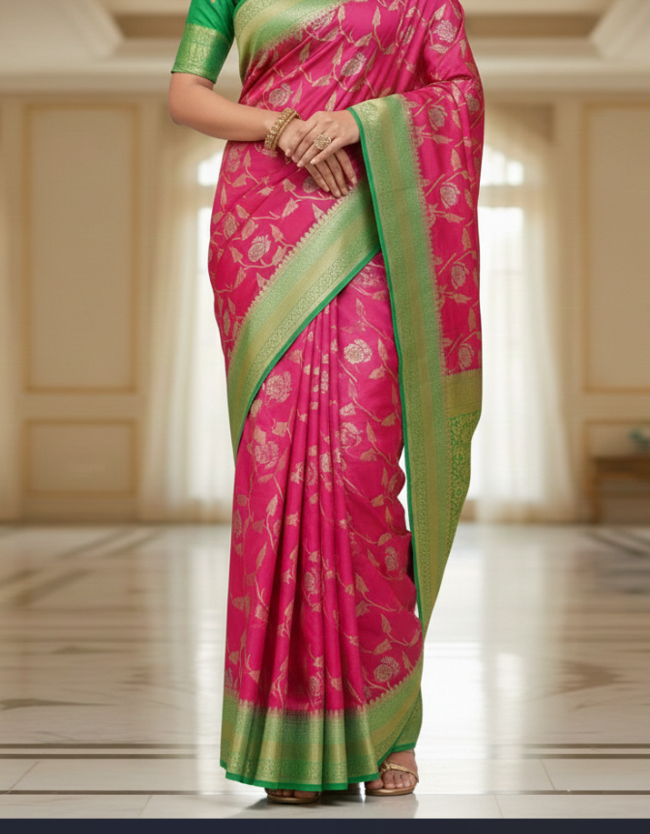 Elevate your ethnic wardrobe with this stunning magenta Arni silk saree, crafted from premium pure silk for a luxurious drape and natural sheen. The vibrant magenta hue is beautifully complemented by contrasting pallu and border details that add depth and sophistication to your ensemble. This saree comes complete with a coordinating blouse piece, making it ready to wear for weddings, festivals, and special occasions. The fine weave of Arni silk ensures comfort throughout the day while maintaining its elegant appearance. Perfect for those who appreciate traditional craftsmanship combined with timeless style.