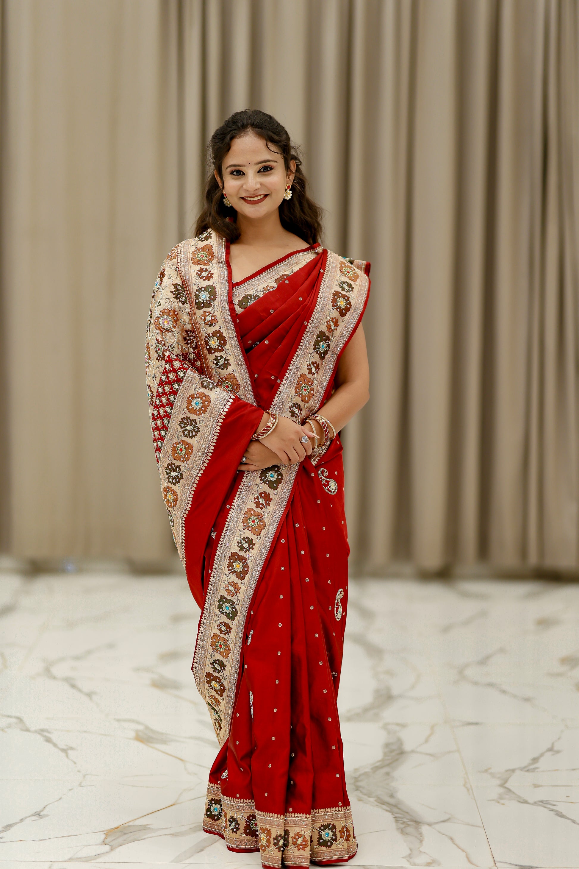 Elevate your traditional wardrobe with this exquisite Maroon Banarasi Silk Saree. Crafted from premium silk, it features intricate zari work that highlights the rich heritage of Banarasi weaving. The deep maroon hue adds a regal touch, making it perfect for weddings and festive occasions. Its luxurious texture ensures comfort while exuding elegance, embodying timeless craftsmanship and sophistication.