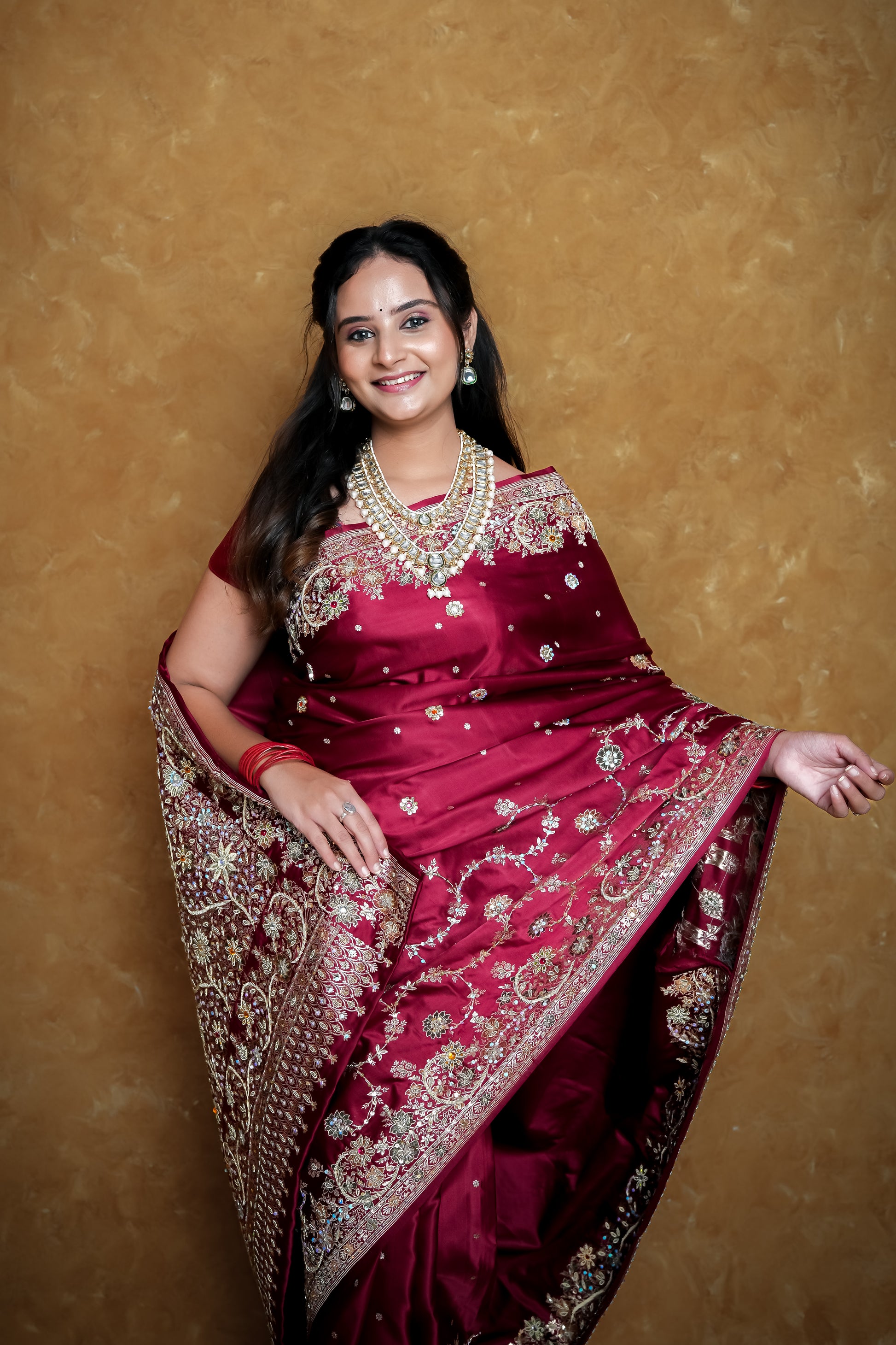 This maroon Banarasi silk saree features exquisite all-over zardosi embroidery, showcasing meticulous craftsmanship and traditional artistry. The rich silk fabric combined with intricate metallic threadwork offers a luxurious texture and opulent appearance, making it ideal for special occasions and festive wear. Its deep maroon hue enhances the elegance, while the detailed zardosi patterns add timeless charm and sophistication to your wardrobe.