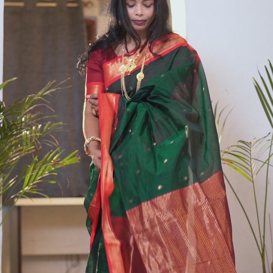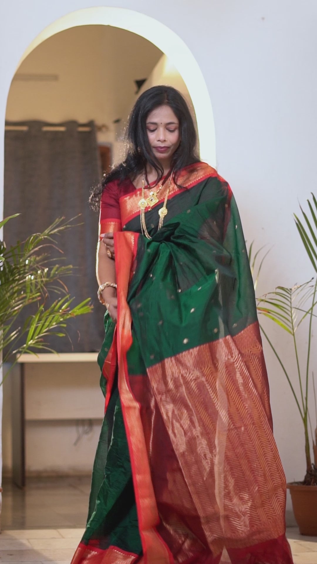Elevate your traditional wardrobe with this bottle green cotton saree, featuring a striking contrast red border that adds a refined touch. Paired with a matching red blouse, this ensemble offers both comfort and elegance, perfect for formal occasions or festive celebrations. The breathable cotton fabric ensures all-day wearability while maintaining a sophisticated look.
