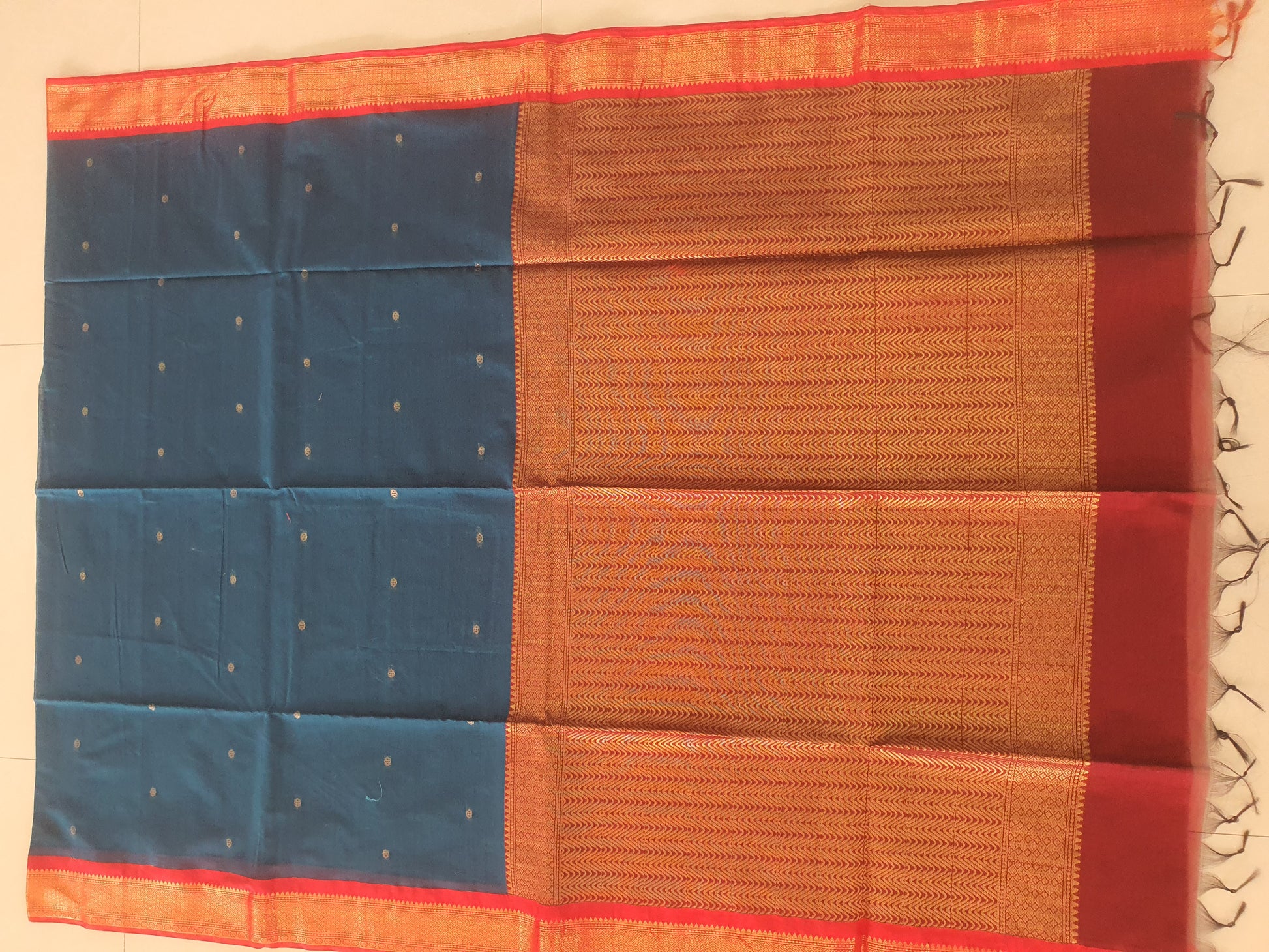 This cotton saree features a refined teal hue complemented by a contrasting border and pallu, enhancing its traditional appeal. Crafted from breathable cotton, it ensures comfort and durability, making it ideal for daily wear or special occasions. The contrasting elements add visual interest while maintaining an elegant, timeless look. Perfect for those seeking a blend of classic style and practical fabric quality.