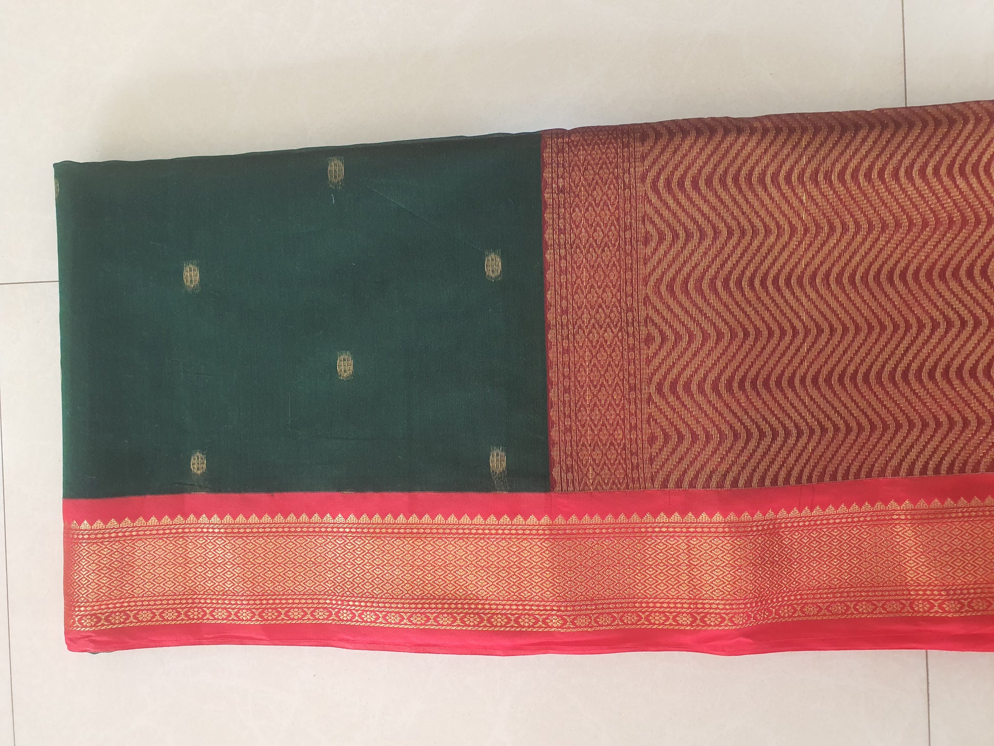 This elegant cotton saree in bottle green features a striking contrast red border and pallu, combining traditional charm with vibrant accents. Crafted from breathable cotton, it ensures comfort throughout the day while maintaining a refined look. Ideal for both casual and festive occasions, this saree offers a timeless appeal with its rich color combination and quality fabric.