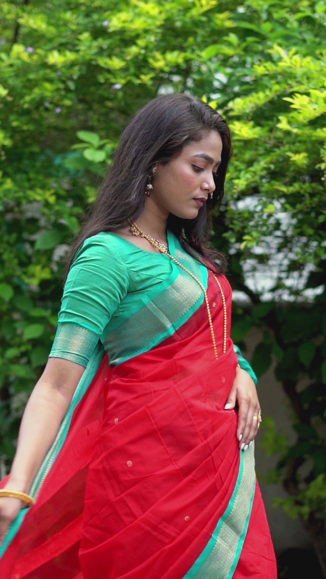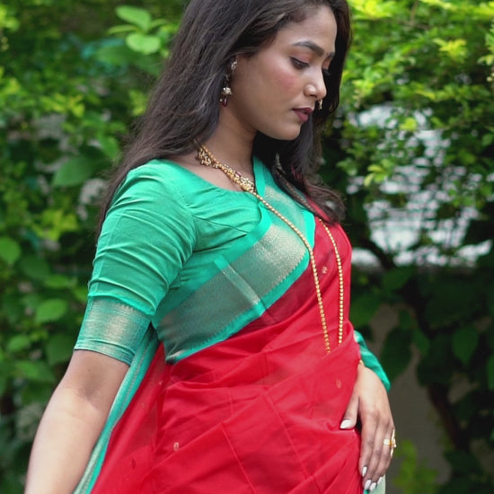 This fresh red cotton saree features a striking contrast rama green border and matching blouse, combining traditional elegance with vibrant color harmony. Crafted from breathable cotton, it ensures comfort and ease for daily wear or special occasions. The contrasting border adds a refined touch, making it a versatile addition to your ethnic wardrobe.