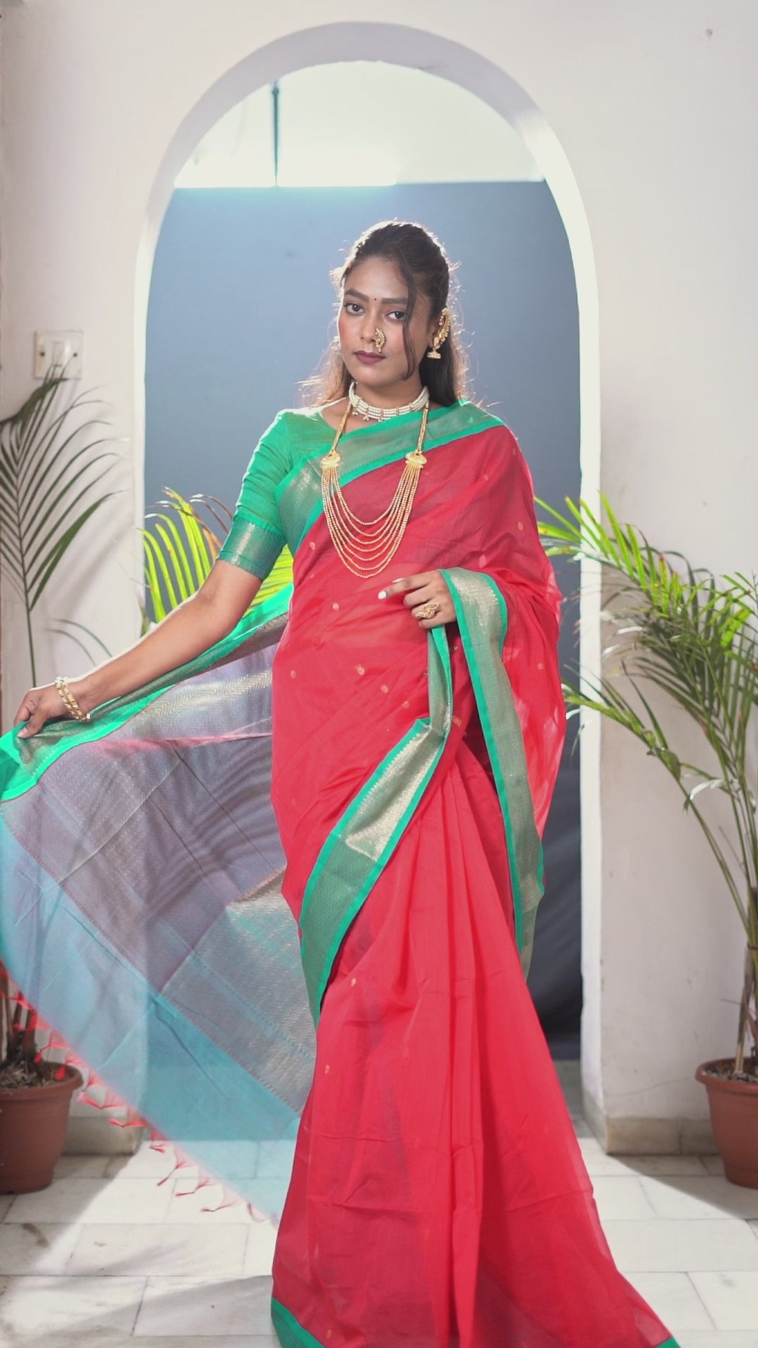 Experience the elegance of this fresh gajari-colored cotton saree, expertly crafted for comfort and style. Featuring a striking rama green contrast border and matching blouse, it offers a perfect blend of traditional charm and contemporary appeal. Ideal for daily wear or festive occasions, this saree ensures breathability and ease, making it a versatile addition to your wardrobe.