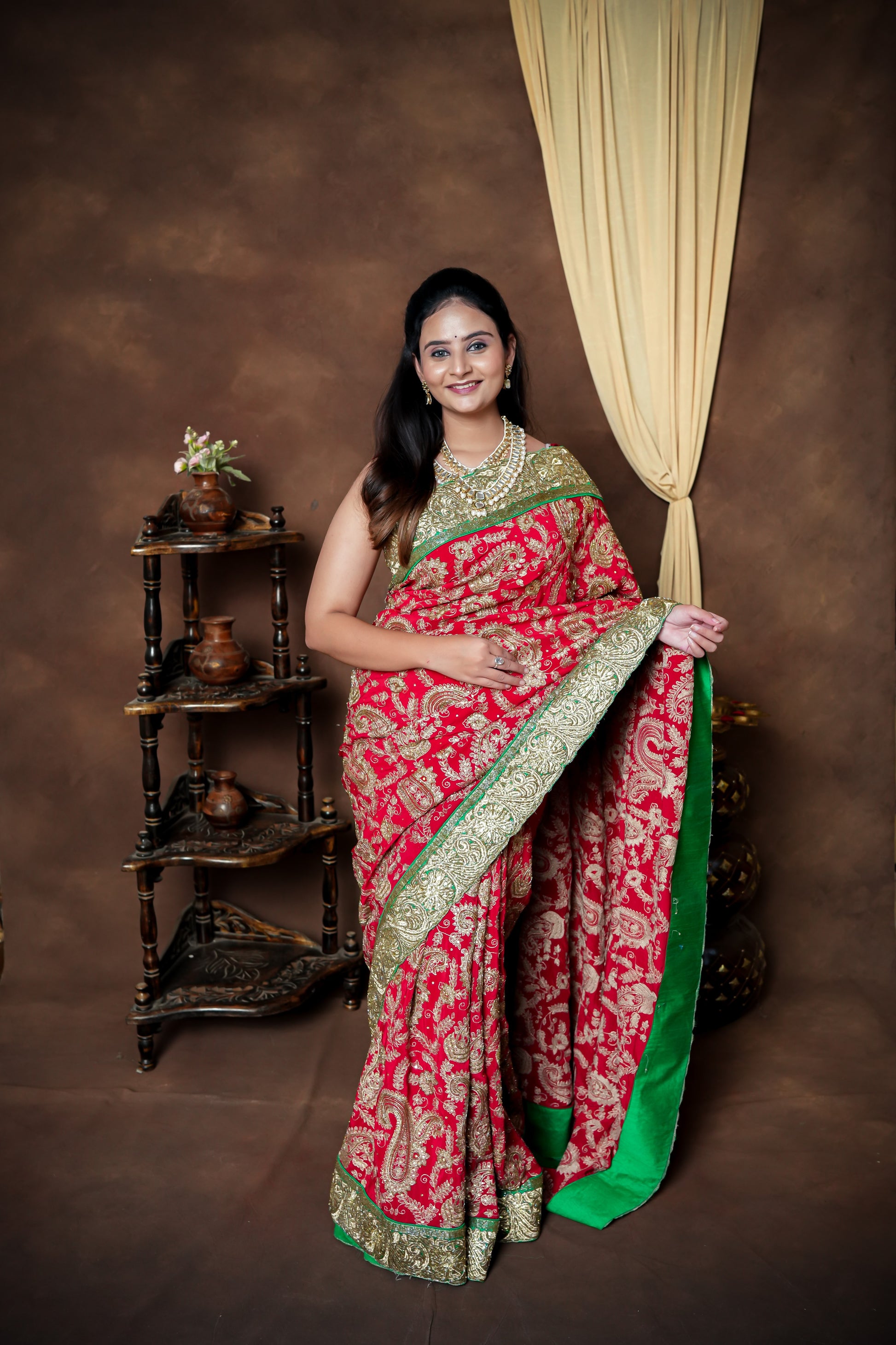 Experience the elegance of this red Crap Silk Handwork Saree, meticulously crafted for a refined look. The rich silk fabric offers a smooth, lustrous texture that drapes beautifully, while the intricate handwork adds a unique artisanal touch. Ideal for formal occasions, this saree combines traditional craftsmanship with vibrant color to enhance your presence effortlessly.