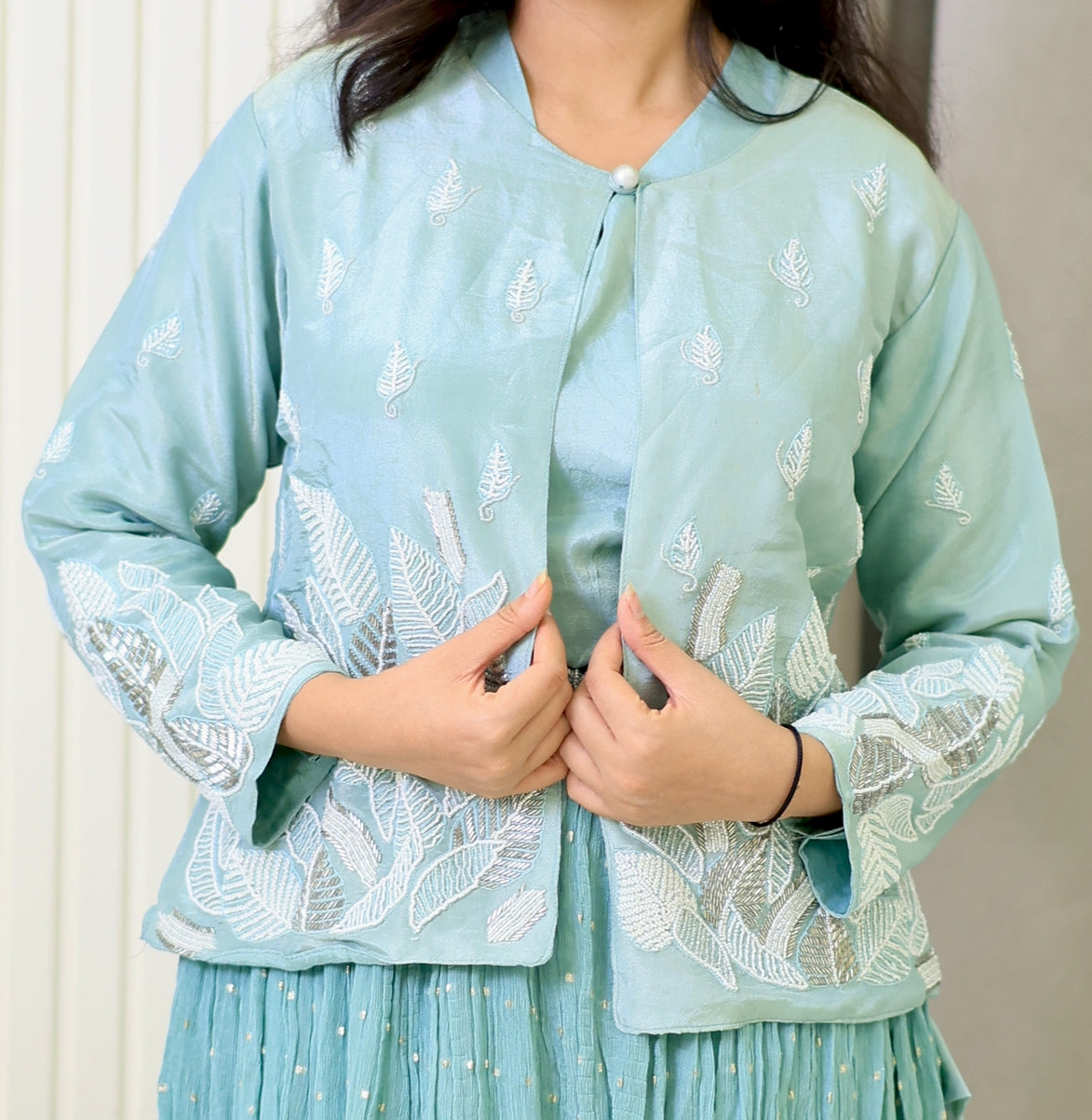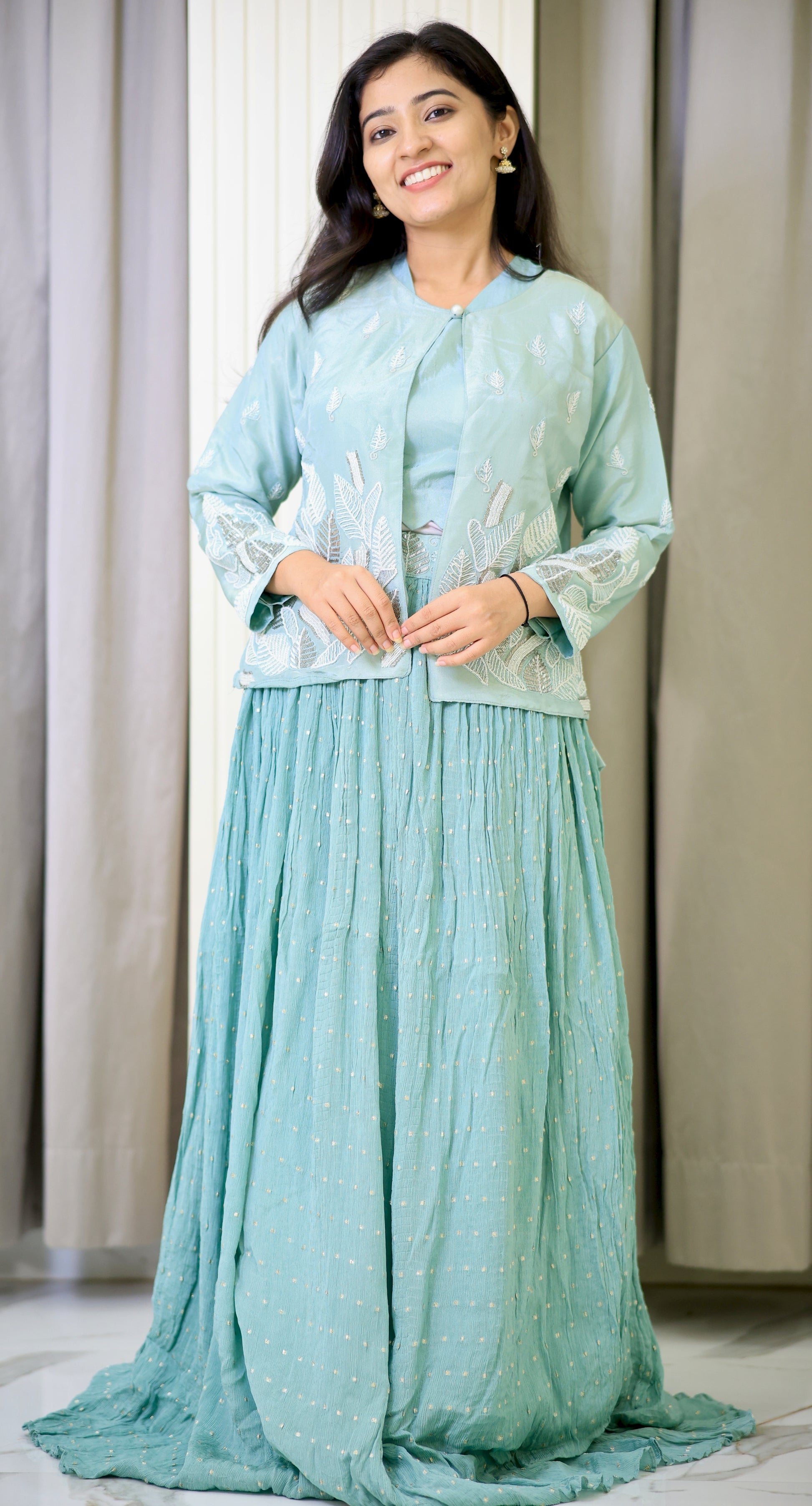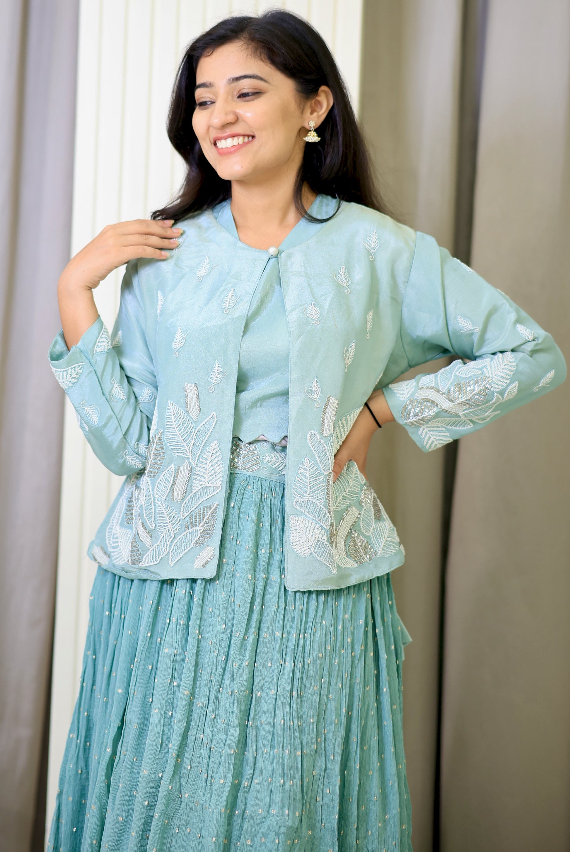 This green partywear crop top combines vibrant color with a stylish cut, perfect for making a confident statement at any event. Designed to offer a flattering fit, it pairs effortlessly with high-waisted skirts or trousers, enhancing your silhouette while ensuring comfort throughout the evening. Ideal for those seeking a chic and contemporary look, this crop top elevates your party wardrobe with its expert blend of fashion and function.