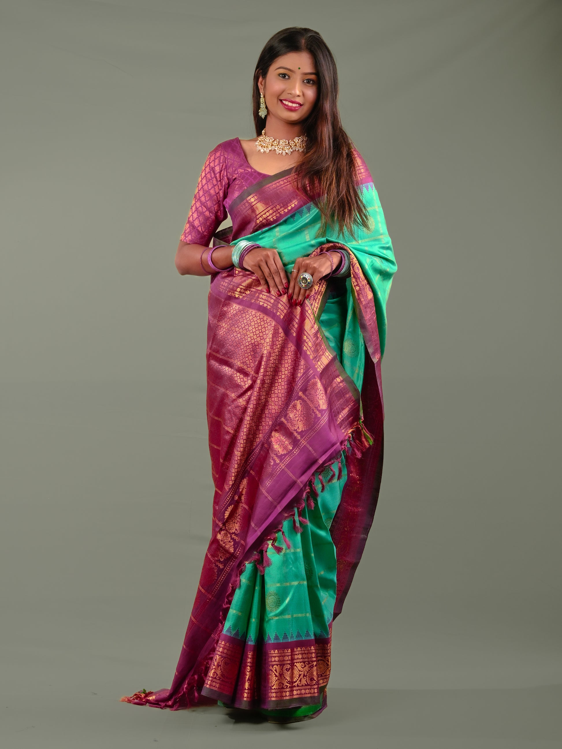Crafted with meticulous attention to detail, this exquisite Green Gadwal Silk Saree exemplifies traditional South Indian craftsmanship. Distinguished by its lightweight texture and characteristic contrast borders, this authentic handloom piece features intricate zari work that elevates its elegance. Perfect for special occasions while offering remarkable durability that withstands the test of time.