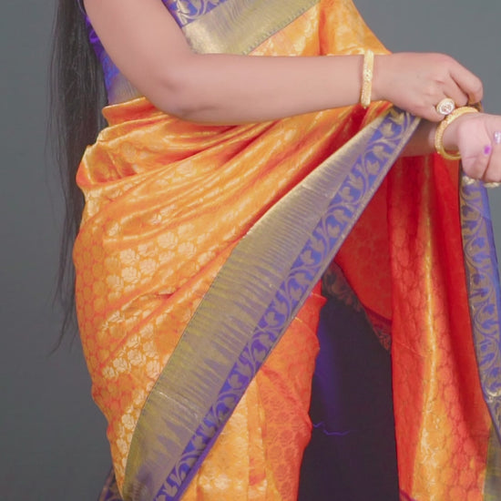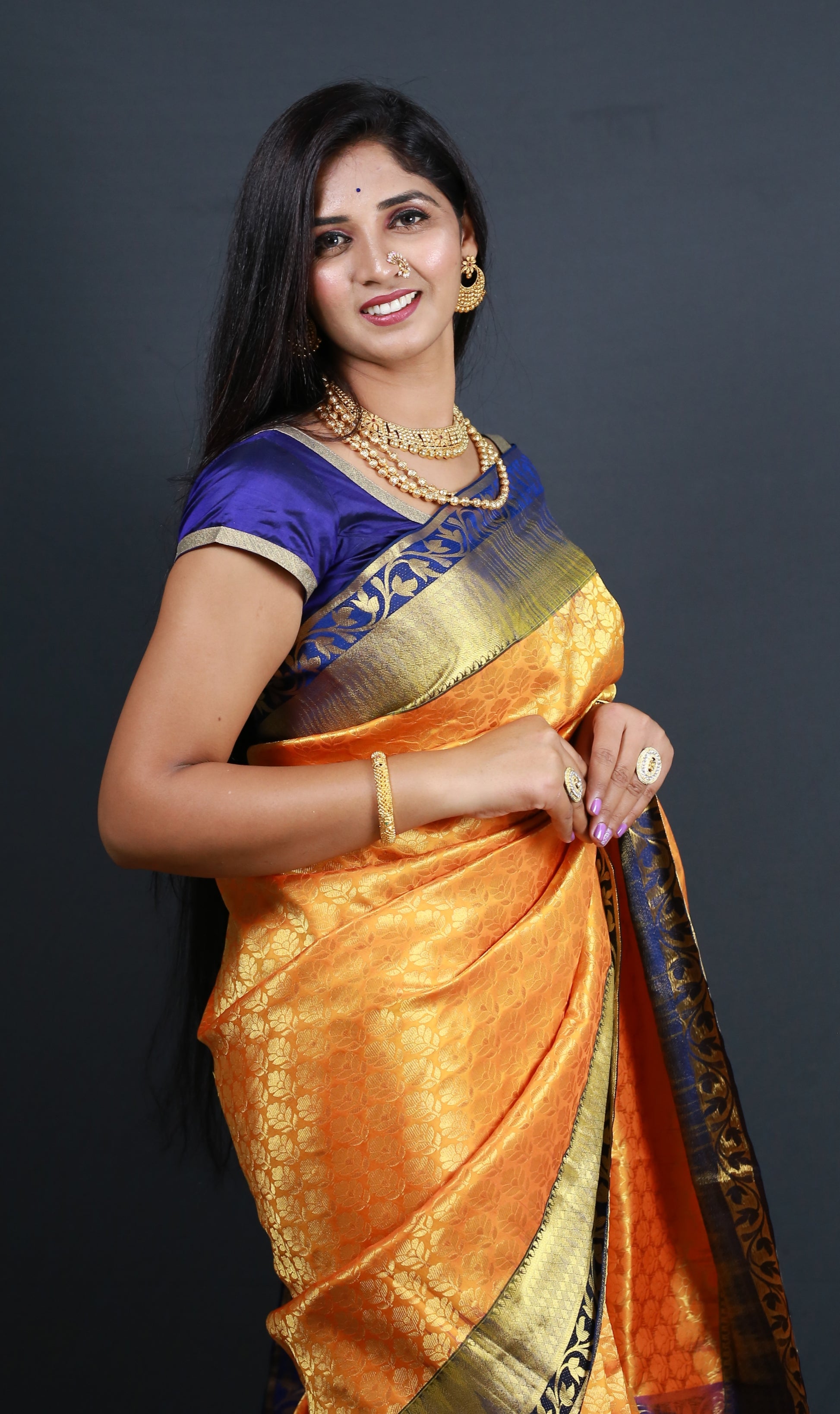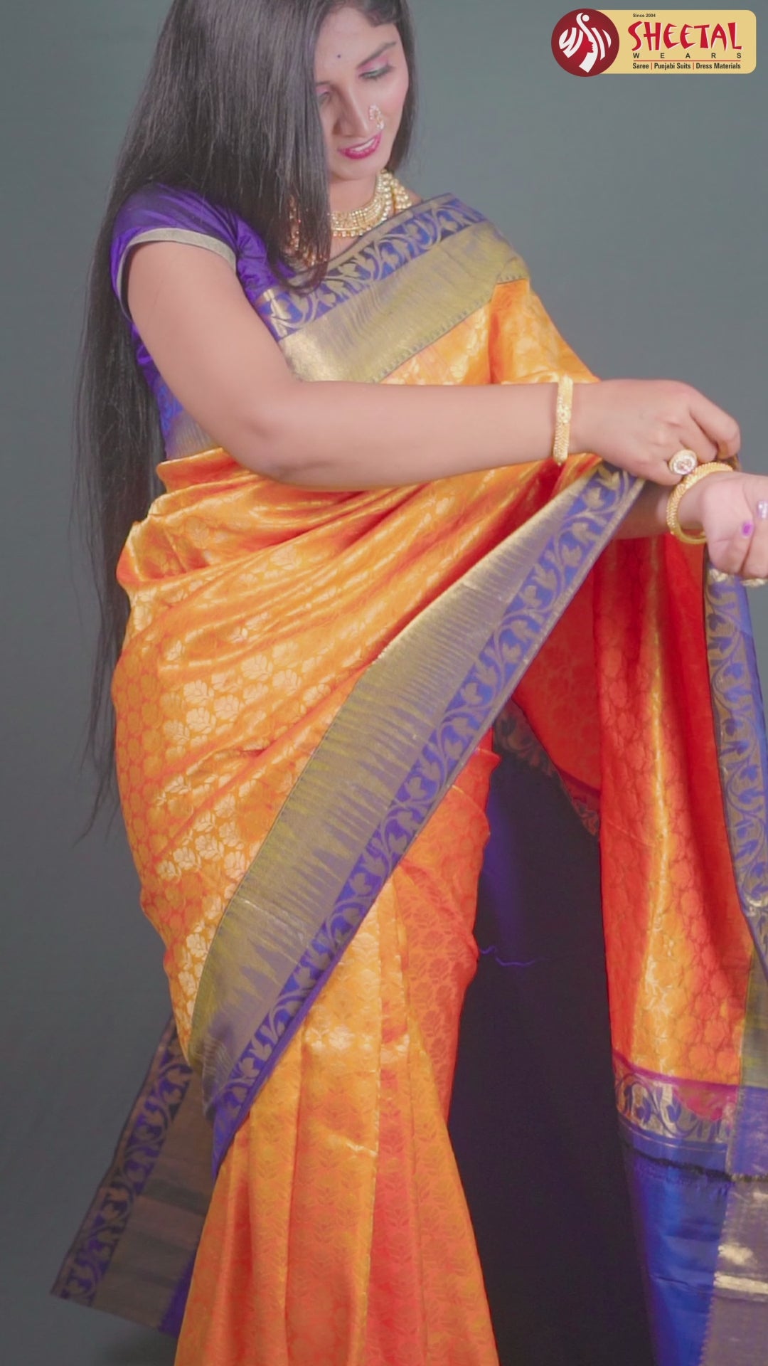 This yellow Gadwal silk saree features a striking contrast pallu, border, and blouse, highlighting its traditional elegance. Crafted with fine silk, it offers a lustrous texture and delicate craftsmanship synonymous with Gadwal heritage. Ideal for special occasions, this saree combines vibrant color with classic design, ensuring a graceful and sophisticated look.