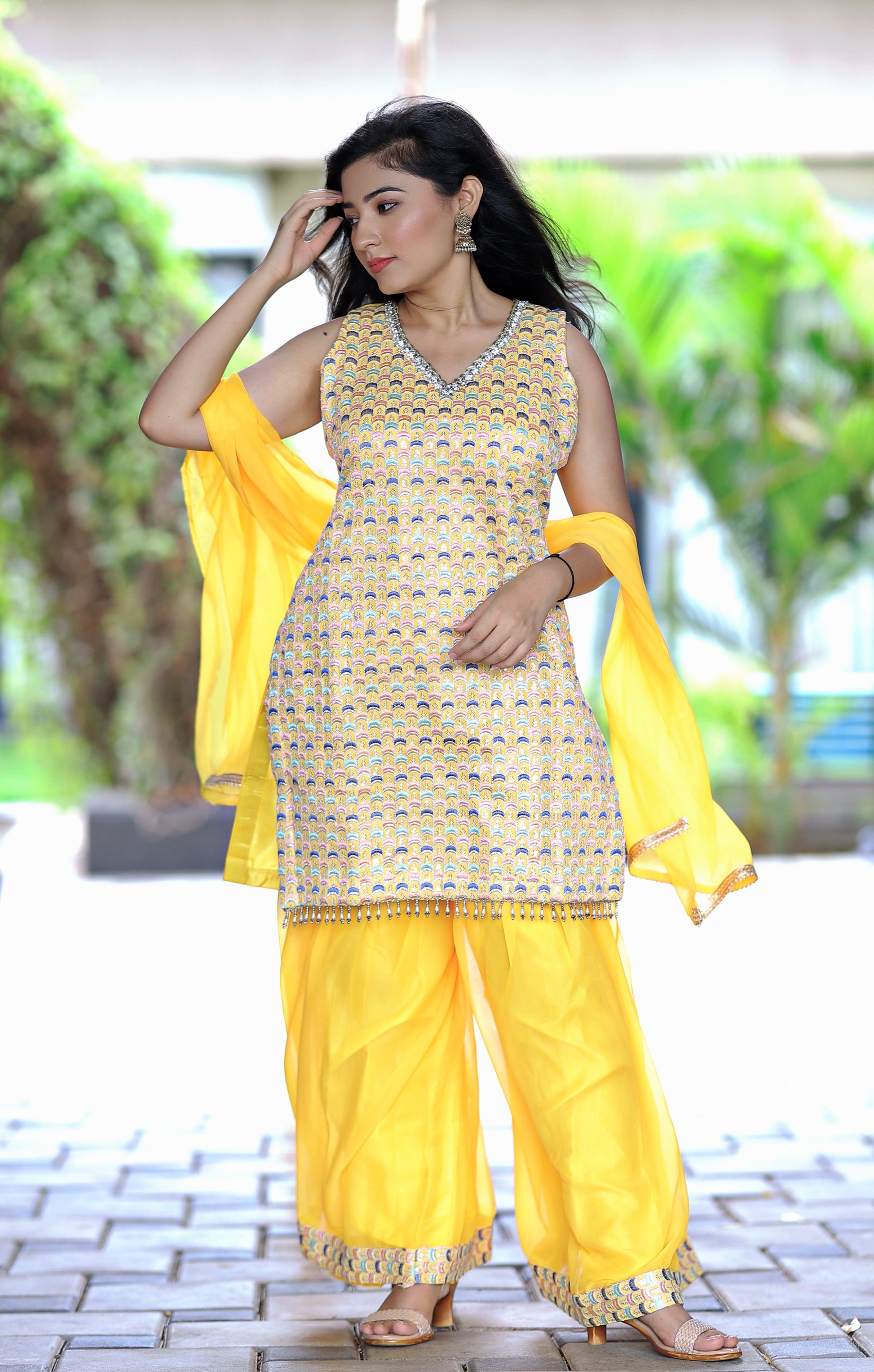 Elevate your festive wardrobe with this expert-crafted yellow Garara set, designed for partywear elegance. The vibrant yellow hue adds a cheerful yet sophisticated touch, while the traditional Garara silhouette ensures comfort and style. Perfect for celebrations, this set combines classic charm with contemporary appeal, making it an ideal choice for those seeking a refined ethnic look.