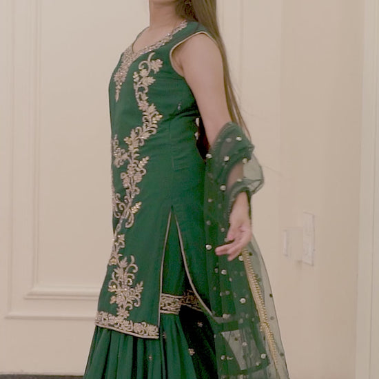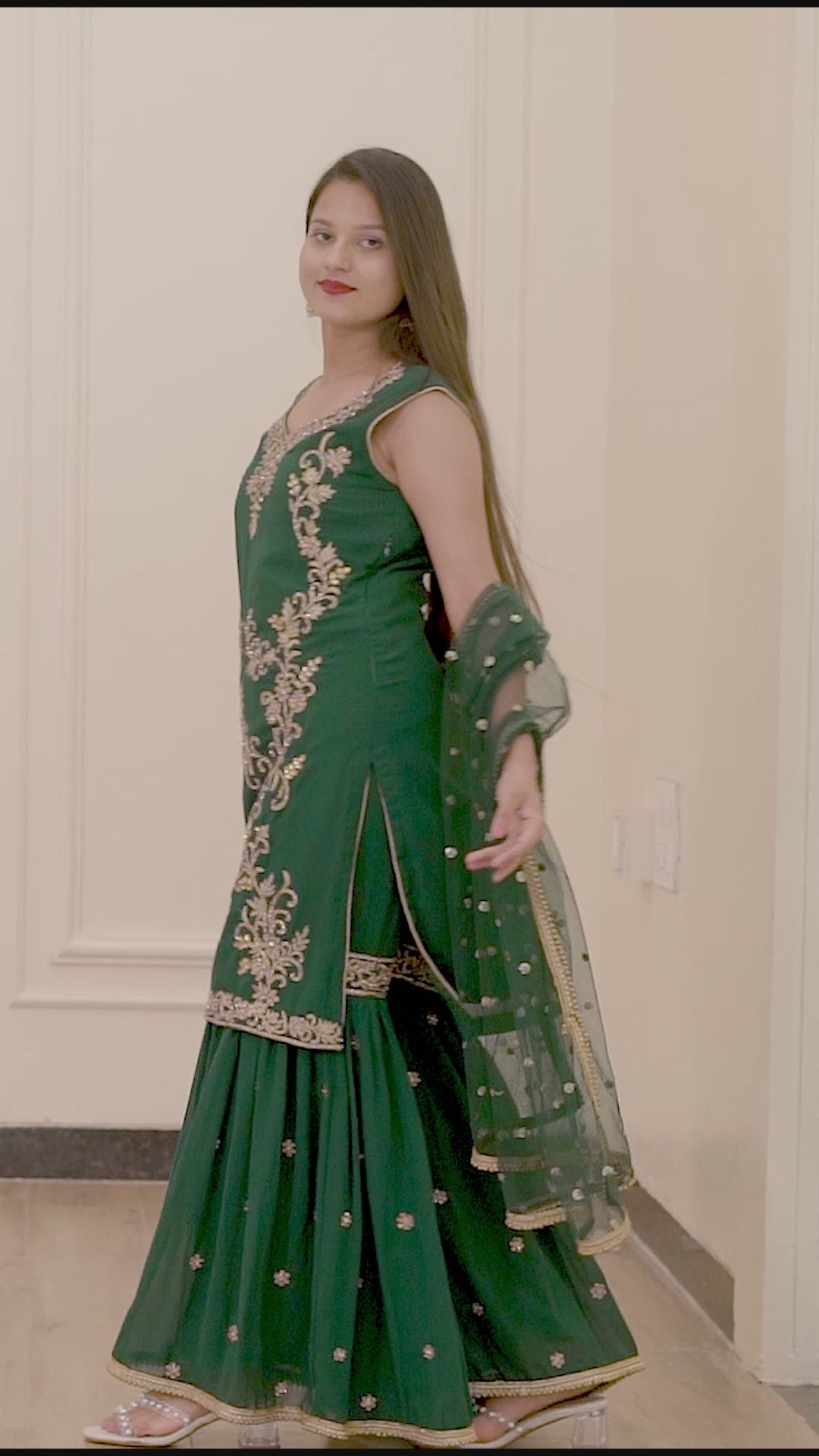 Elevate your festive wardrobe with this partywear bottle green Garara set. Expertly crafted, it features a rich bottle green hue that complements celebratory occasions. The flowing Garara pants paired with a matching top create a graceful silhouette, perfect for traditional events and parties. Designed for comfort and style, this set ensures you stand out with elegance and sophistication. Ideal for those seeking a blend of classic charm and contemporary fashion.