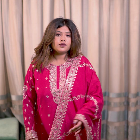 Elevate your ethnic wardrobe with this Rani Colour Garara Set, expertly crafted to blend traditional charm with contemporary style. The vibrant rani hue adds a regal touch, while the flowing garara pants ensure comfort and grace. Perfect for festive occasions and celebrations, this set offers a flattering silhouette that enhances your presence effortlessly. Experience the perfect balance of elegance and ease with this meticulously designed ensemble.