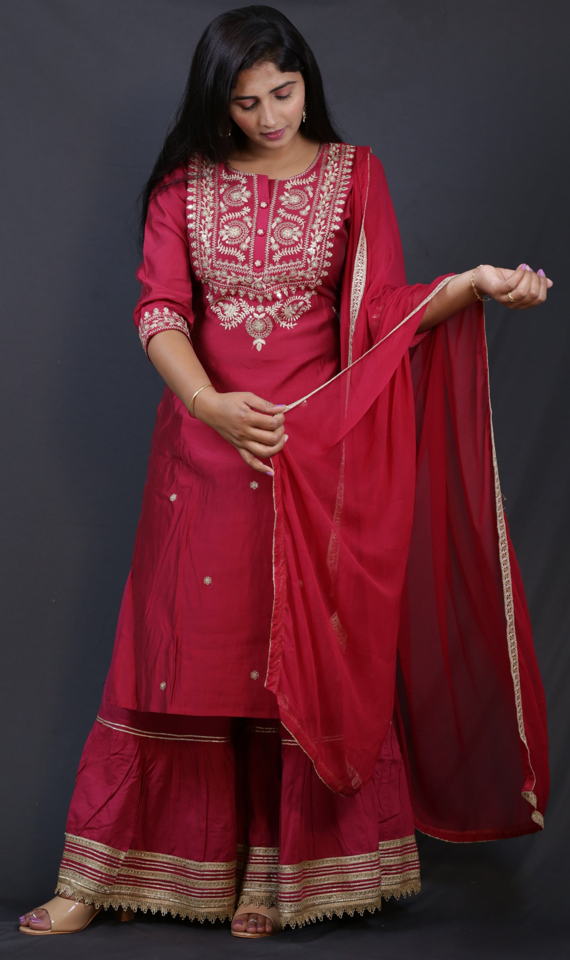 Elevate your ethnic wardrobe with this expertly crafted Rani colour Garara set. Designed for a perfect blend of traditional elegance and contemporary style, this ensemble features rich hues and intricate detailing. The comfortable fabric ensures ease of wear, while the flowing Garara adds grace to your silhouette. Ideal for festive occasions and celebrations, this set promises both style and comfort in one exquisite package.