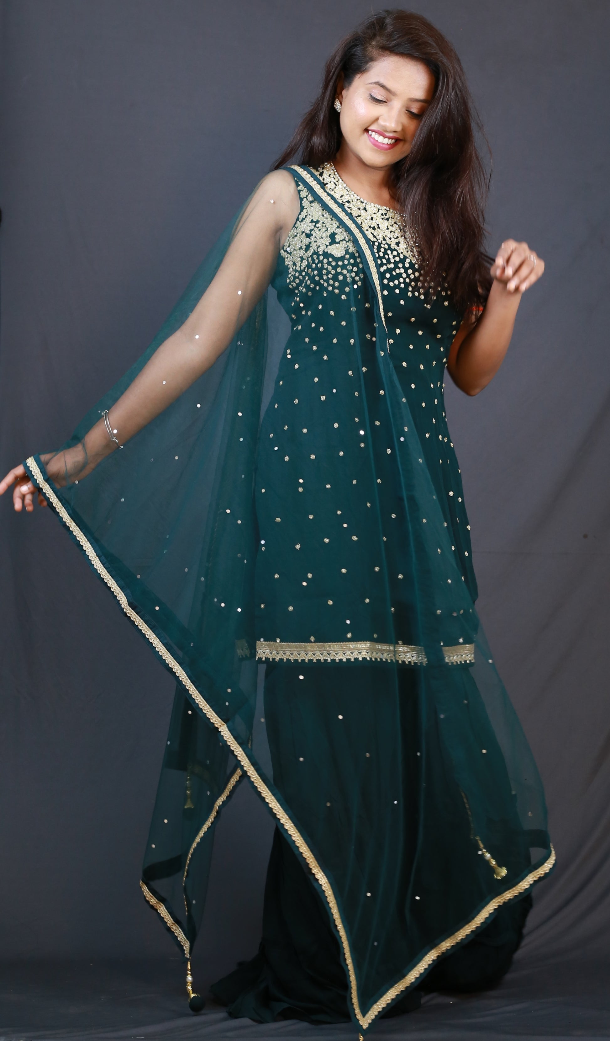 Elevate your ethnic wardrobe with this bottle green Garara set, expertly crafted for a refined and traditional look. The rich color combined with the graceful silhouette offers both comfort and elegance, making it perfect for festive occasions and formal gatherings. Designed to enhance your presence effortlessly, this set merges timeless style with contemporary appeal.