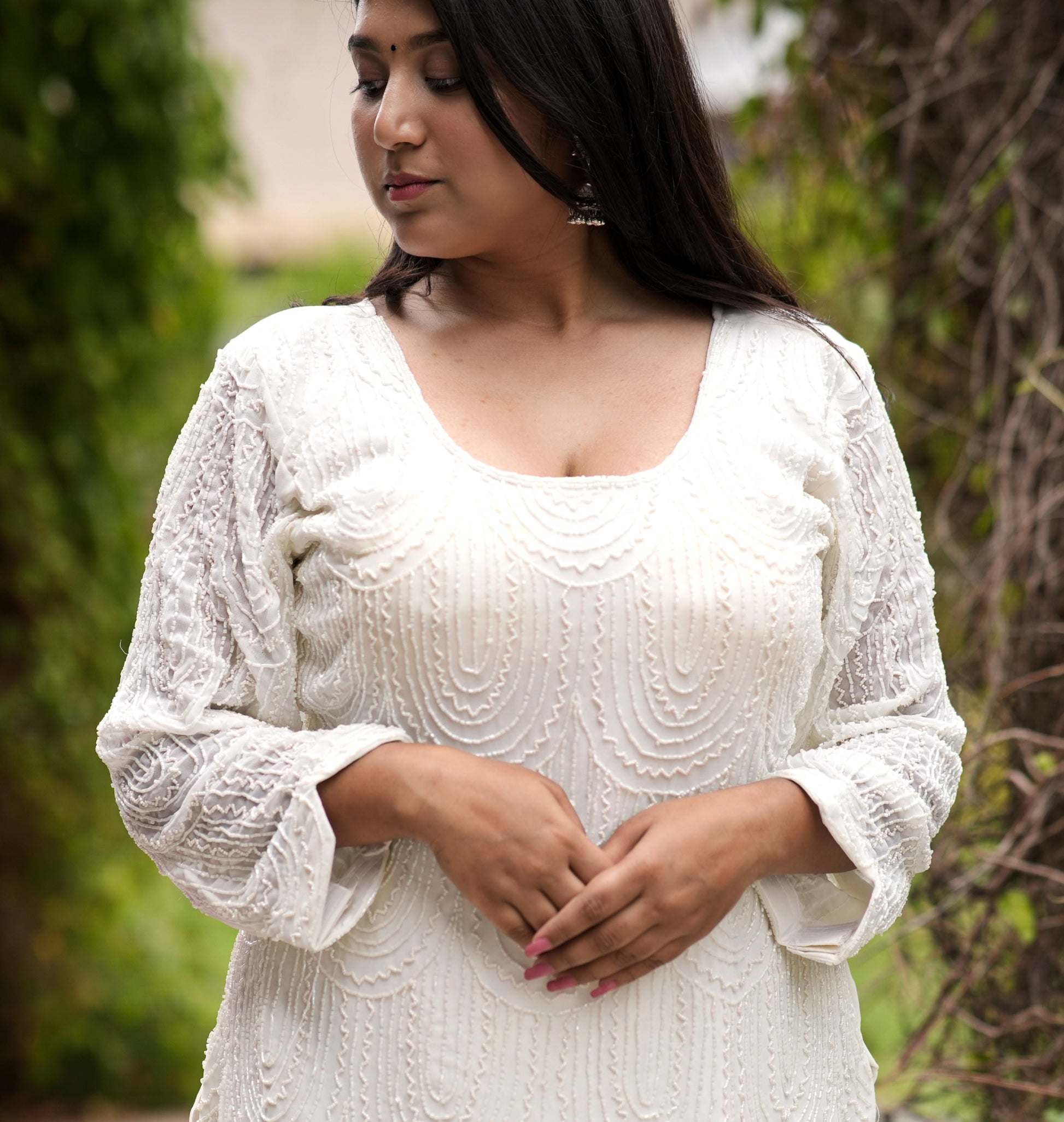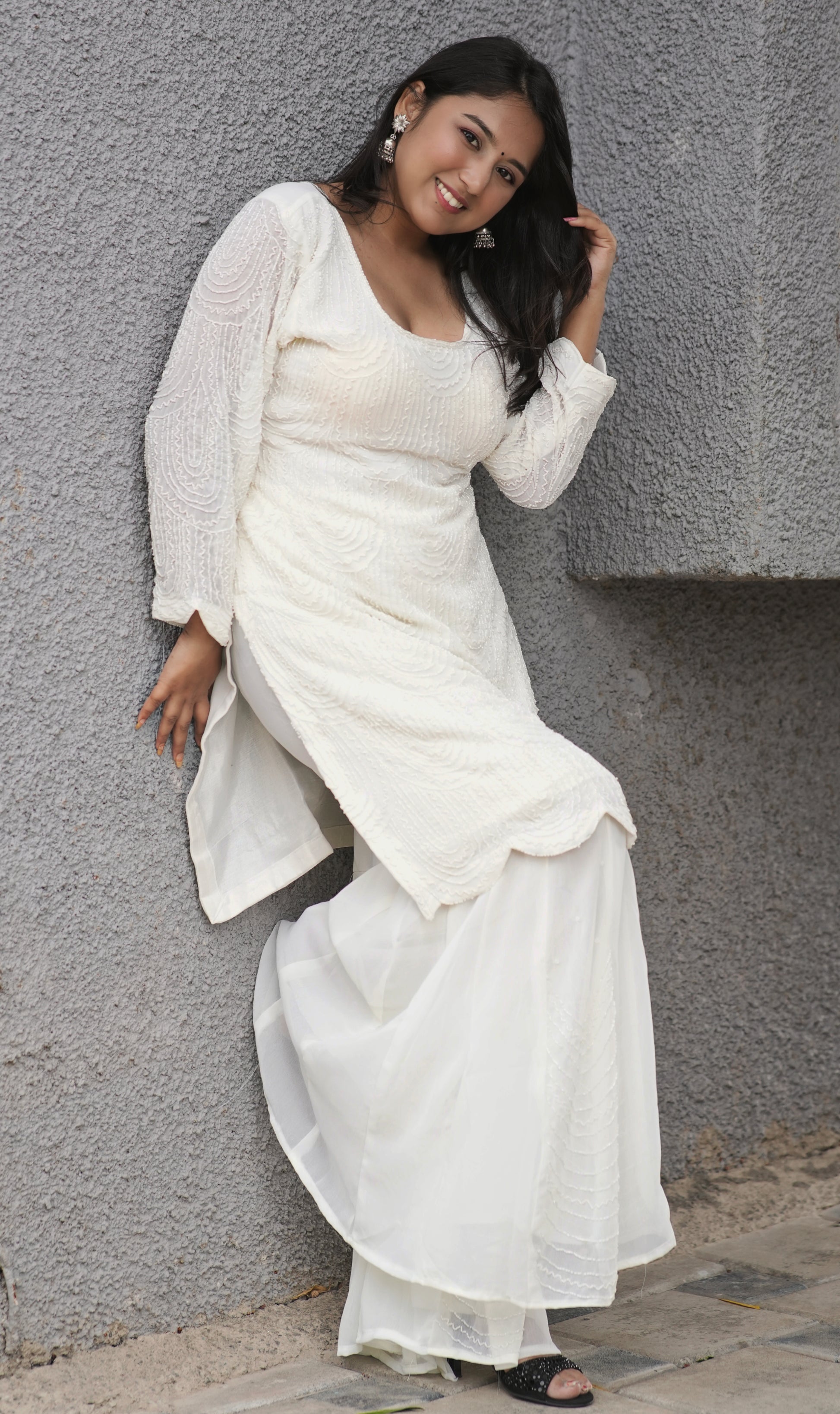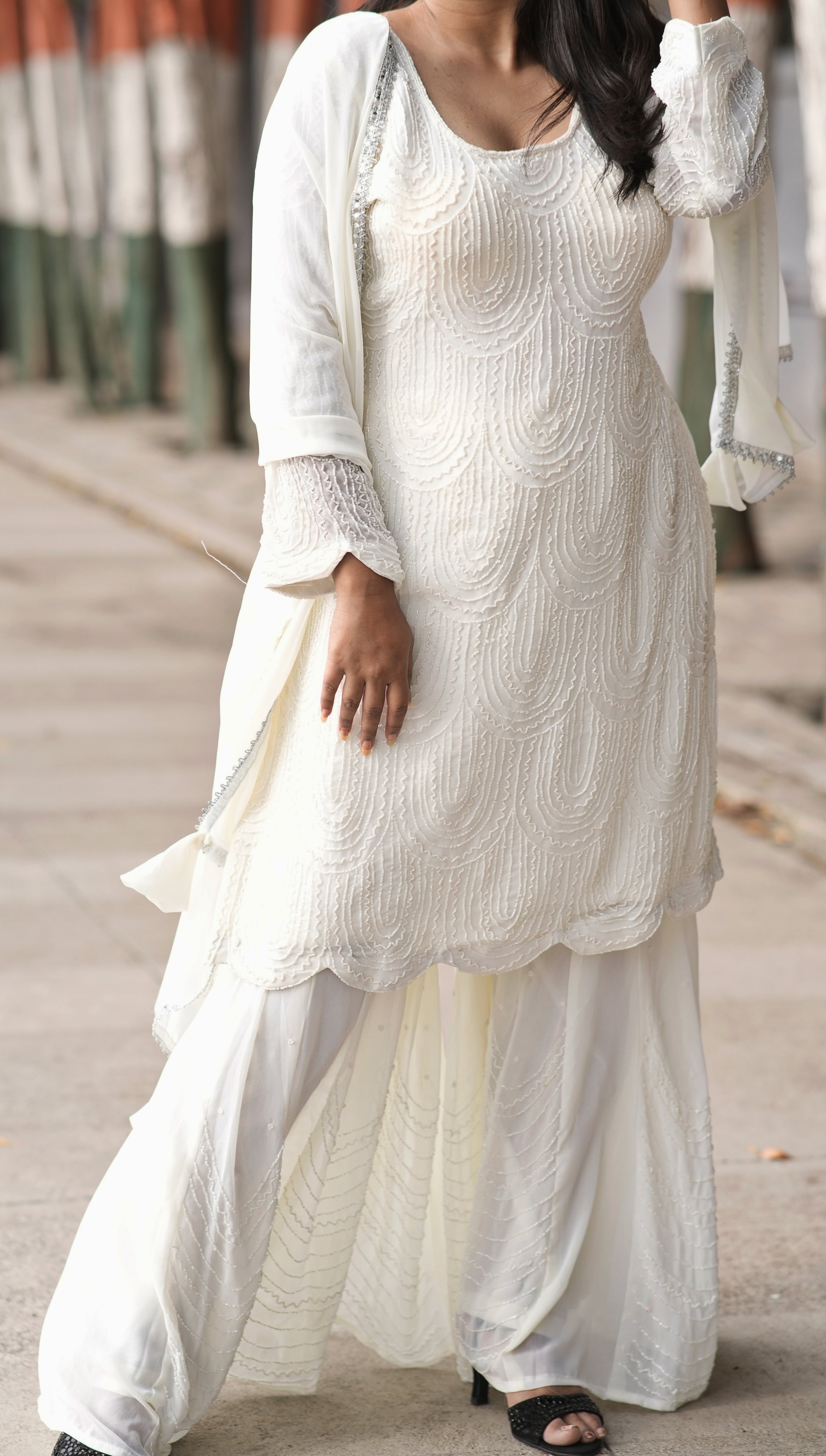 Elevate your festive wardrobe with this elegant cream-coloured Garara set, expertly crafted for a perfect blend of tradition and style. The set features a beautifully tailored Garara paired with a complementary top, designed to offer comfort and a flattering silhouette. Ideal for parties and special occasions, this ensemble ensures you stand out with its subtle sophistication and timeless appeal.