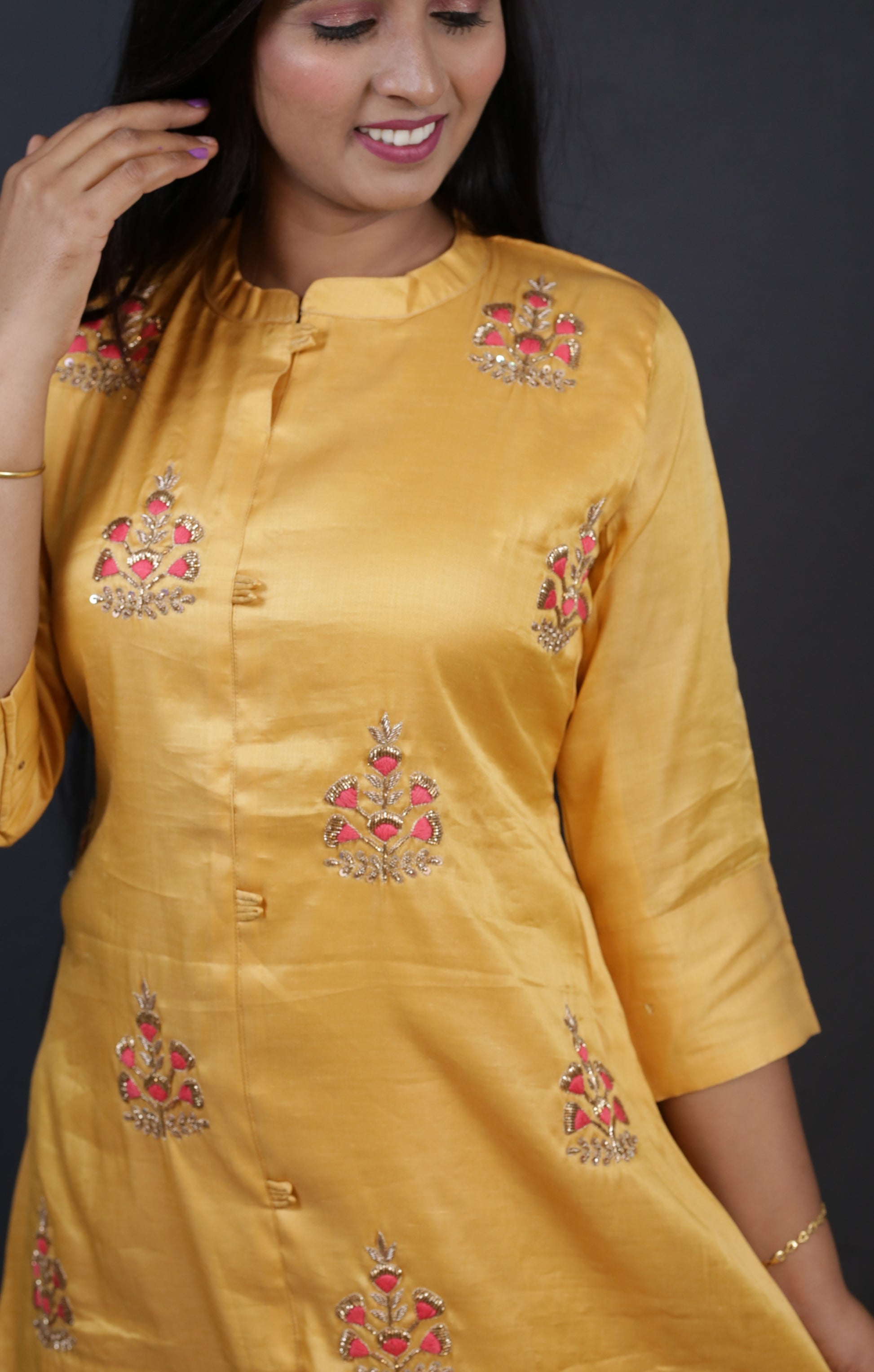 This mustard-colored long gown kurti blends traditional elegance with modern style. Crafted for a flattering fit, its rich hue enhances any skin tone while offering comfort for all-day wear. Perfect for festive occasions or casual gatherings, it brings a sophisticated charm that pairs well with a variety of accessories and footwear.