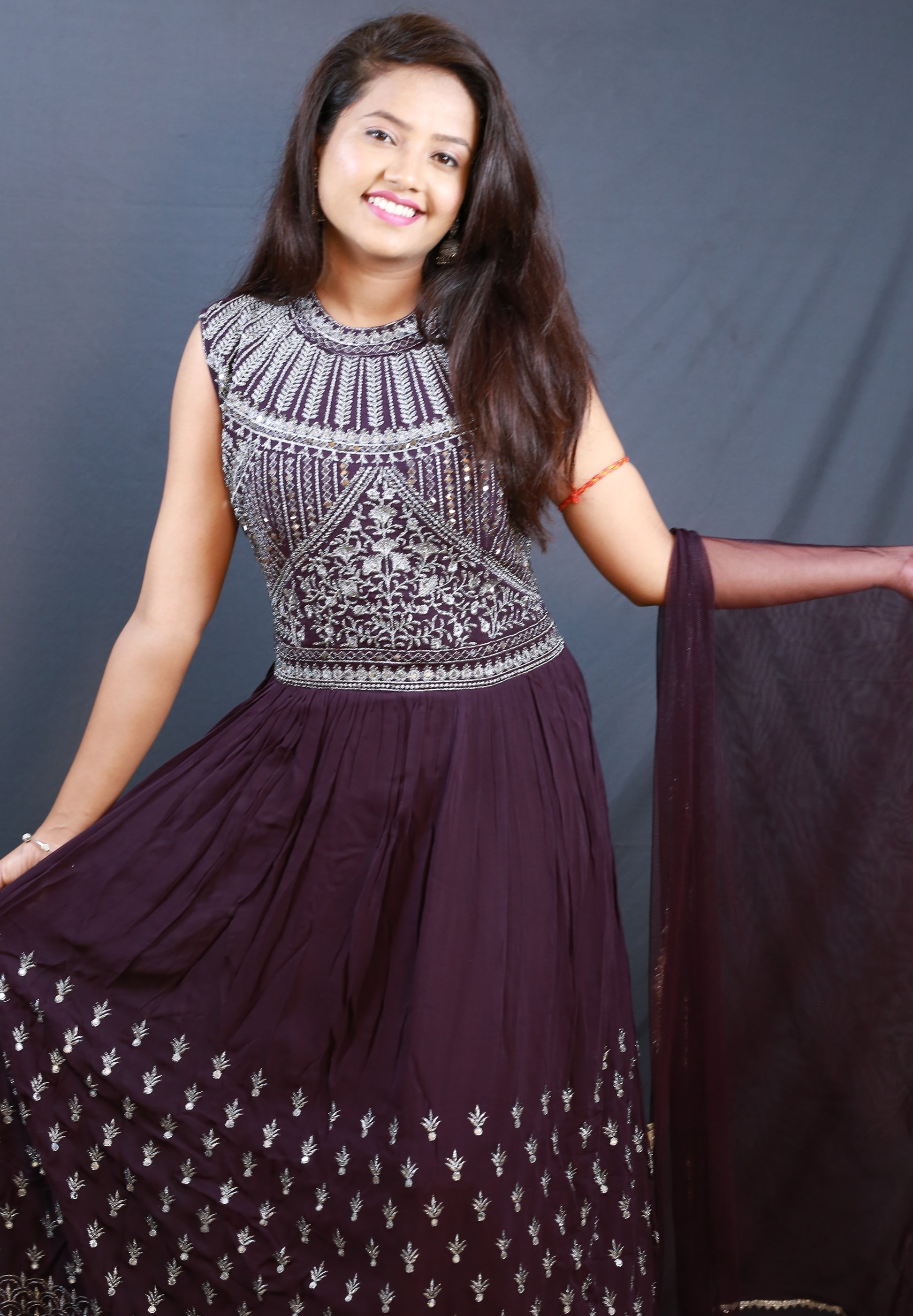 Elevate your evening look with this wine-colored partywear gown. Designed for a sophisticated silhouette, it blends rich hues with a flattering fit to enhance your presence at any event. Crafted to provide comfort alongside style, this gown ensures you feel as confident as you look throughout the celebration. Perfect for formal occasions, it pairs seamlessly with elegant accessories to complete a refined ensemble.