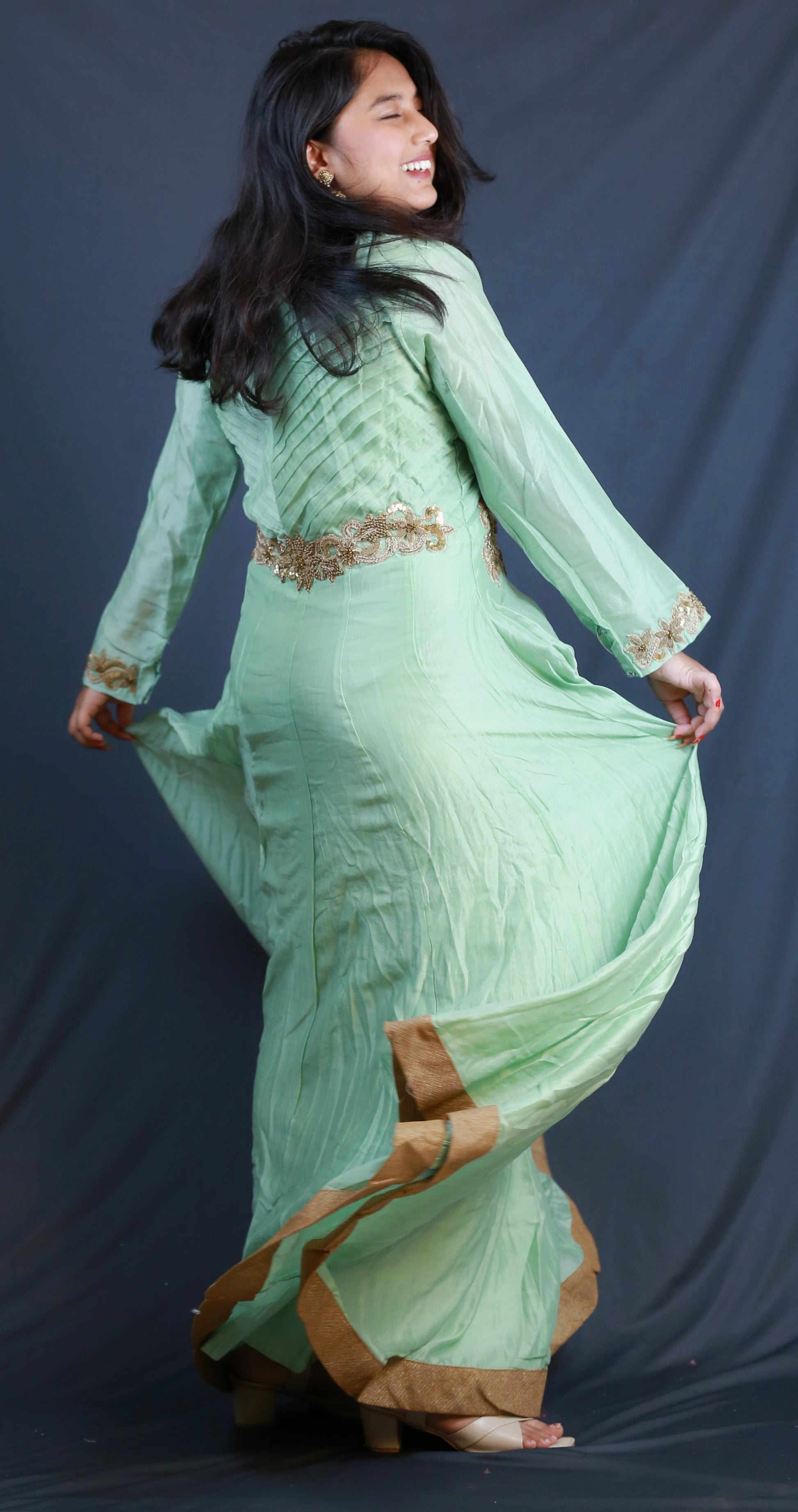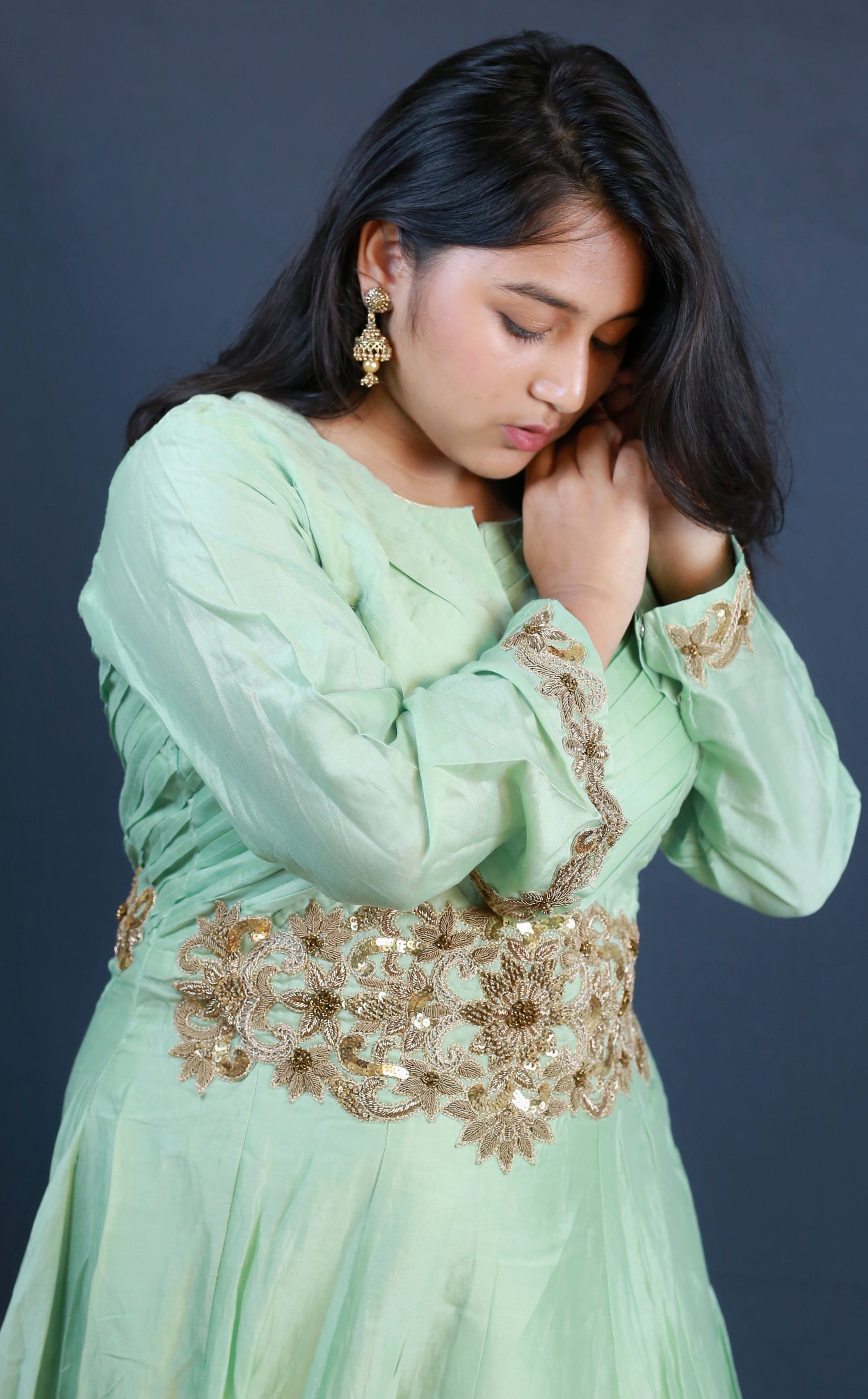 This pistachio-colored gown, crafted from premium Chanderi silk, combines traditional elegance with contemporary style. Its lightweight, breathable fabric ensures comfort, while the subtle sheen of silk adds a refined sophistication perfect for festive occasions or formal events. The gown’s fluid drape enhances silhouette grace, making it a versatile addition to any wardrobe seeking quality and timeless charm.