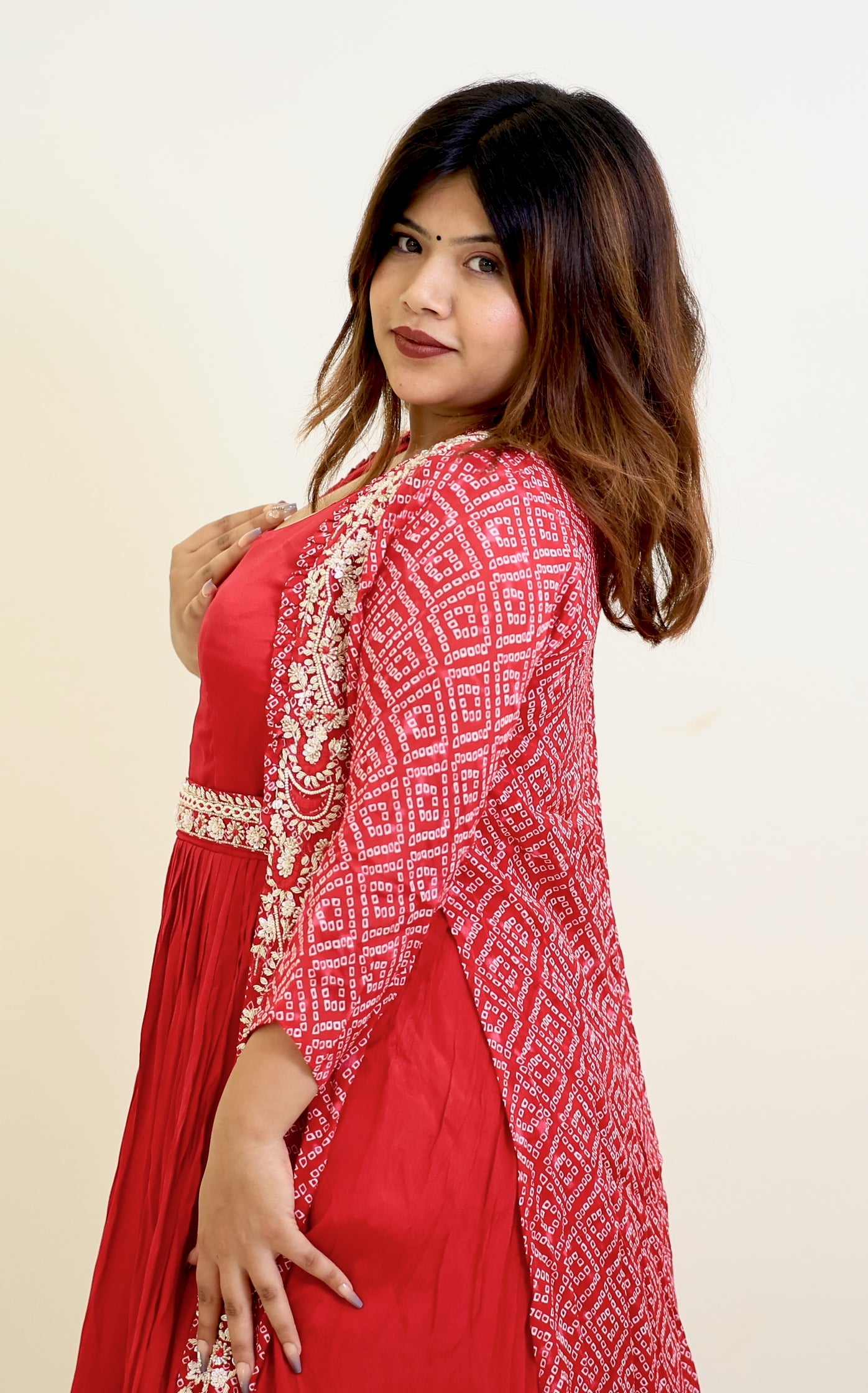 This elegant gown in a rich rani color is paired with a long shrug, offering a graceful and sophisticated ensemble. The combination enhances your silhouette while providing comfortable coverage, making it ideal for formal occasions or festive events. Crafted to balance style and ease, this set ensures you look polished with minimal effort.
