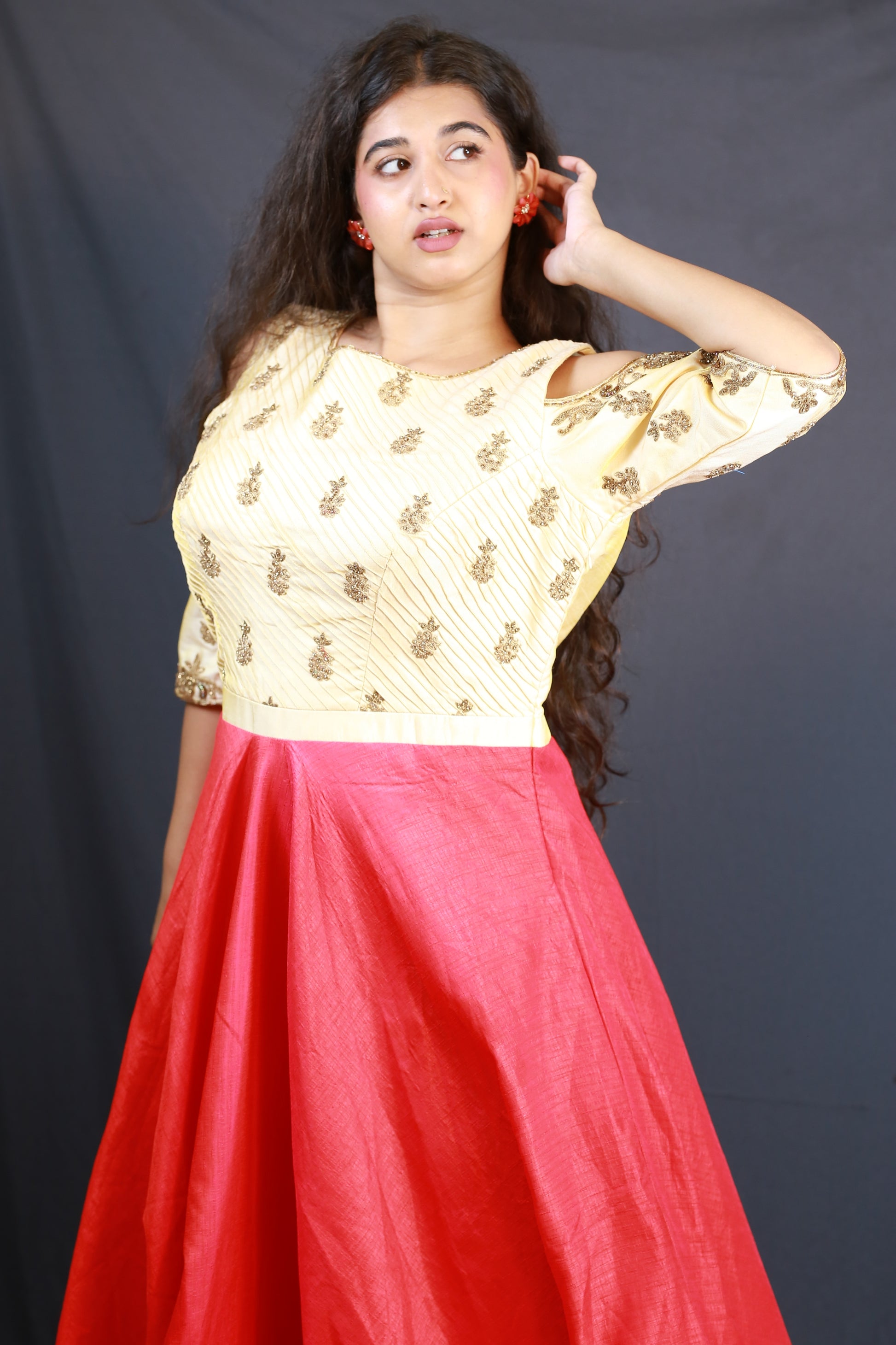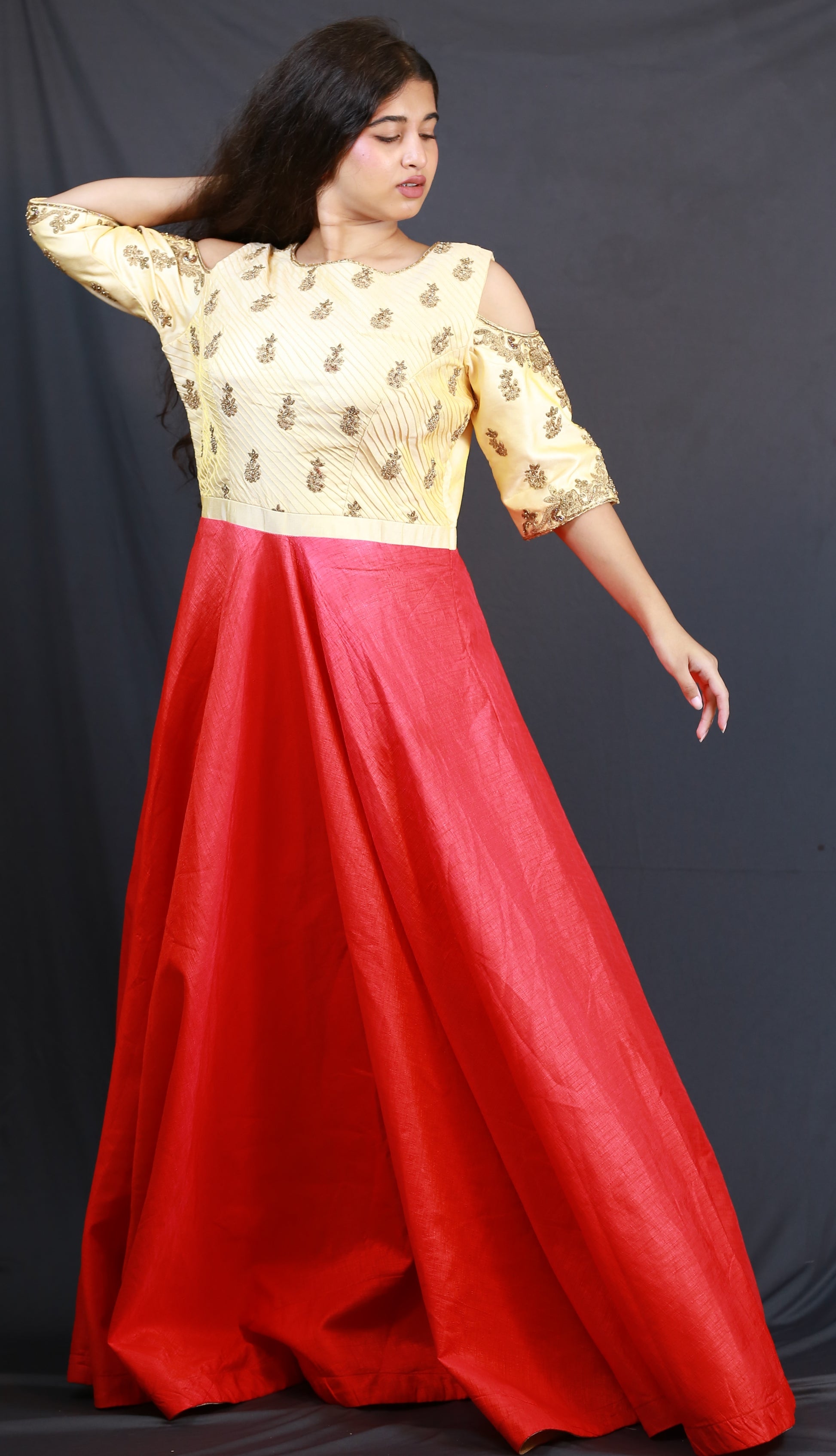This Fawn and Rani combination silk gown offers a refined blend of elegance and comfort. Crafted from high-quality silk, its dual-tone design enhances its luxurious appeal, making it ideal for formal occasions and celebrations. The gown’s smooth texture and flattering silhouette ensure a graceful fit and sophisticated presence. Perfect for those who appreciate expert craftsmanship and timeless style.