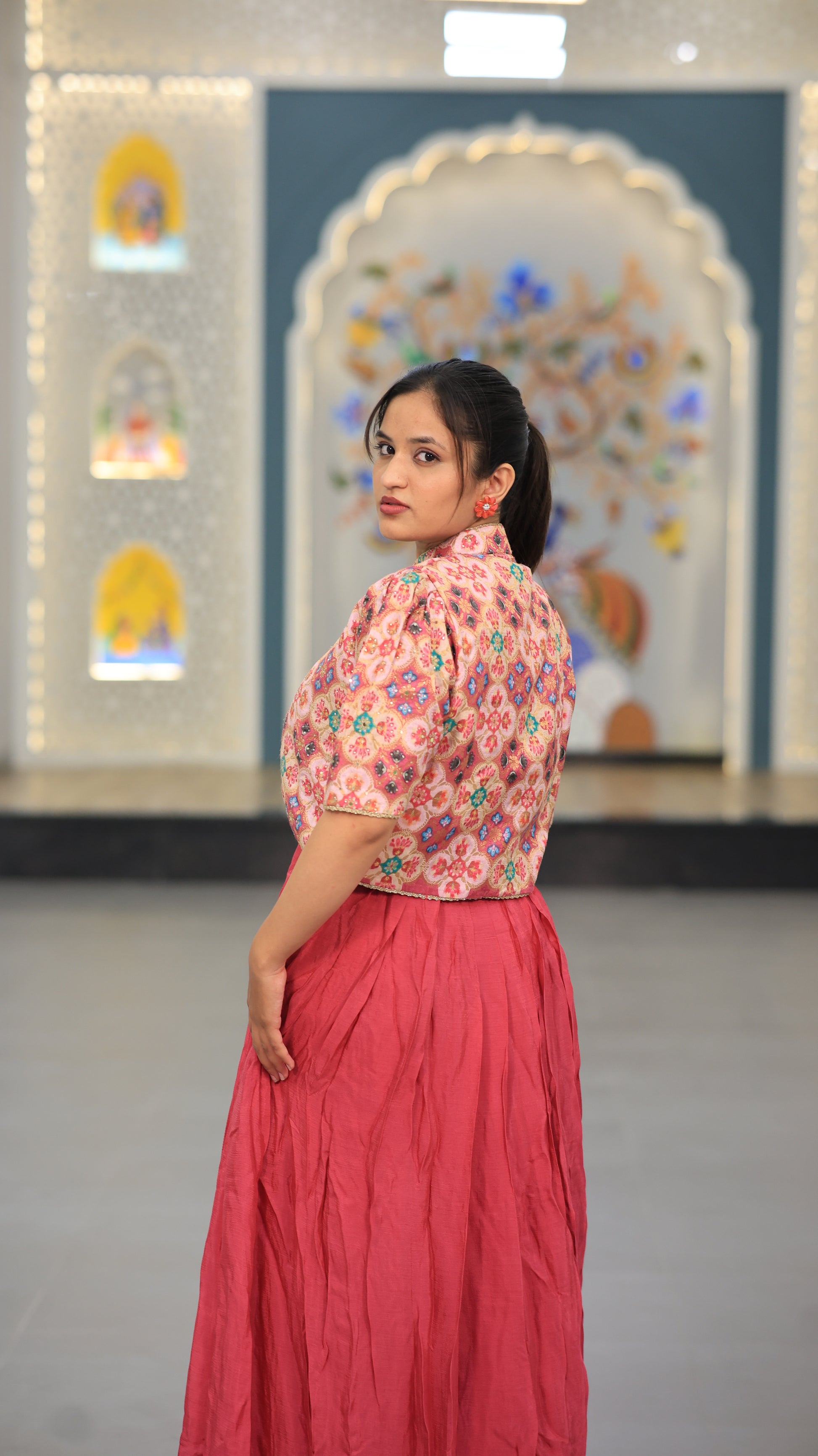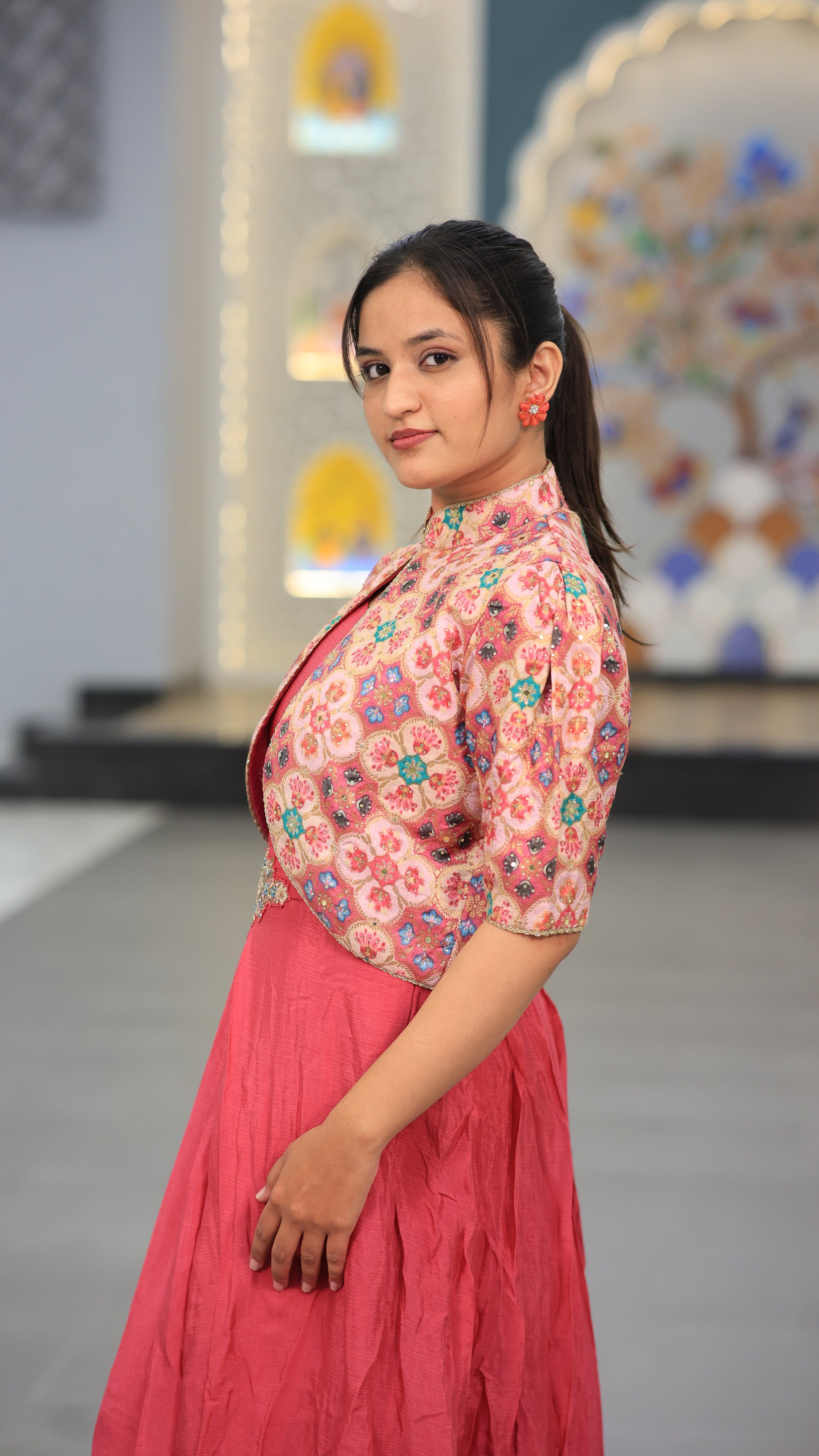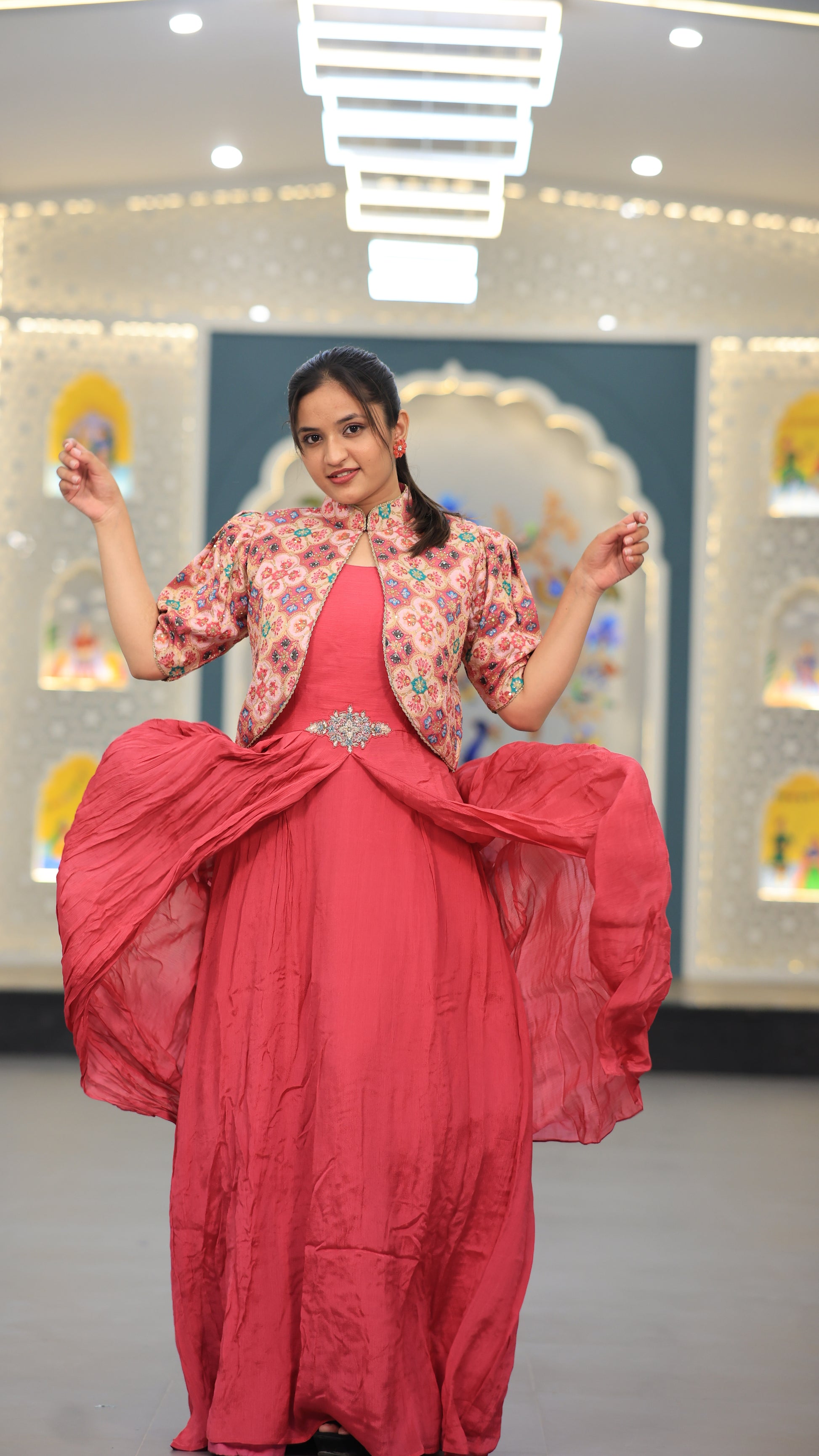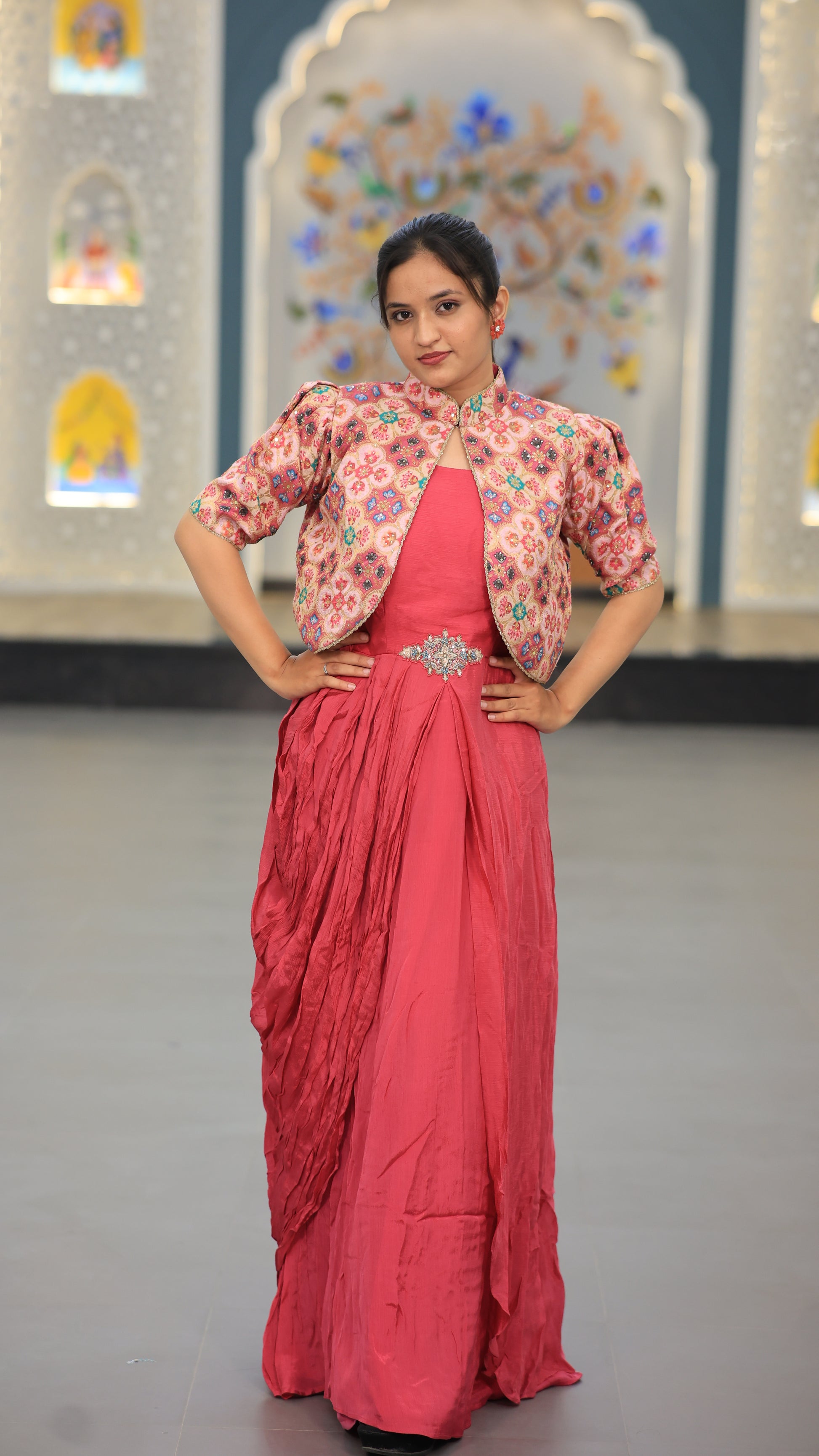 This light rani-colored gown combines elegance with subtle vibrancy, perfect for formal occasions. Crafted to offer a flattering silhouette, it enhances your presence with its soft hue and graceful flow. Ideal for those seeking a refined yet eye-catching outfit, this gown balances comfort and style effortlessly.
