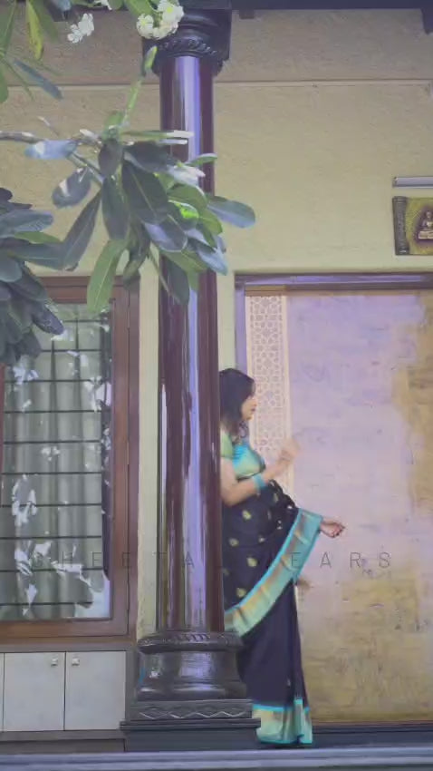 This pure silk saree in black with teal and gold detailing offers unmatched elegance. A regal blend of tradition and style for modern Indian women.