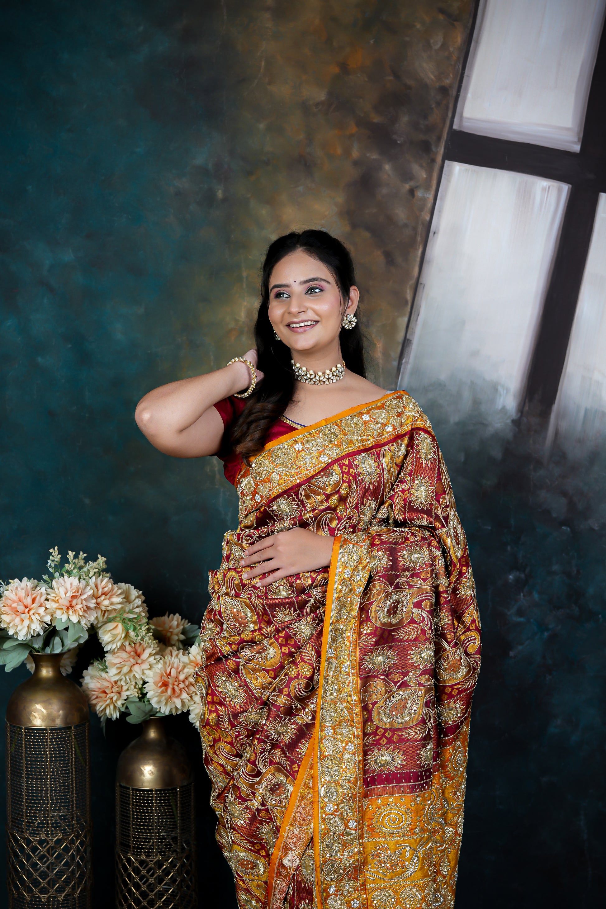 Elevate your wardrobe with this maroon handloom silk saree, showcasing exquisite handwork craftsmanship. The rich silk fabric offers a smooth, lustrous finish, while meticulous handwoven details add distinct texture and elegance. Perfect for special occasions, this saree combines traditional artistry with luxurious comfort, making it a timeless addition to any collection.