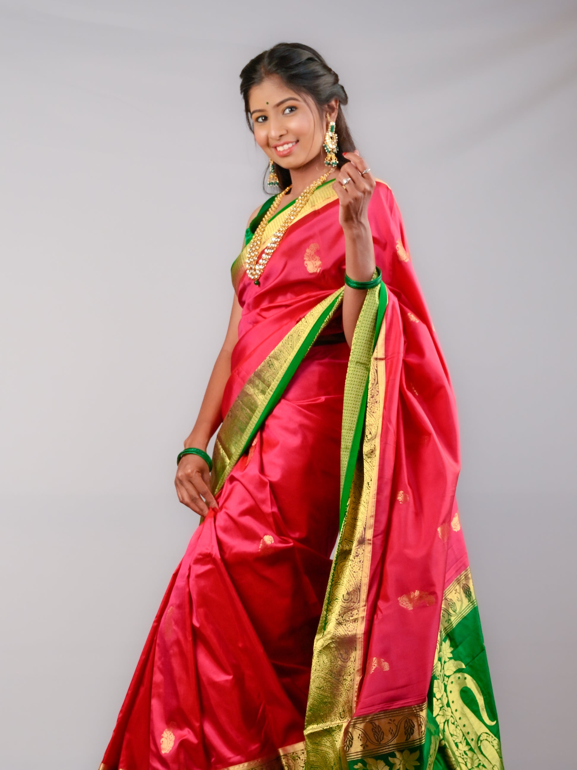 Crafted with meticulous attention to detail, this authentic Handloom Silk Saree exemplifies traditional artisanship. The luxurious silk fabric offers a distinctive sheen and exceptional drape, while the handwoven texture ensures durability and timeless elegance. Perfect for special occasions, this saree combines heritage craftsmanship with sophisticated style.