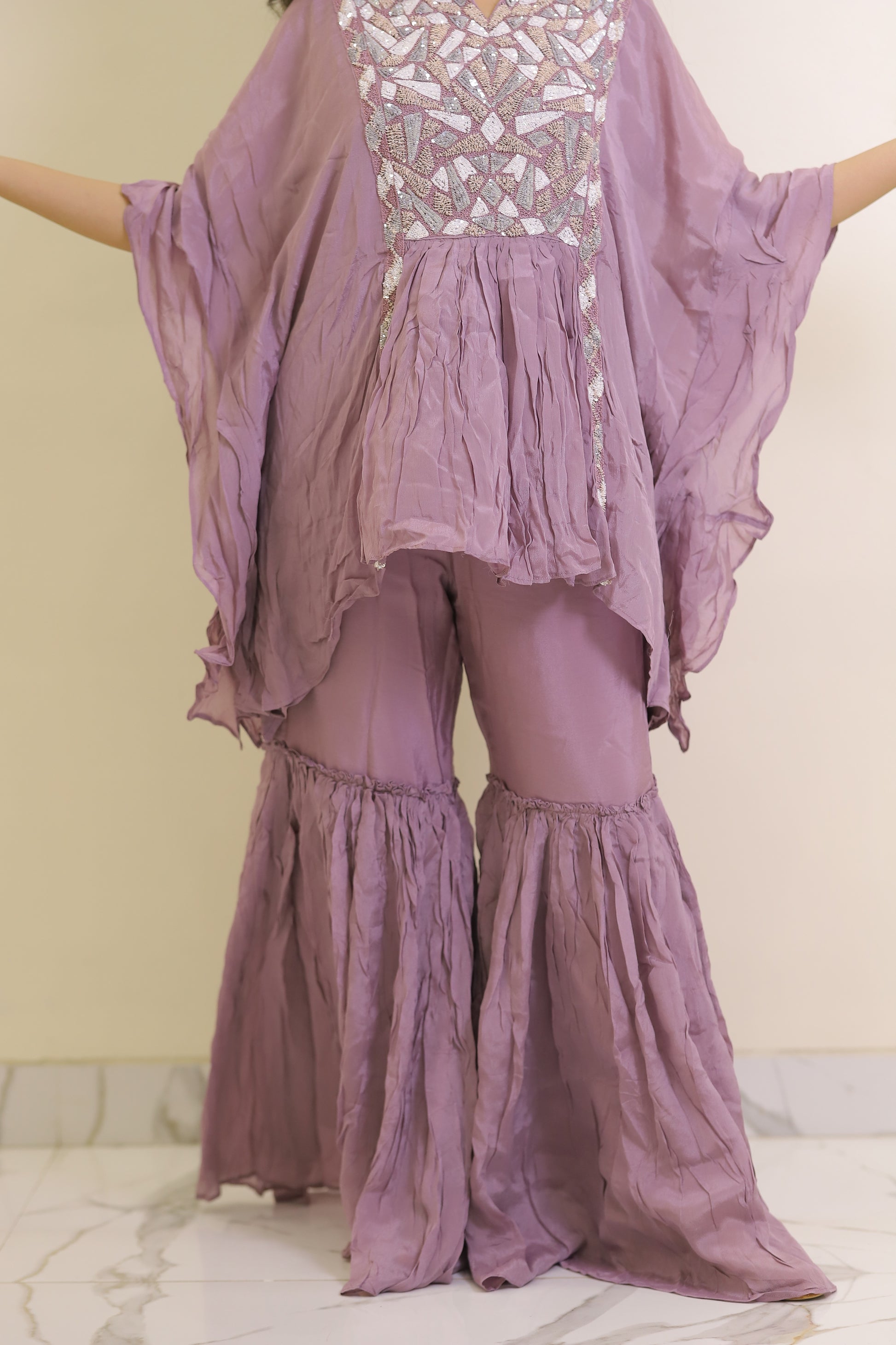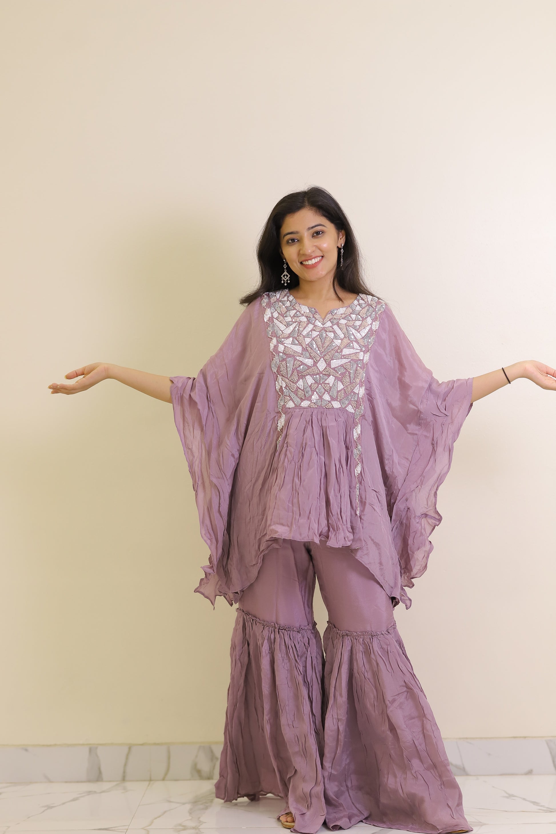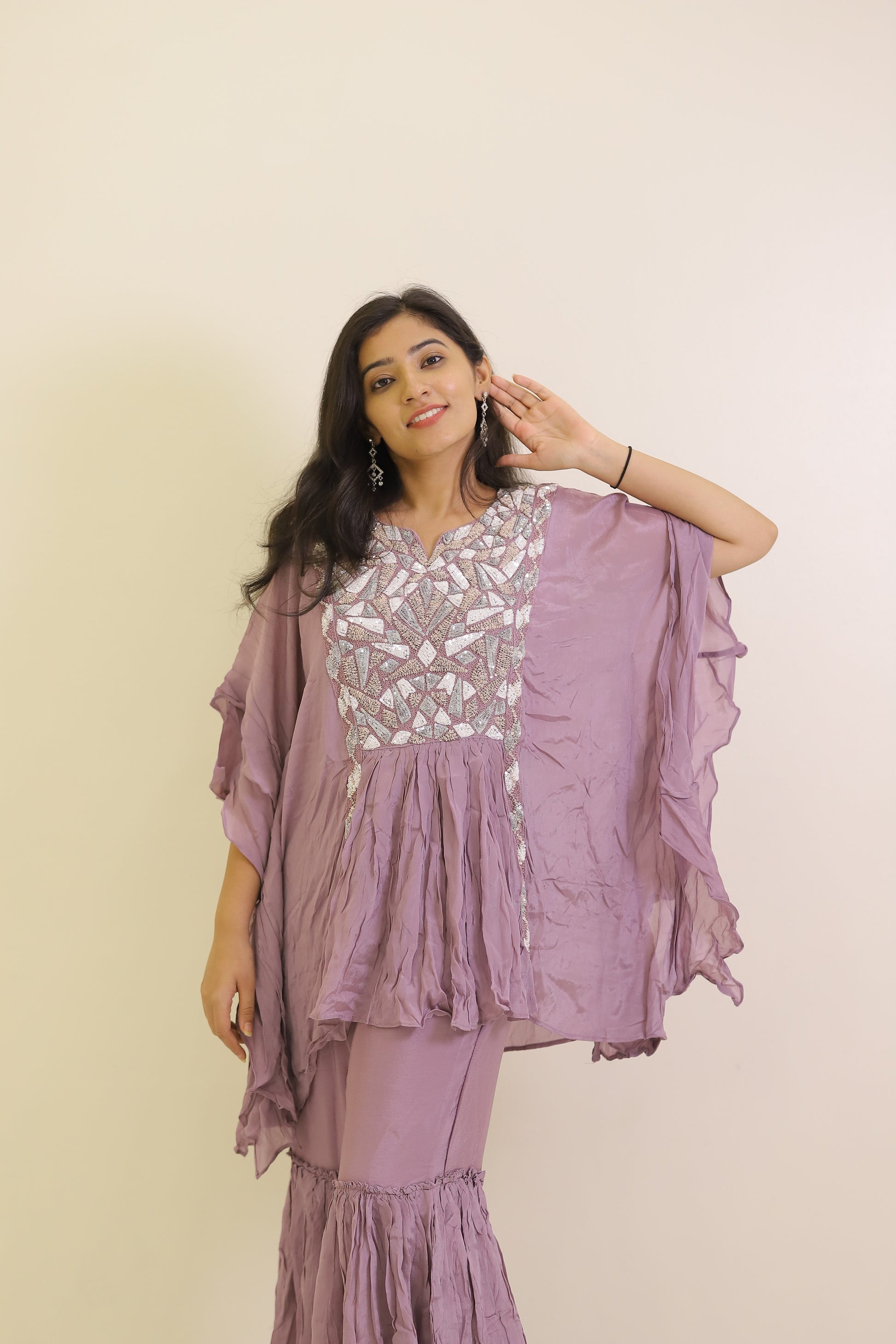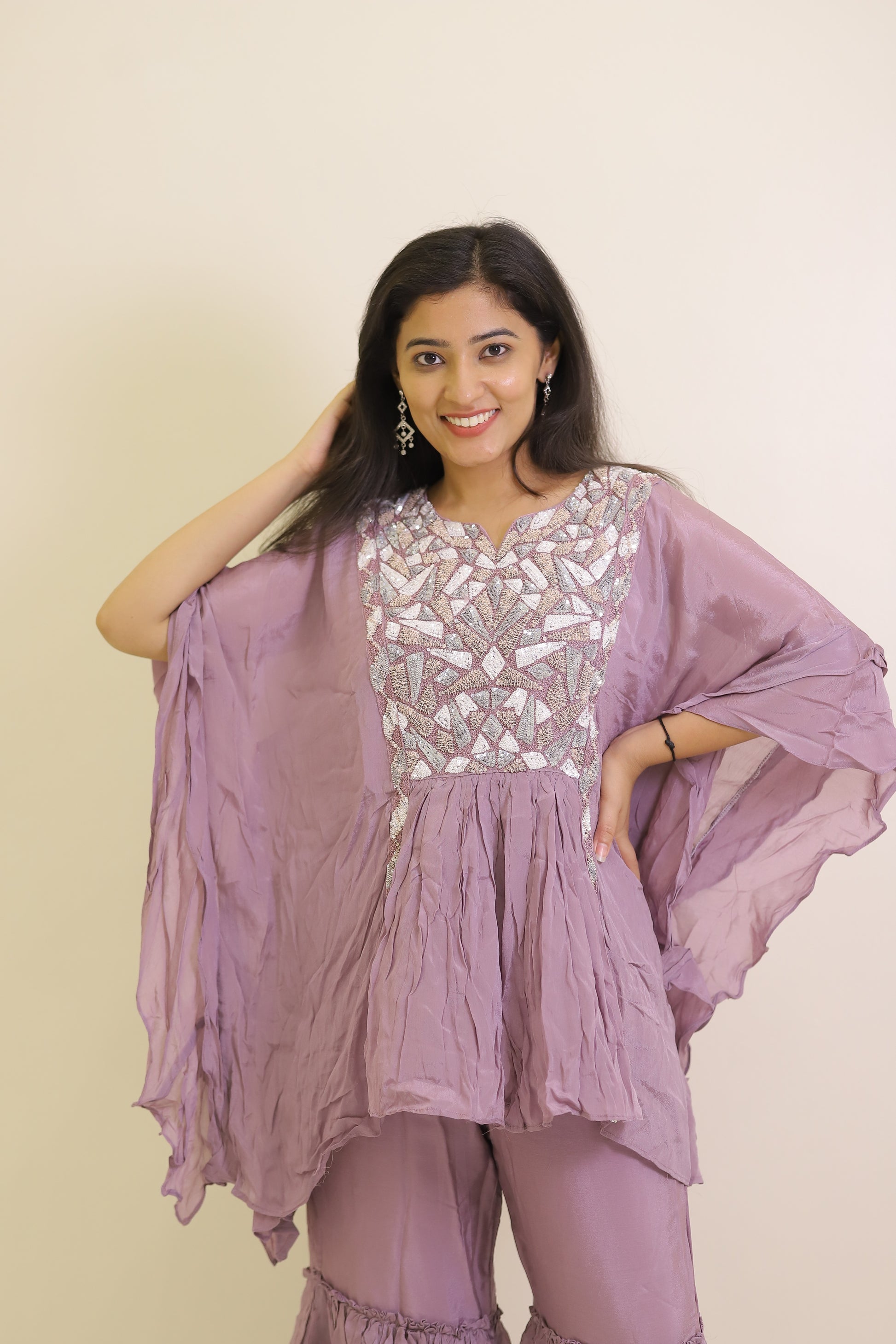 Experience the elegant fusion of tradition and modernity with this Indo Western partwear in a fresh lavender shade. Crafted for versatility, it seamlessly blends classic Indian aesthetics with contemporary western style, making it ideal for festive occasions or stylish daywear. The soothing lavender color adds a subtle yet sophisticated touch, ensuring you stand out with refined grace and expert fashion sense.