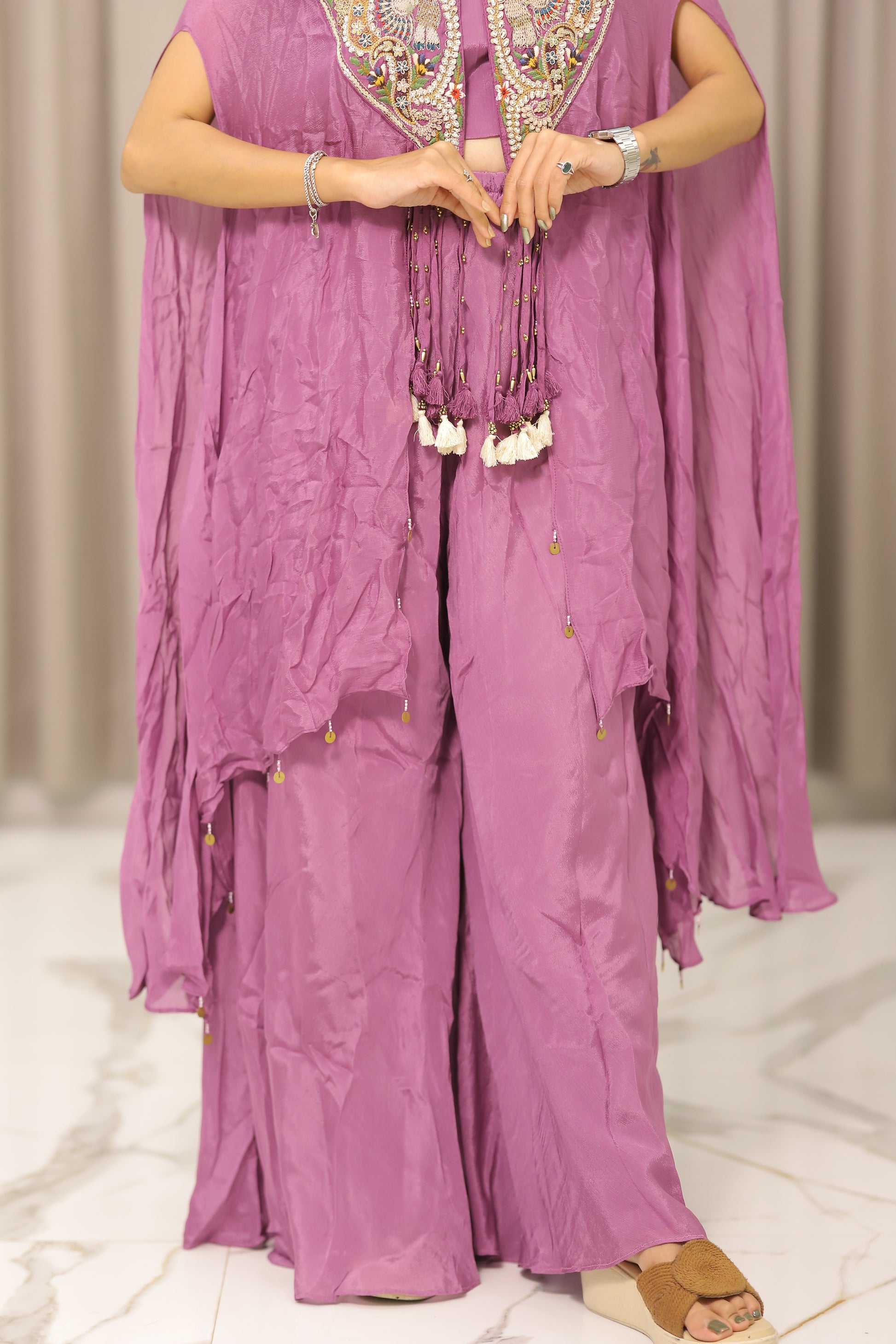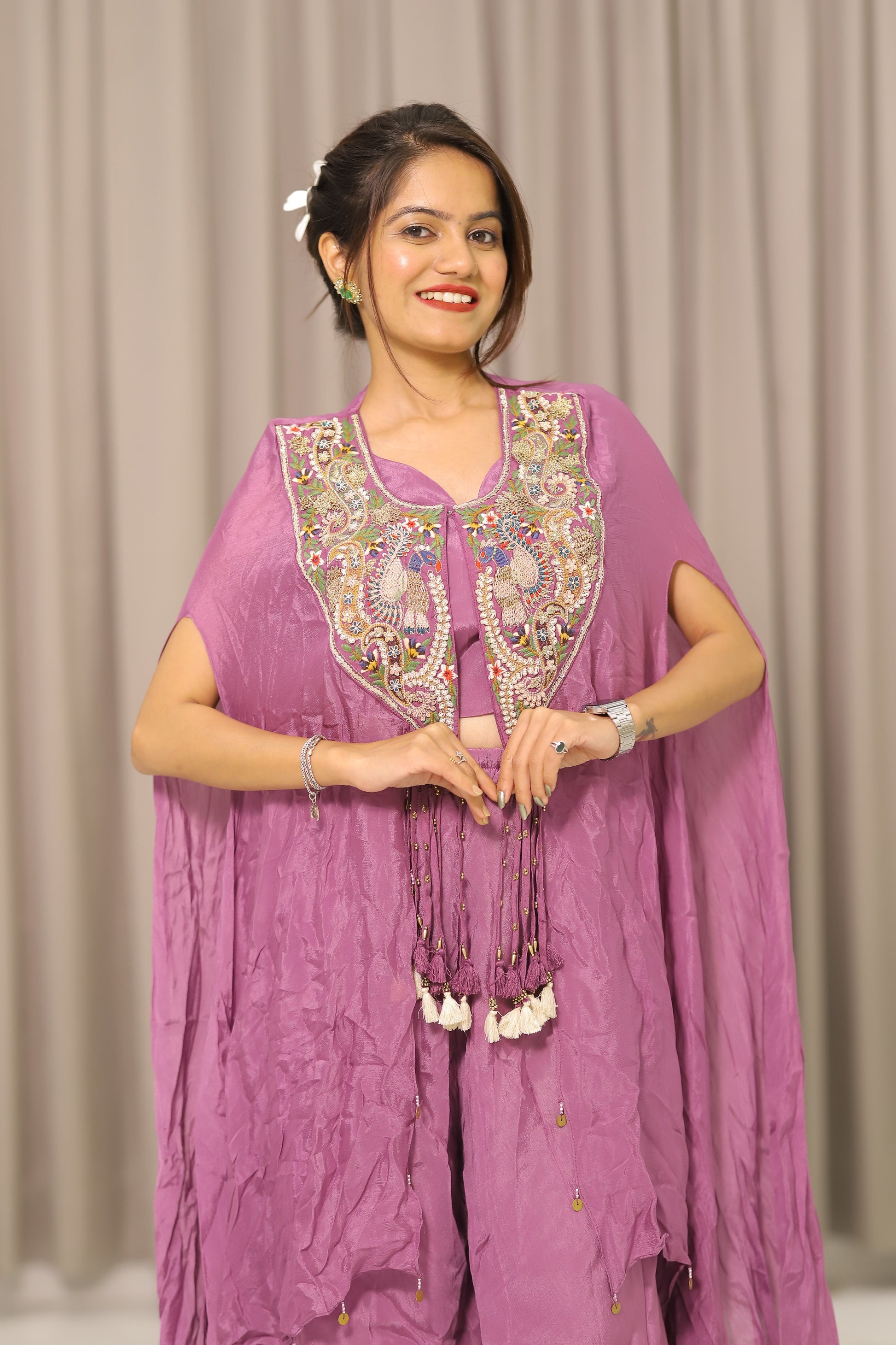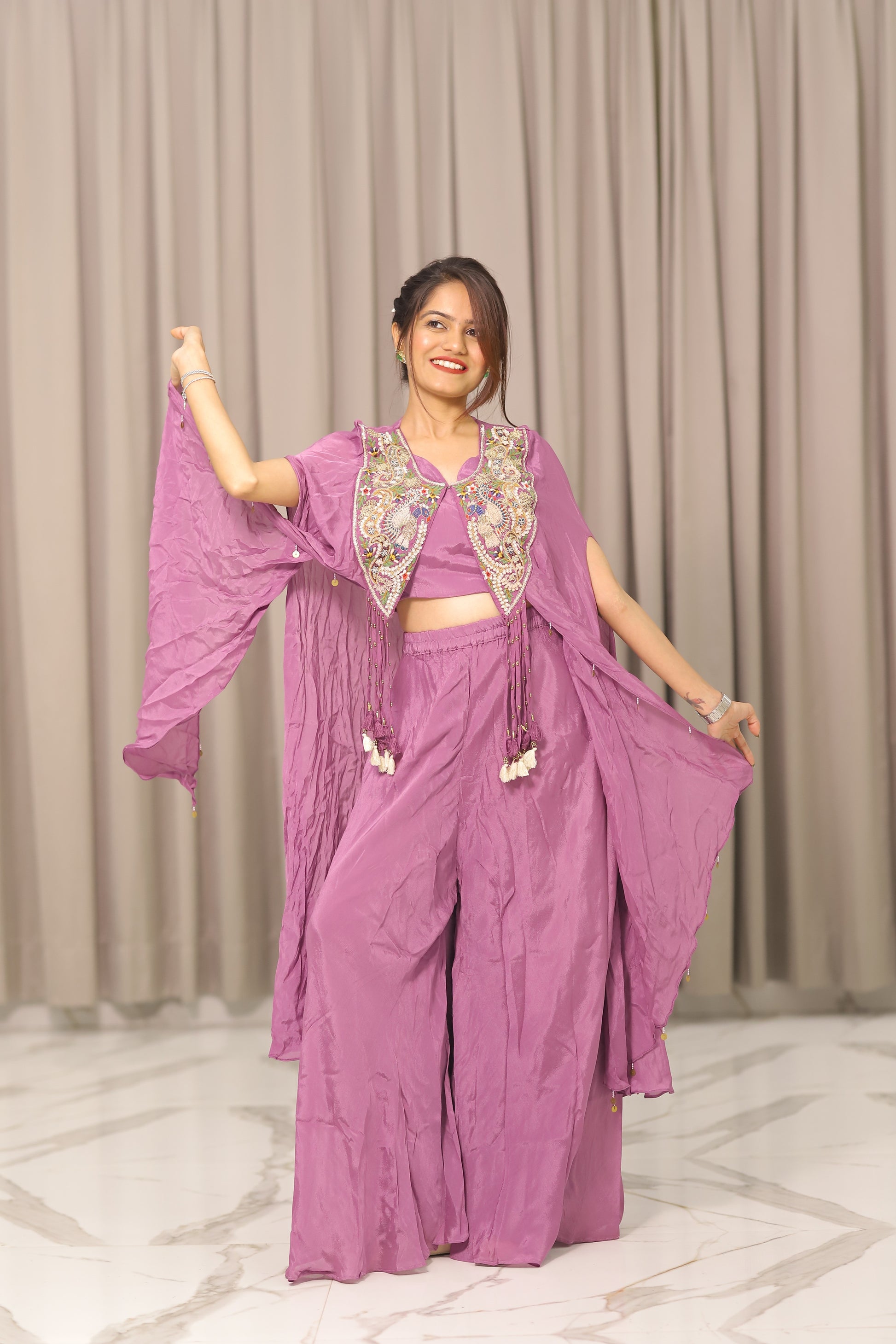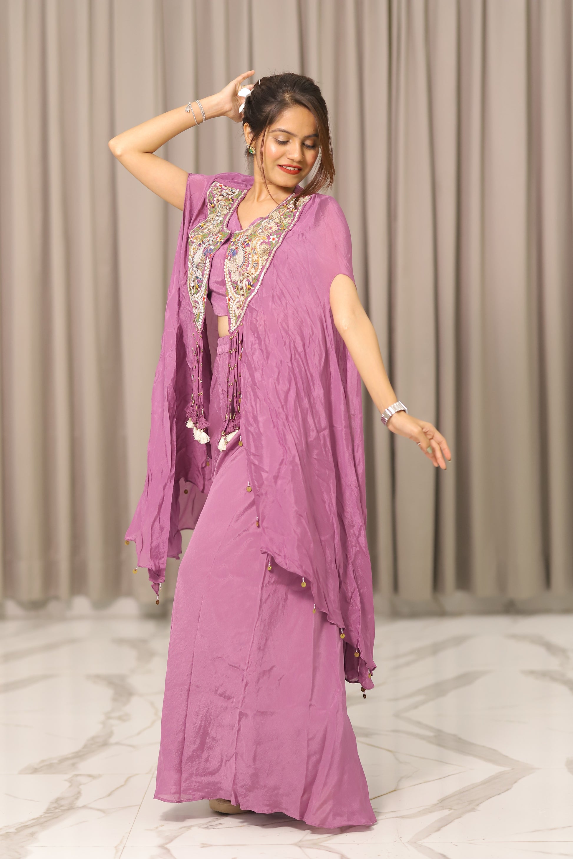This light purple Indo Western partwear combines traditional elegance with contemporary style, ideal for festive occasions and casual gatherings. Crafted to offer comfort and a graceful silhouette, its subtle hue enhances versatility, allowing easy pairing with complementary accessories. The design reflects expert craftsmanship, making it a distinguished addition to your wardrobe that balances modern trends with classic Indian aesthetics.