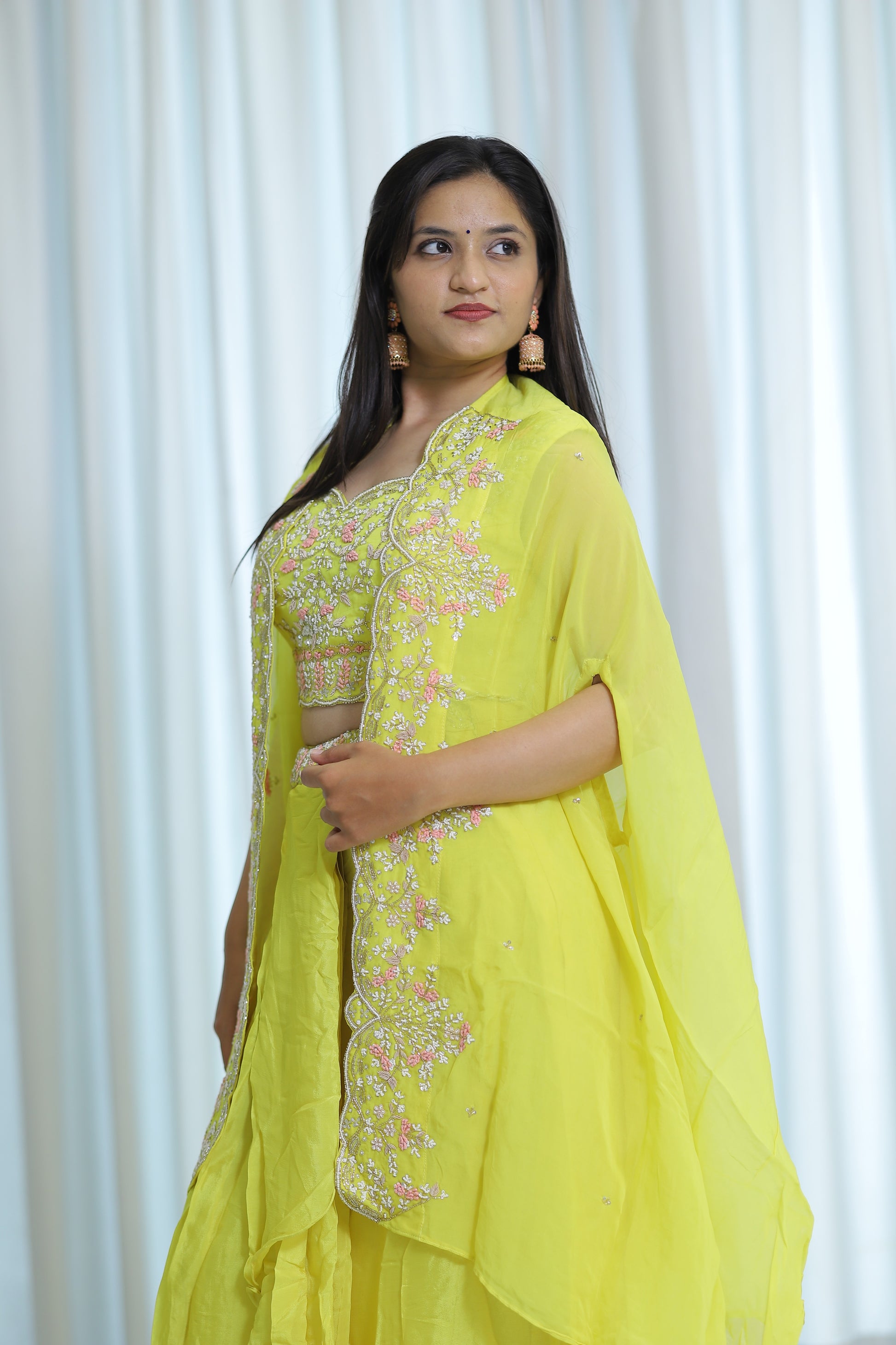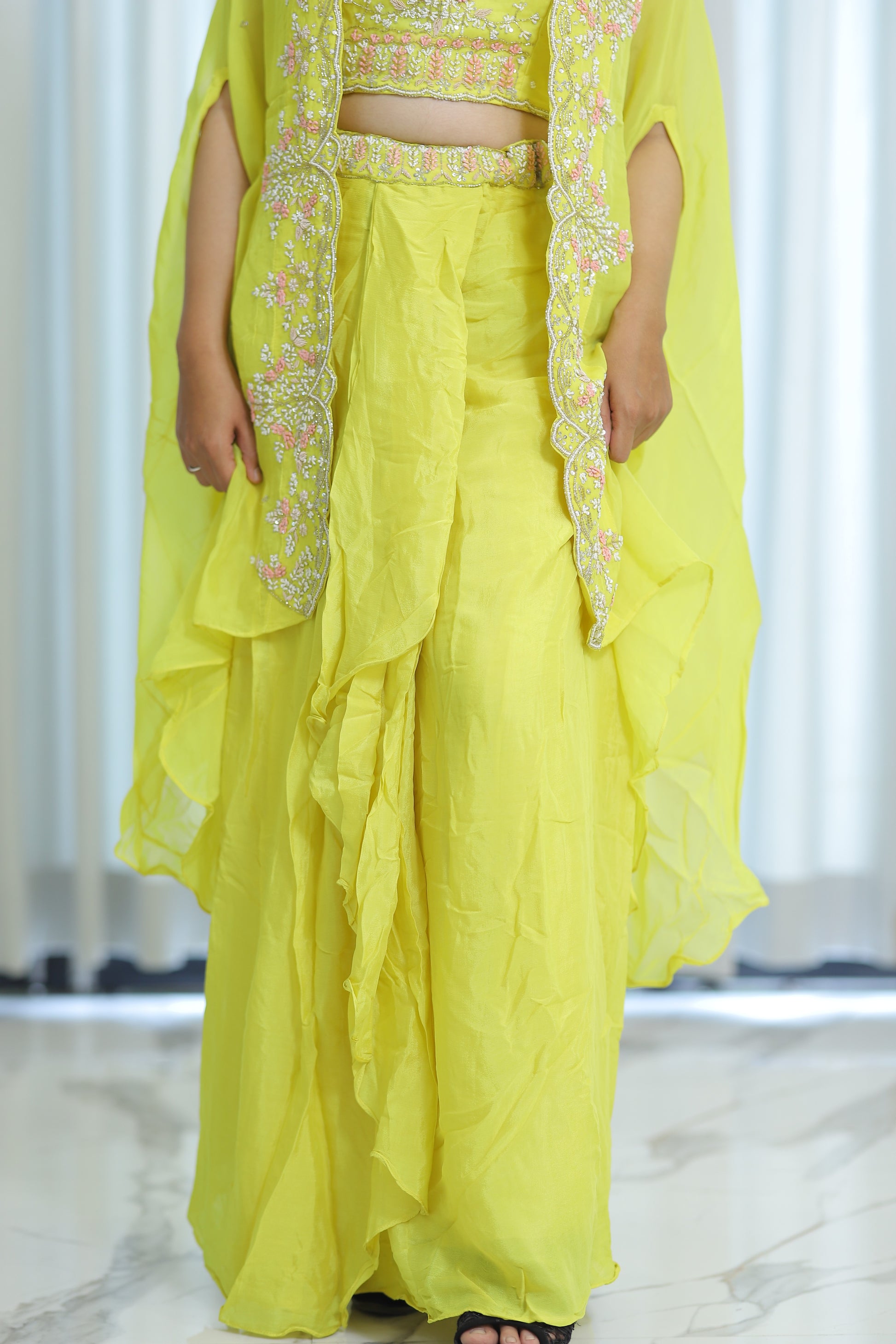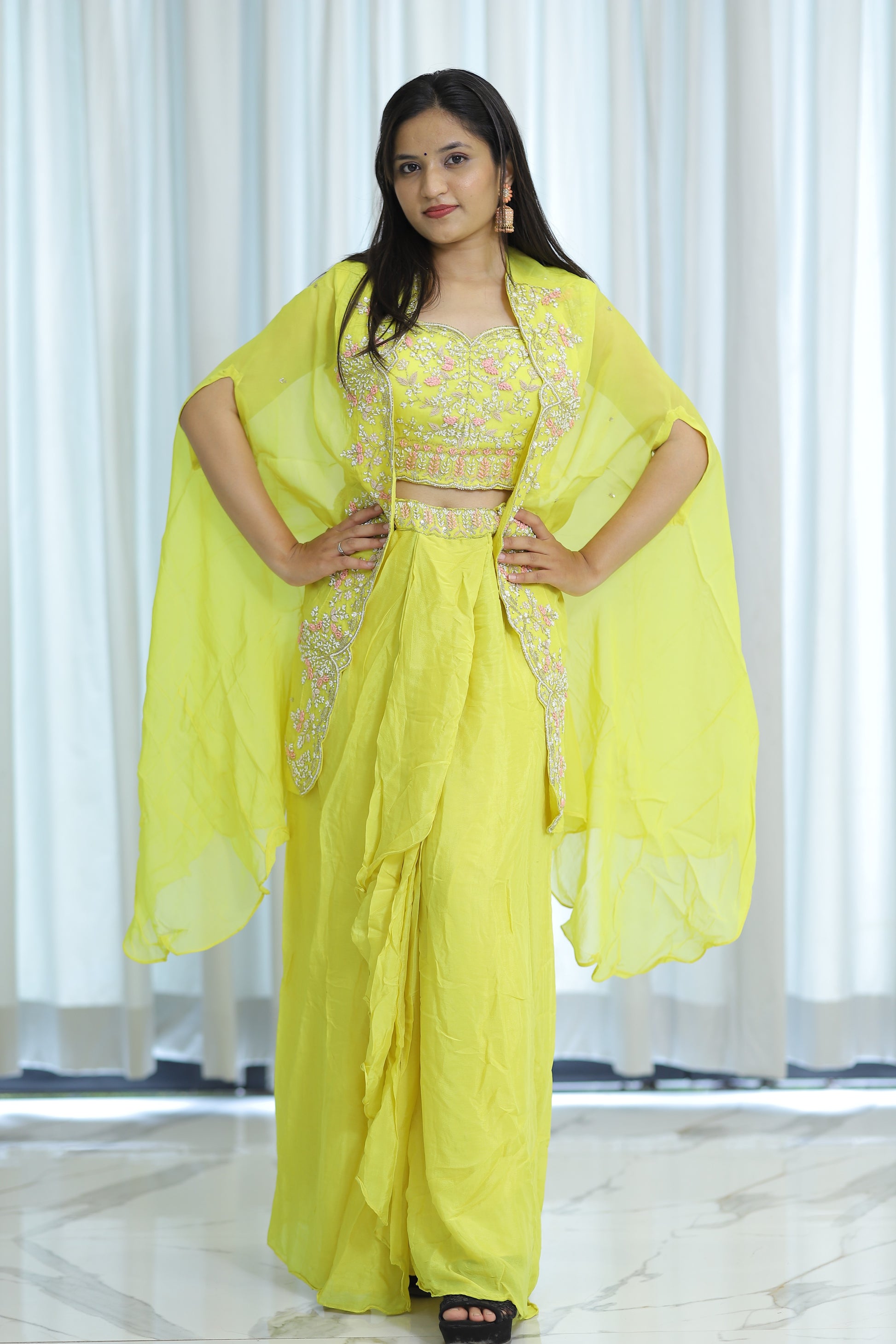 Elevate your festive wardrobe with this fresh yellow Indo Western ensemble, designed to blend traditional elegance with contemporary style. Crafted for comfort and flair, it offers a vibrant look perfect for parties and celebrations. The bright yellow hue ensures you stand out while the fusion silhouette provides versatile wearability, combining classic Indian motifs with modern cuts for an expertly curated partywear choice.