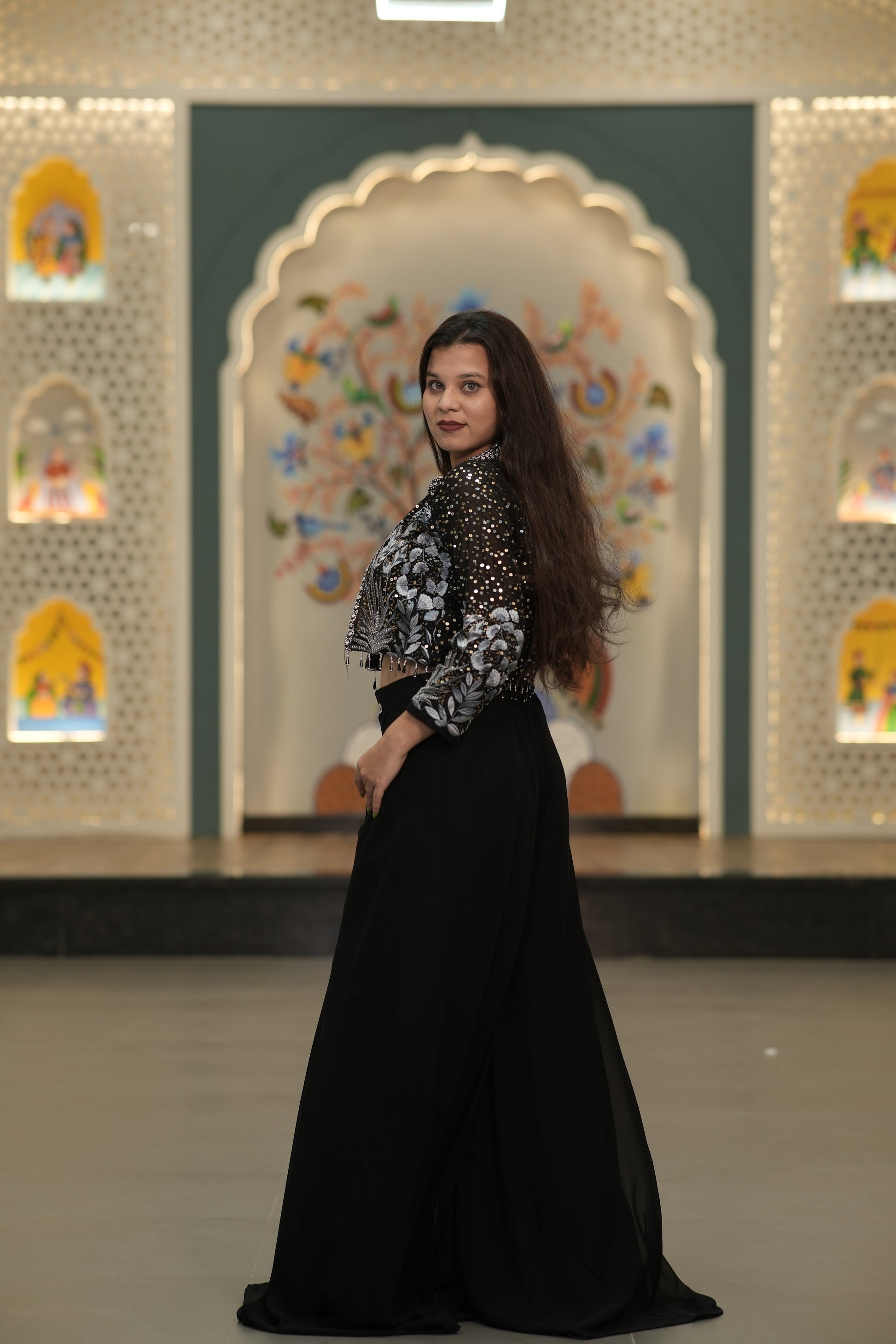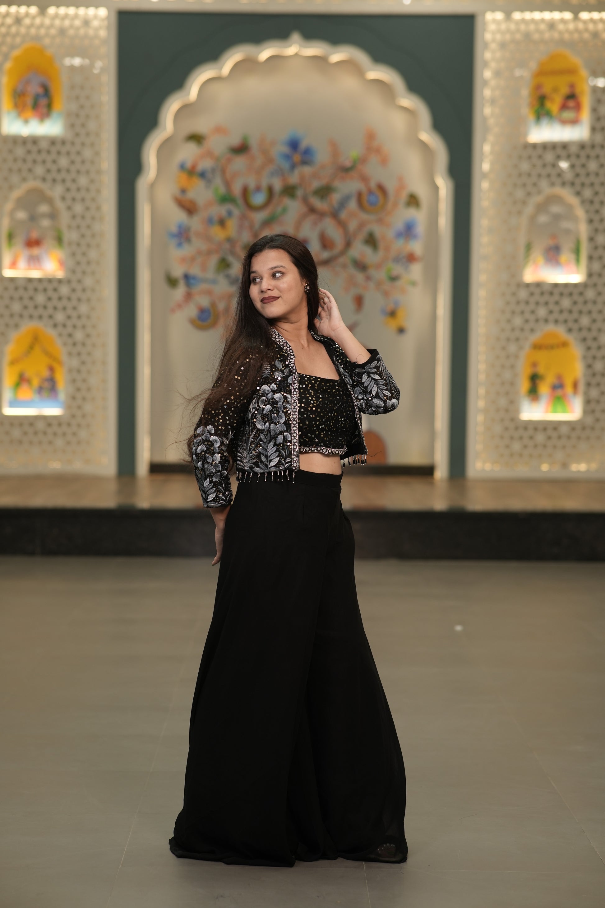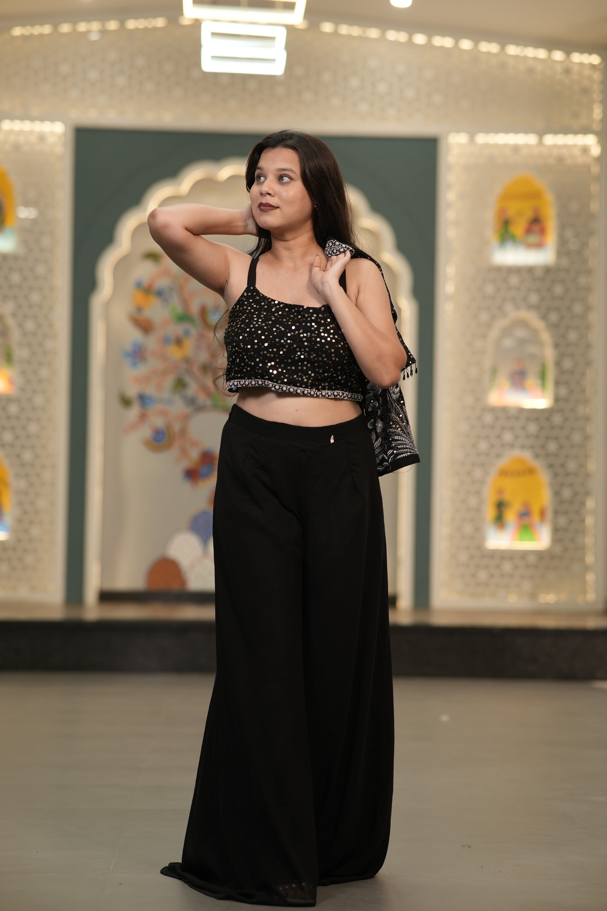 This black Indo Western outfit combines traditional elegance with modern style, featuring a sleek partwear design paired with comfortable palazzo pants. Crafted for versatility, it offers a perfect blend of contemporary fashion and cultural charm, ideal for festive occasions or casual events. The breathable fabric and flattering silhouette ensure both comfort and confidence throughout the day.