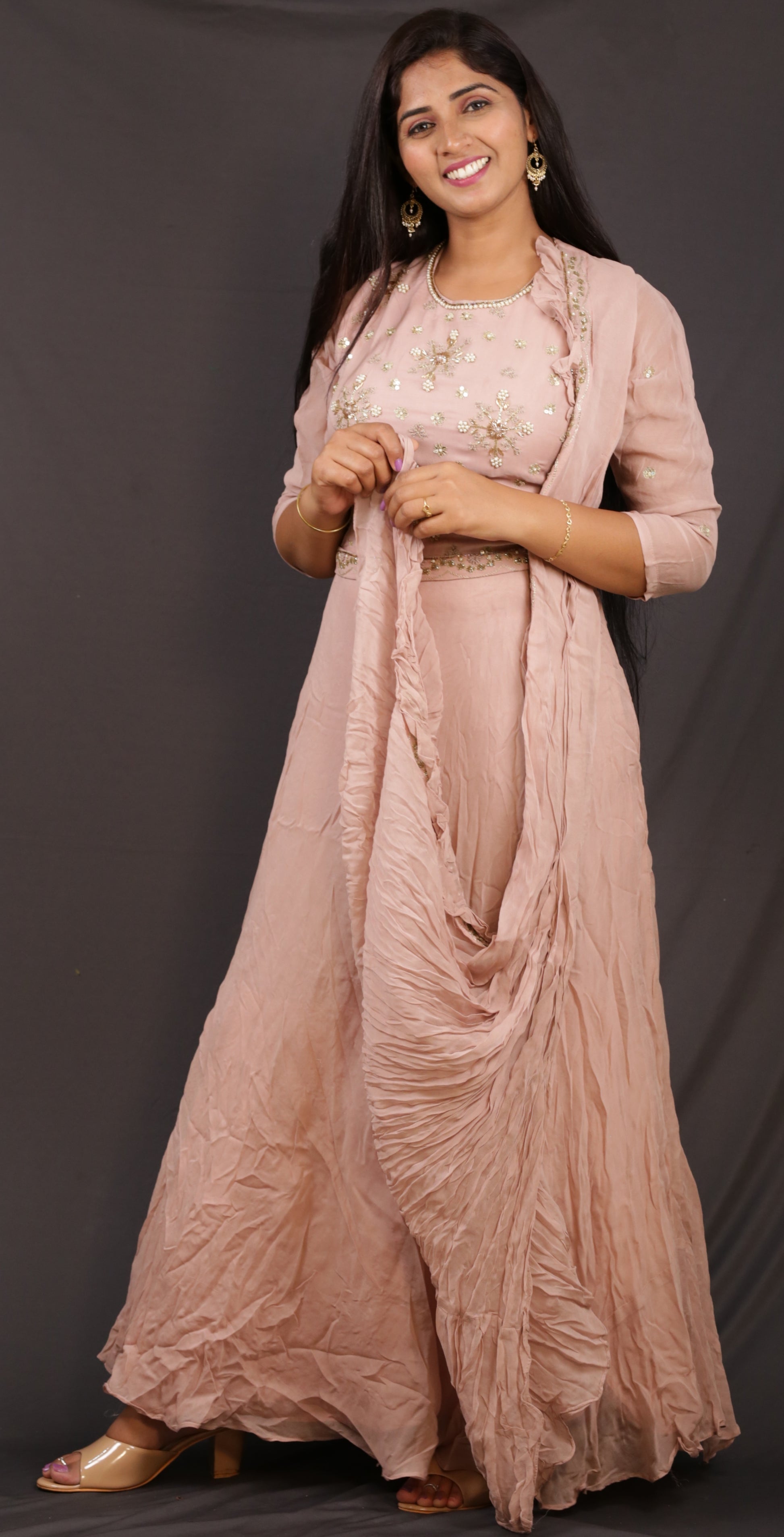 Elevate your festive wardrobe with this Indo Western long gown in vibrant pink. Expertly crafted to blend traditional charm with contemporary style, it offers a graceful silhouette perfect for parties and celebrations. The flowing design ensures comfort and elegance, making it an ideal choice for those who appreciate sophisticated ethnic fusion wear.