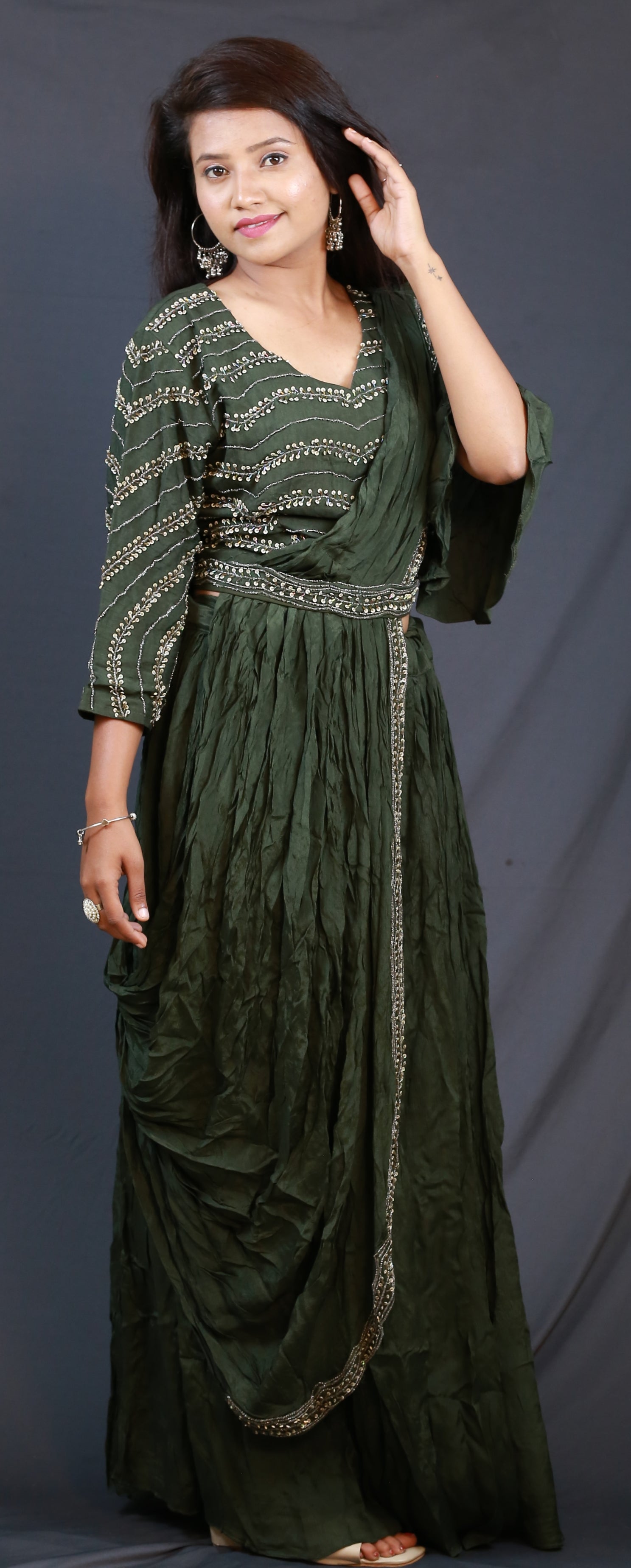The Mehndi Colour Long Indo Western dress perfectly blends traditional elegance with contemporary style. Its vibrant mehndi-inspired hues and flowing silhouette offer a graceful yet modern look, ideal for festive occasions and celebrations. Crafted to enhance comfort and style, this Indo Western ensemble ensures a standout appearance while honoring cultural richness.