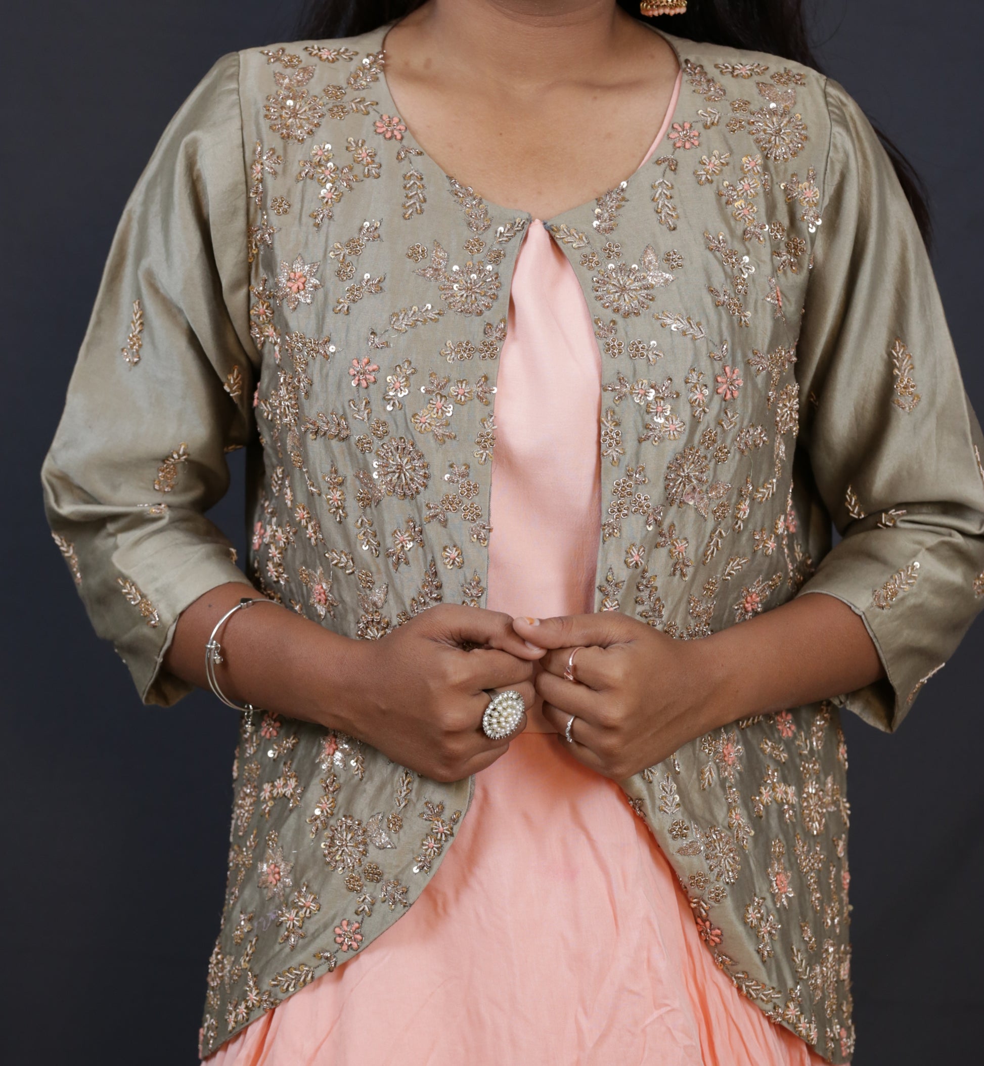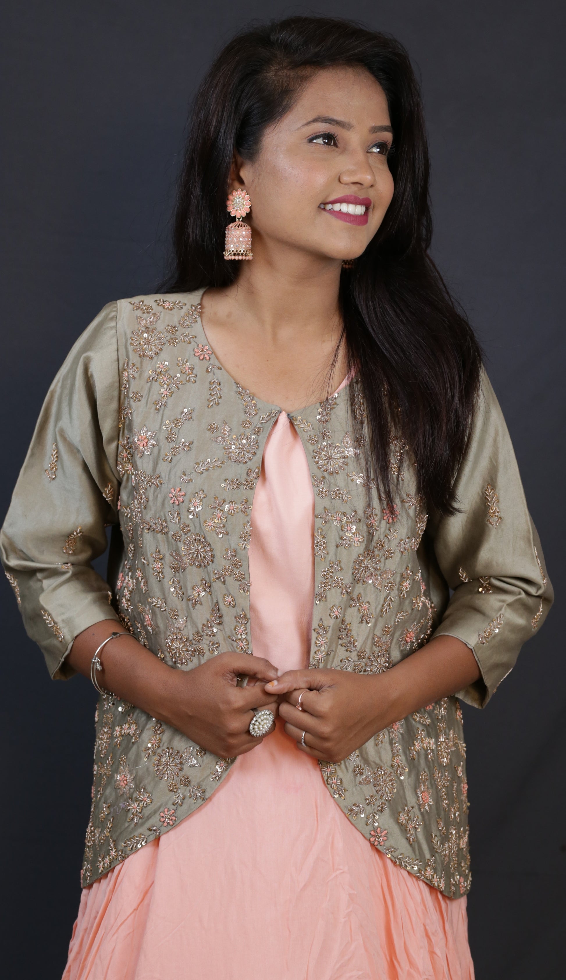 This peach-colored Indo Western ensemble features a stylish koti that adds a modern touch to traditional wear. Crafted for comfort and elegance, it blends ethnic charm with contemporary design, making it perfect for festive occasions and celebrations. The soft peach hue complements various skin tones, while the koti enhances layering, offering a versatile and sophisticated look. Ideal for those seeking a refined yet trendy outfit that honors cultural heritage with a fashionable twist.