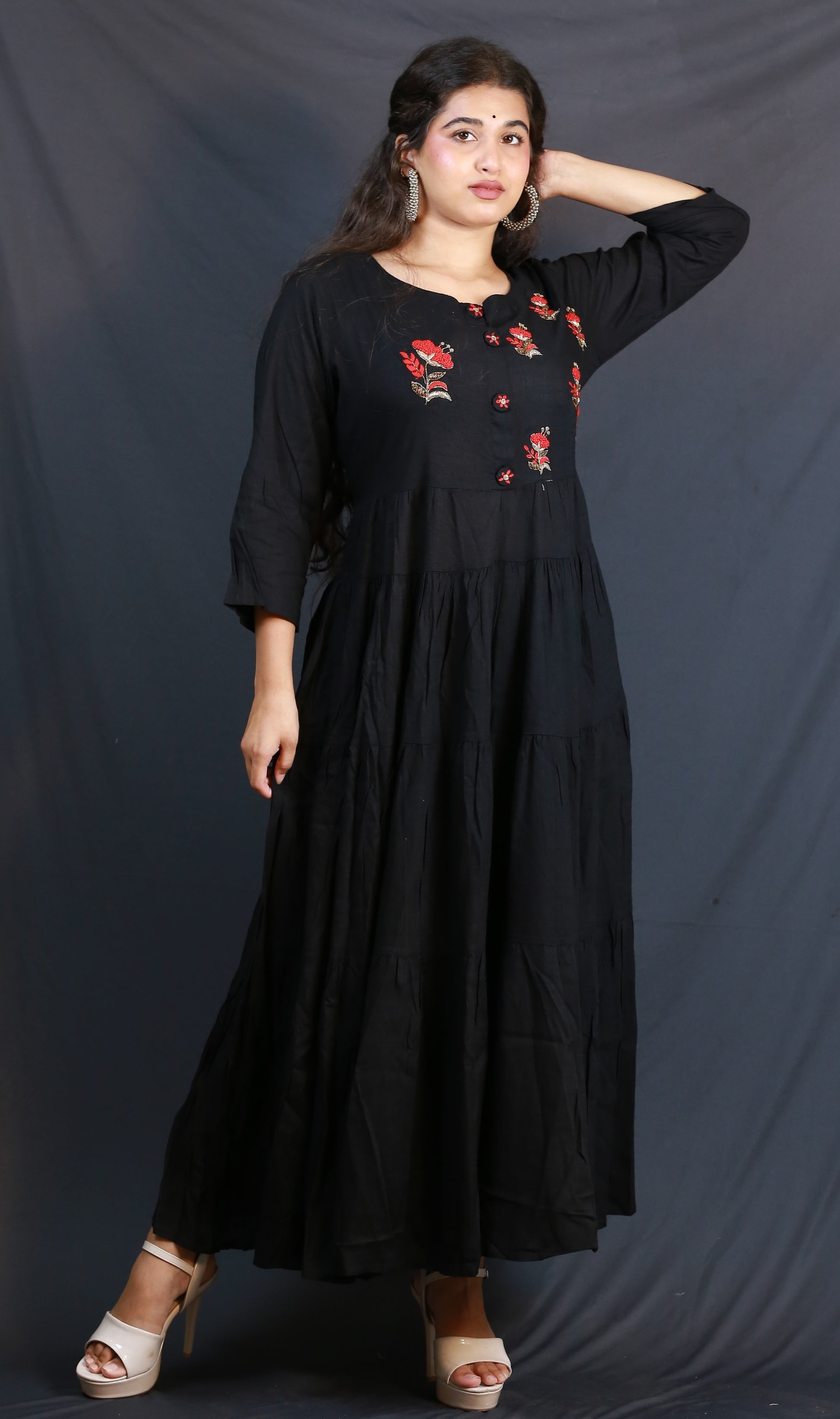 This black long kurti, crafted from soft and breathable rayon blended with cotton, offers a comfortable fit ideal for all-day wear. Its classic design and durable fabric make it a versatile addition to your wardrobe, suitable for both casual outings and office wear. The lightweight material ensures ease of movement while maintaining a polished, elegant look.