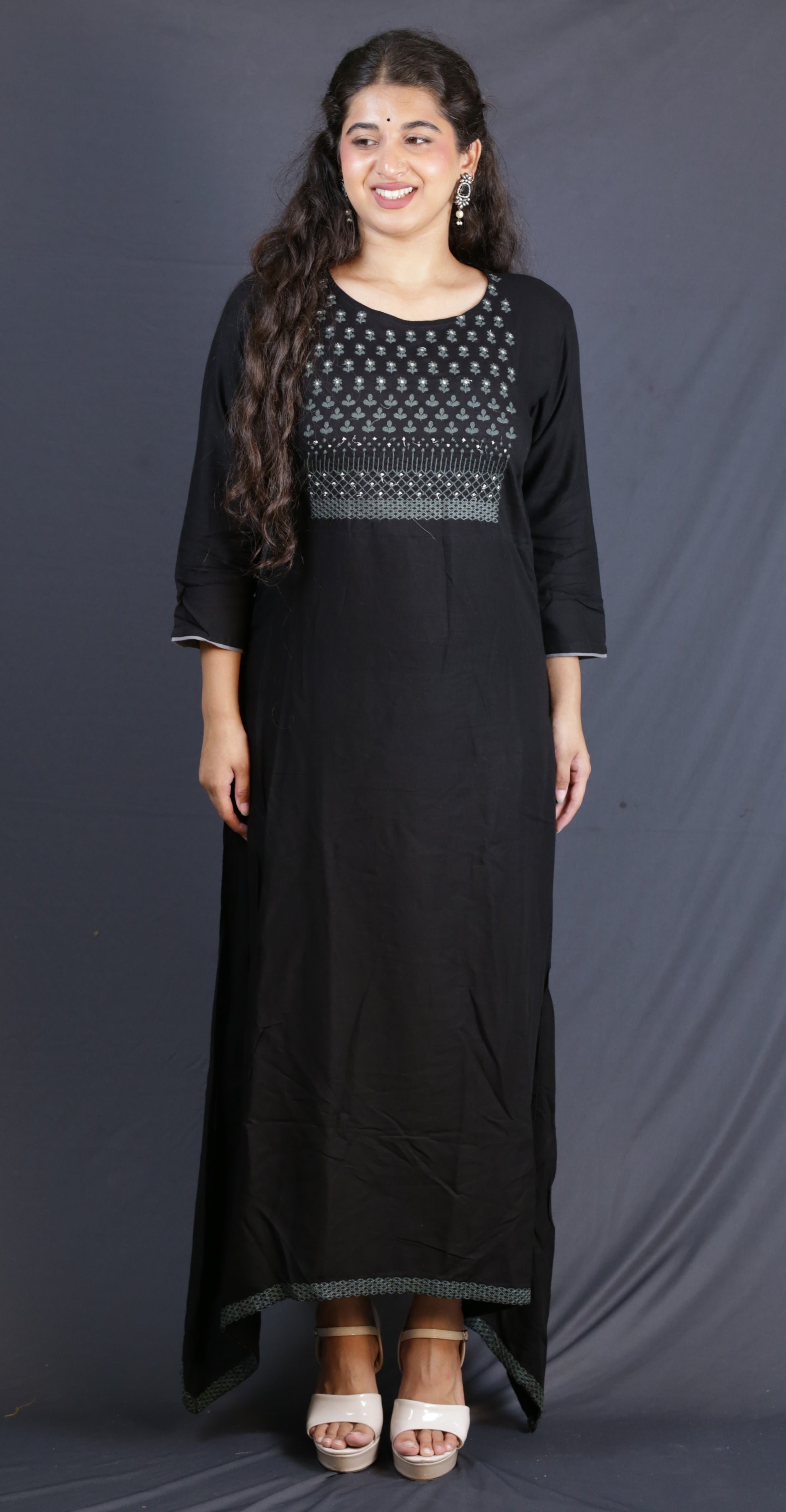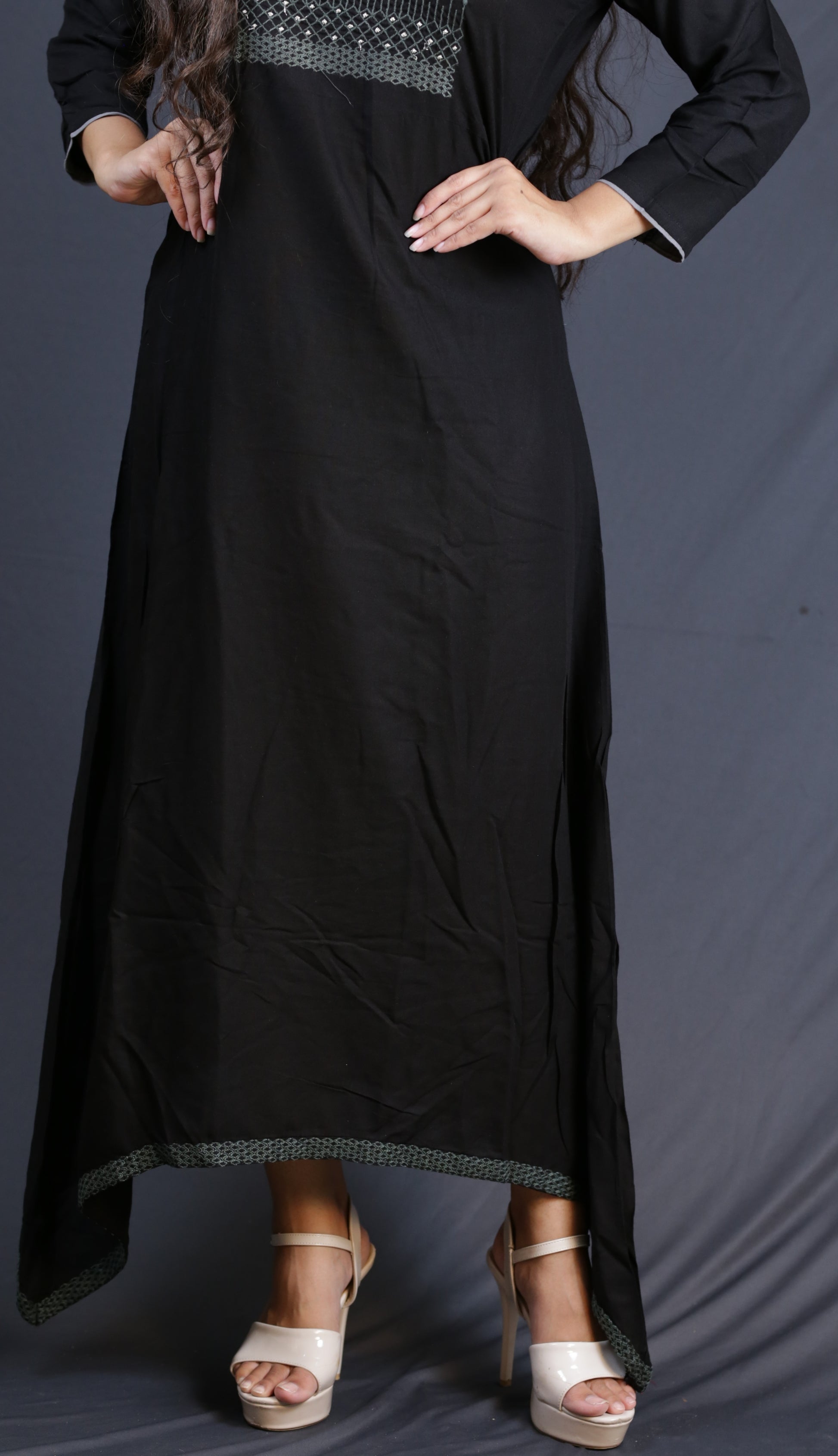 Elevate your wardrobe with this black long kurti, designed for a refined and elegant look. Crafted to offer a flattering silhouette, it pairs effortlessly with a variety of bottoms for versatile styling. The deep black shade ensures timeless appeal, while the length adds a graceful touch suitable for both casual and formal occasions. Perfect for those seeking comfort without compromising on sophistication.