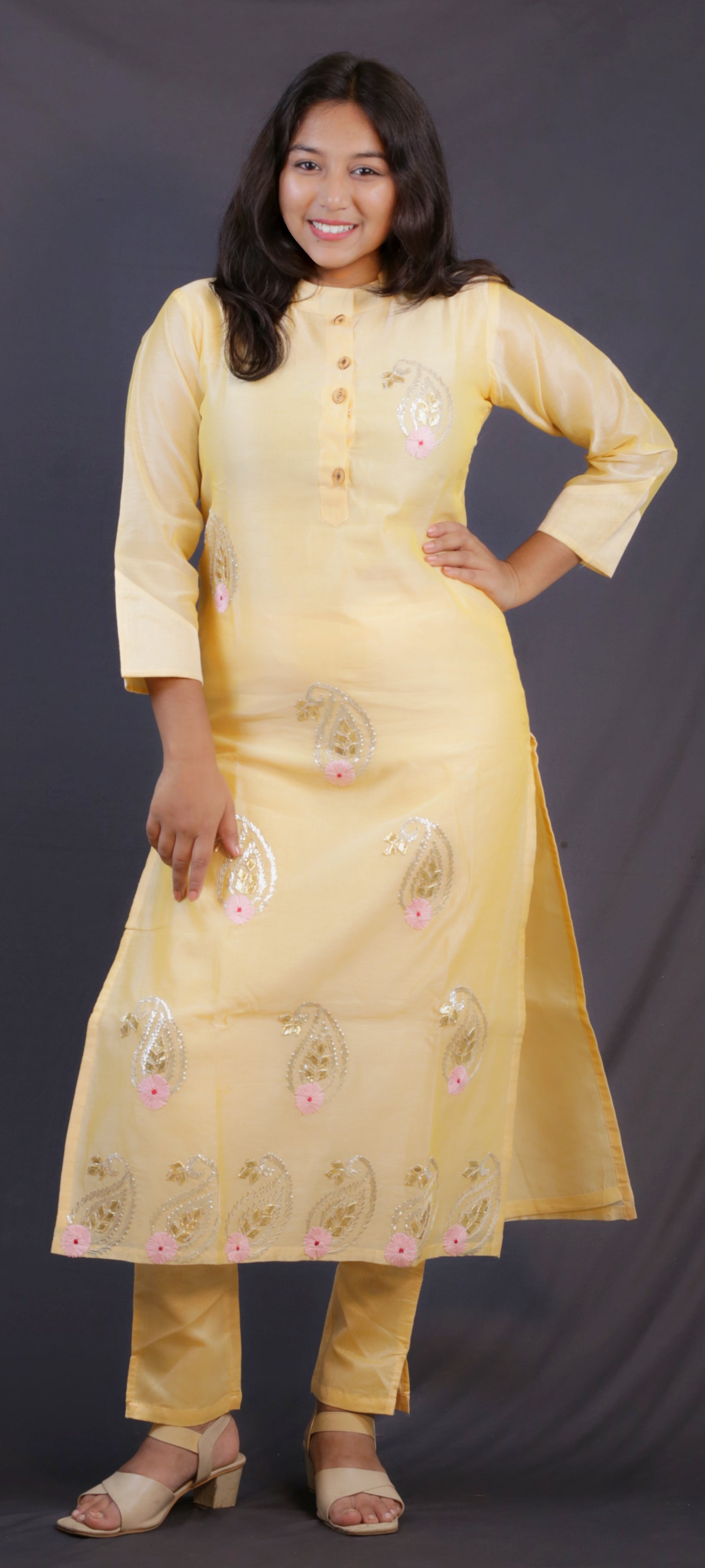 This yellow Chanderi kurti pant set combines traditional elegance with modern comfort. Crafted from breathable Chanderi fabric, it offers a lightweight and airy feel, perfect for warm weather. The vibrant yellow color enhances your presence with a subtle shine, while the tailored pant ensures a flattering fit. Ideal for festive occasions or casual wear, this ensemble blends style and ease effortlessly.