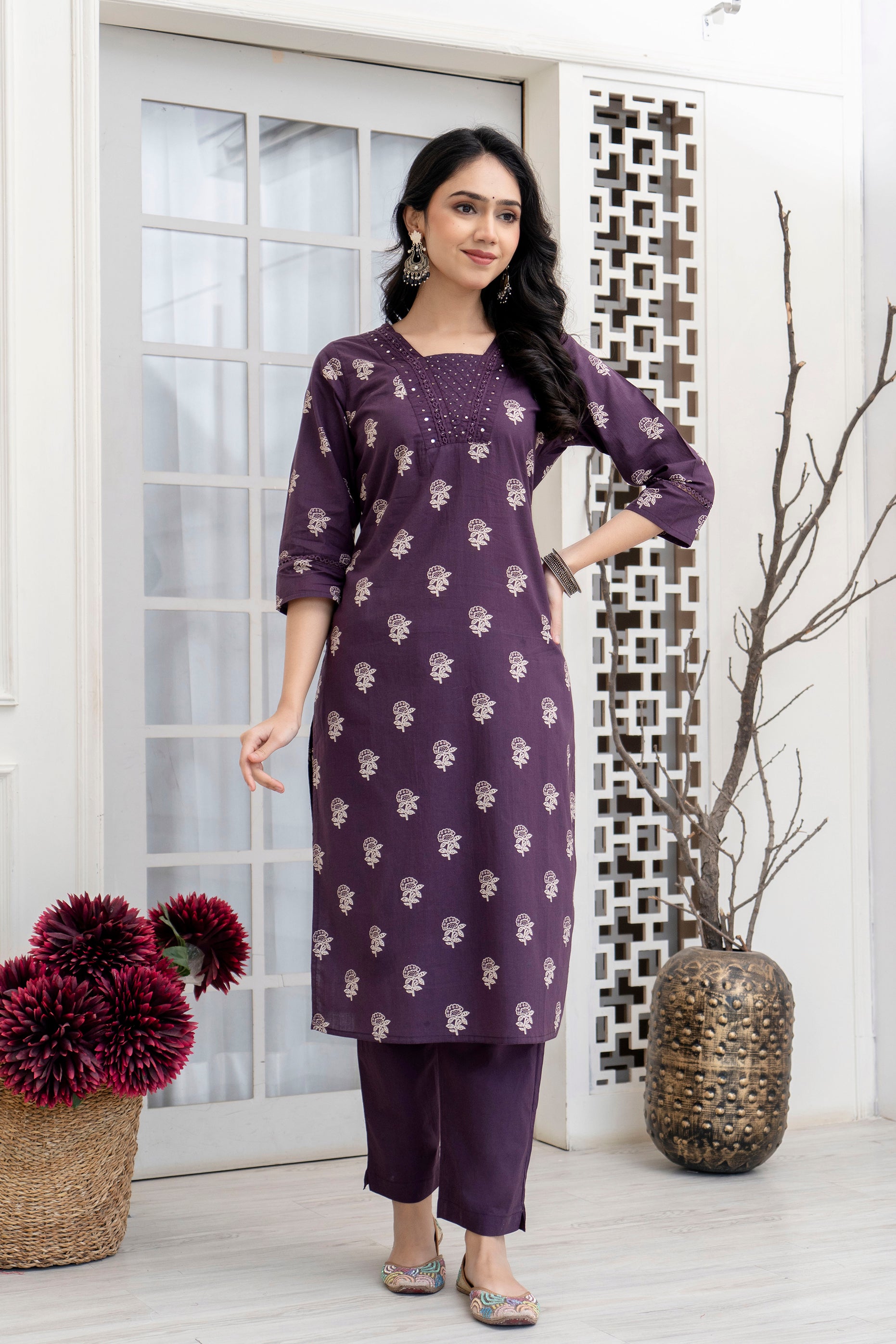Elevate your wardrobe with this expertly crafted purple kurti set, designed for both comfort and style. The rich purple hue adds a touch of elegance, while the tailored fit ensures a flattering silhouette. Perfect for casual outings or festive occasions, this kurti set combines traditional charm with contemporary appeal, making it a versatile addition to your collection.