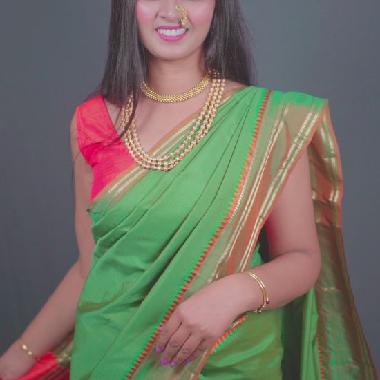 Experience the vibrant elegance of the Narayan Peth Silk Saree, dyed in fresh Mehndi color for a unique, refreshing look. Crafted with care, this saree combines traditional craftsmanship with a sophisticated palette, ideal for festive occasions and formal events. Its rich silk fabric ensures smooth drape and lasting comfort, while the natural Mehndi hue adds an authentic touch of heritage and style to your wardrobe. Elevate your ethnic collection with this expert blend of color and texture.