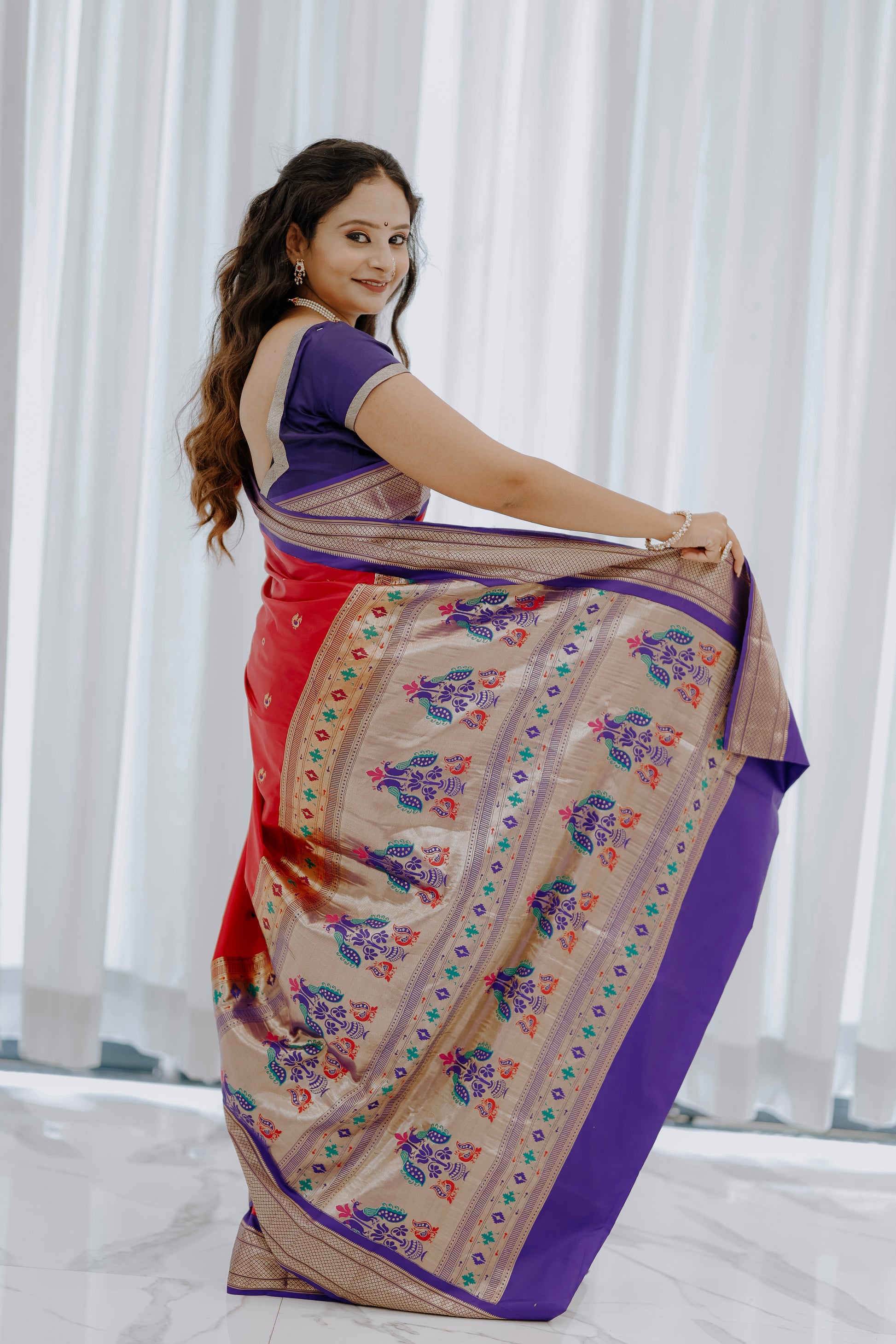 Experience the timeless elegance of the Paithani Silk Saree, renowned for its rich silk fabric and intricate handwoven designs. This saree showcases traditional craftsmanship with vibrant colors and exquisite motifs, making it a perfect choice for special occasions. Its luxurious texture ensures comfort while enhancing your graceful silhouette, reflecting a heritage of artistry and sophistication. Ideal for those who appreciate authentic Indian textiles and classic style.