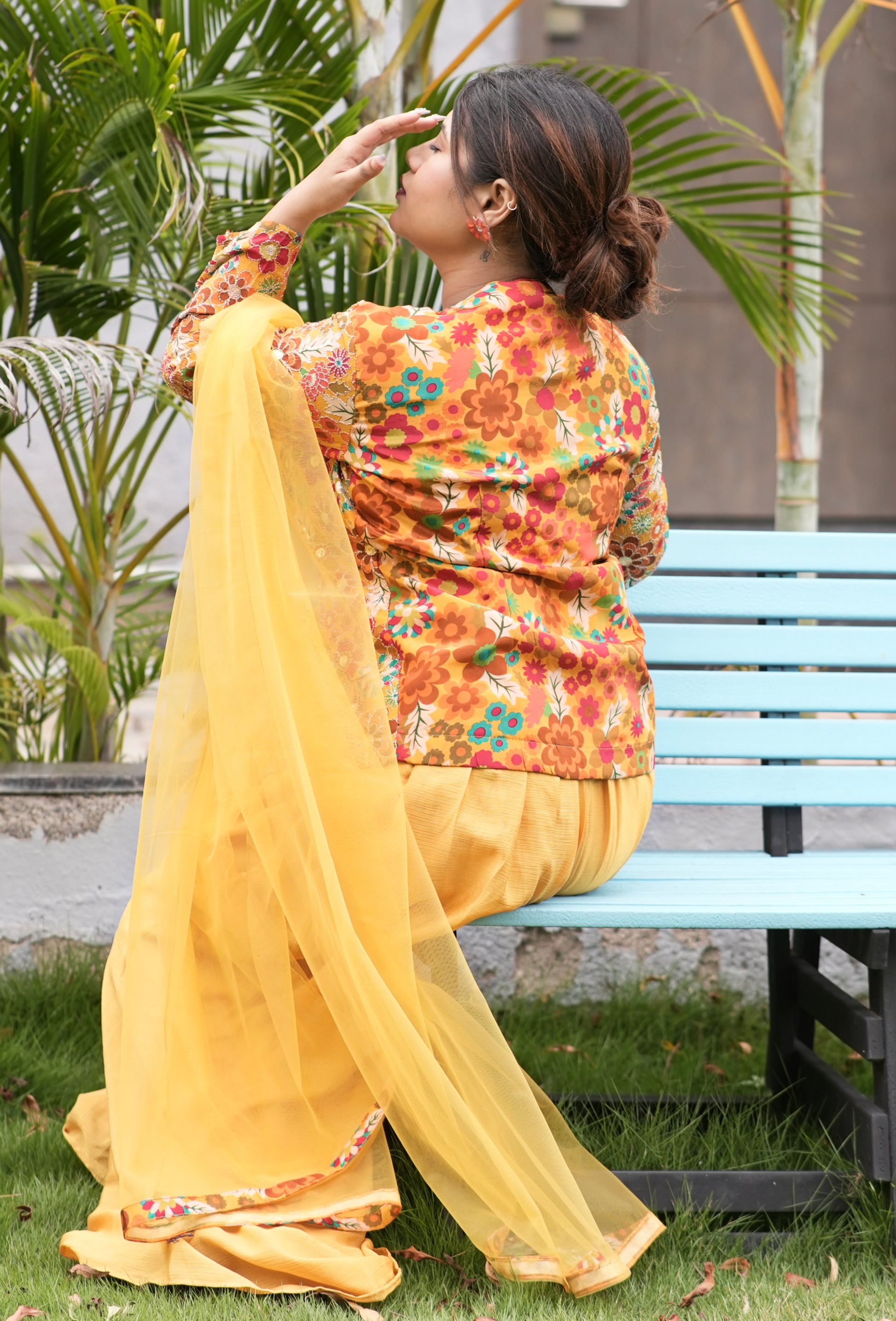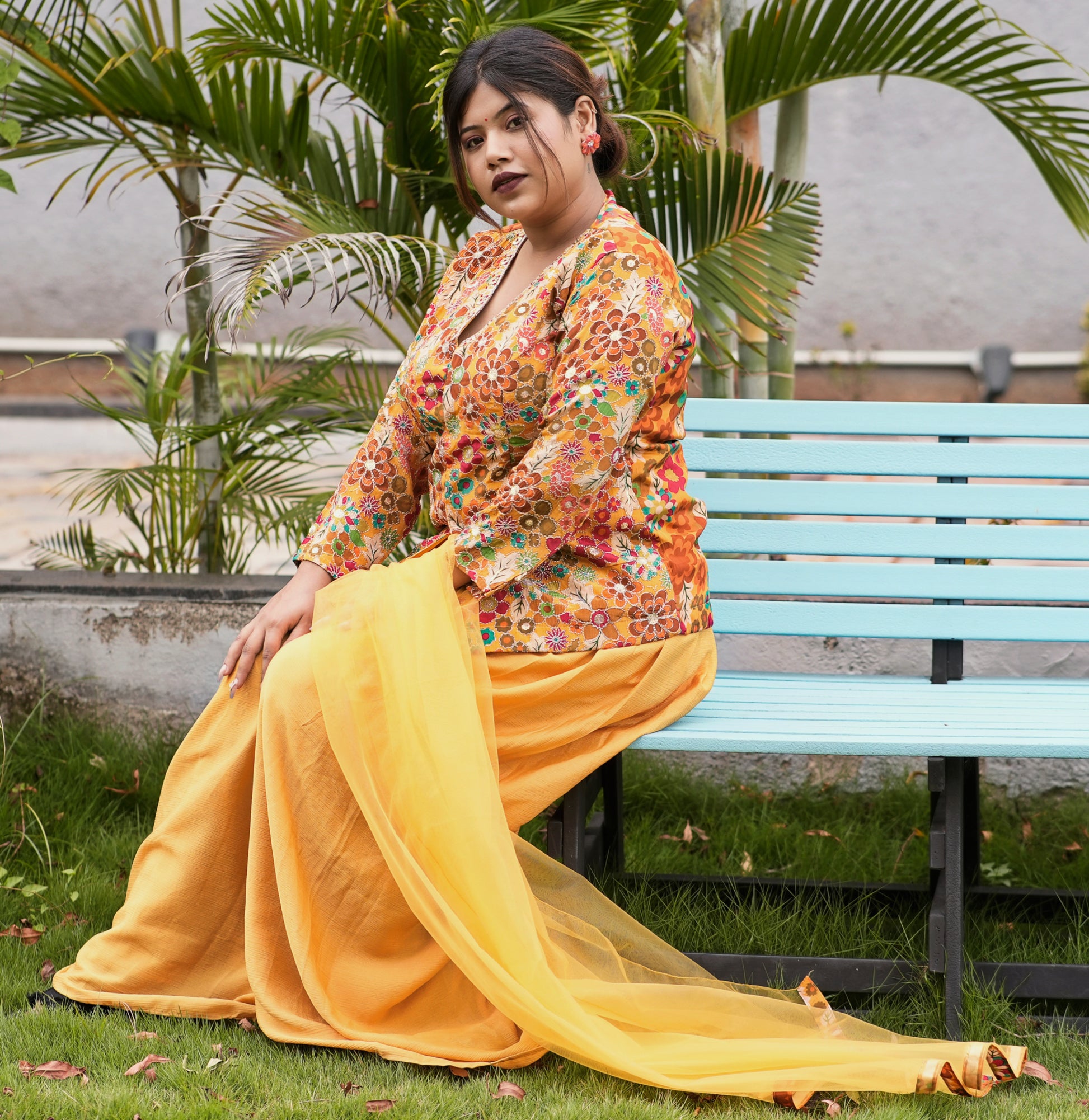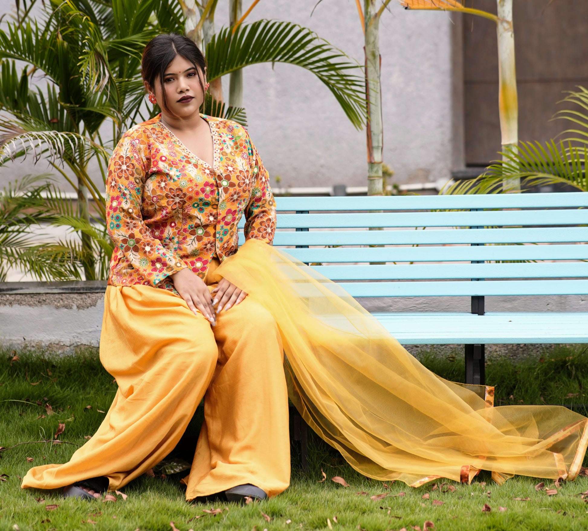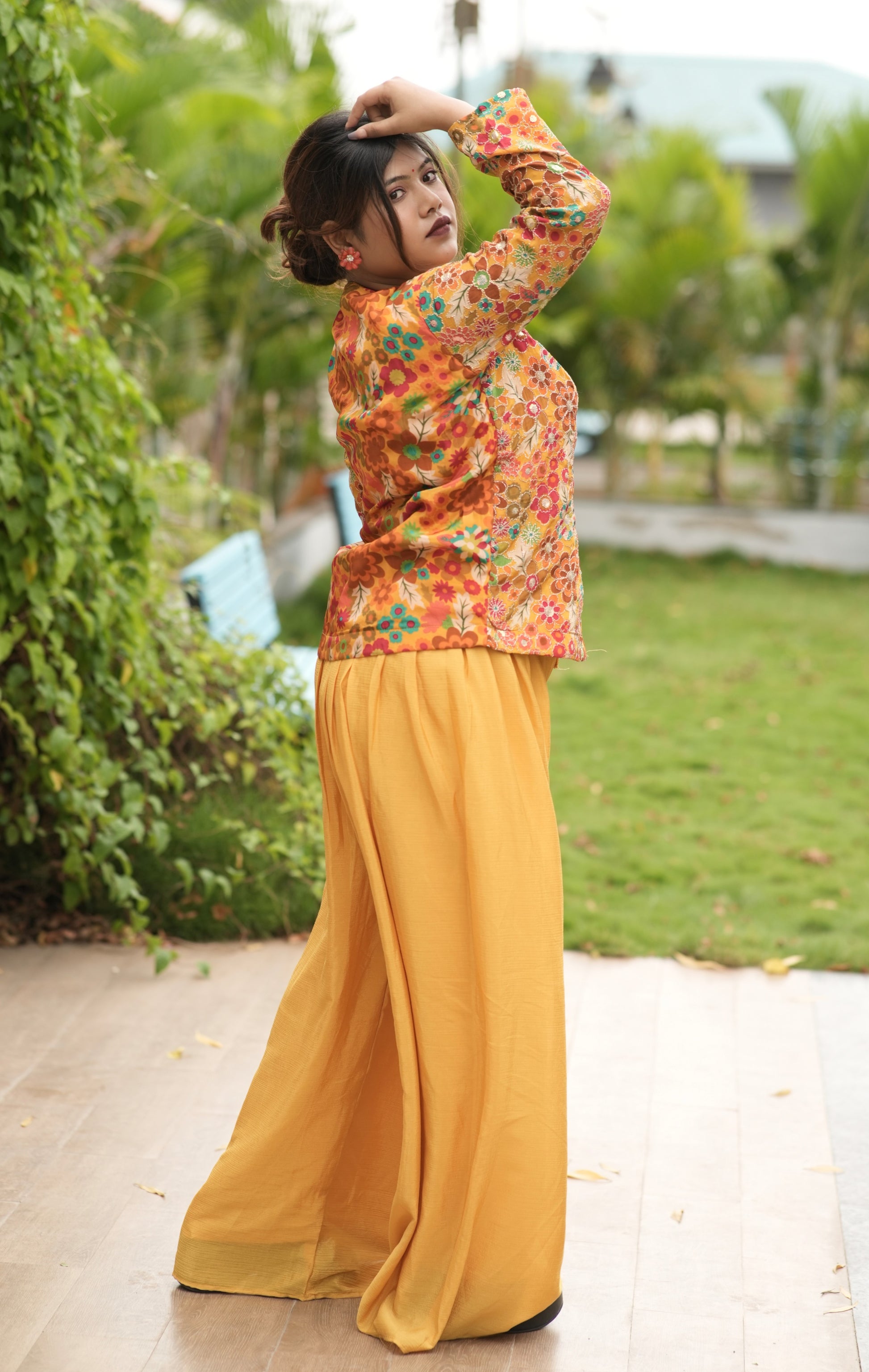 Elevate your wardrobe with this Mustard-colored Plazo Set, expertly crafted for both comfort and style. The breathable fabric ensures all-day ease, while the wide-legged design offers a flattering silhouette suitable for various occasions. Perfect for those seeking a blend of traditional charm and contemporary fashion.