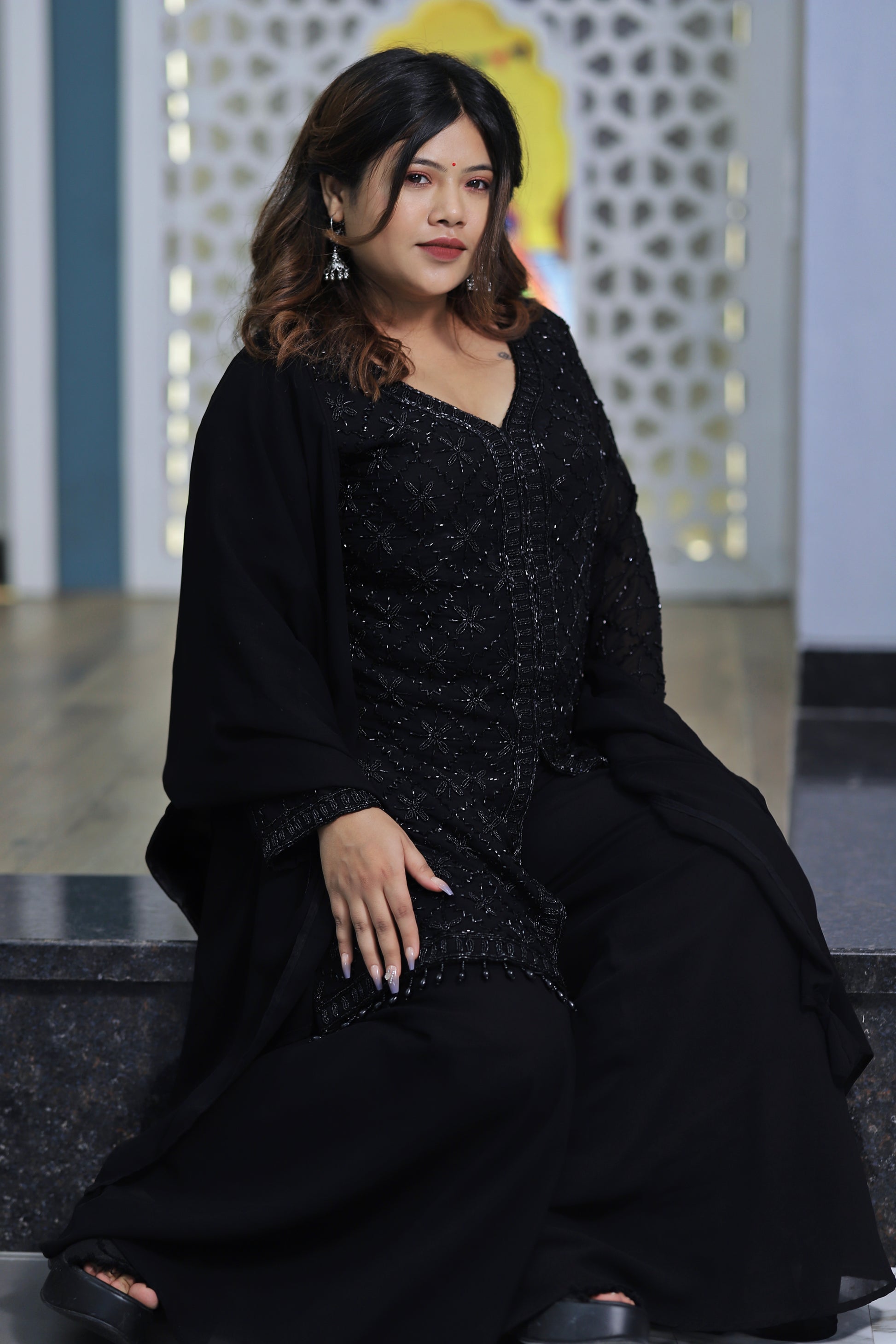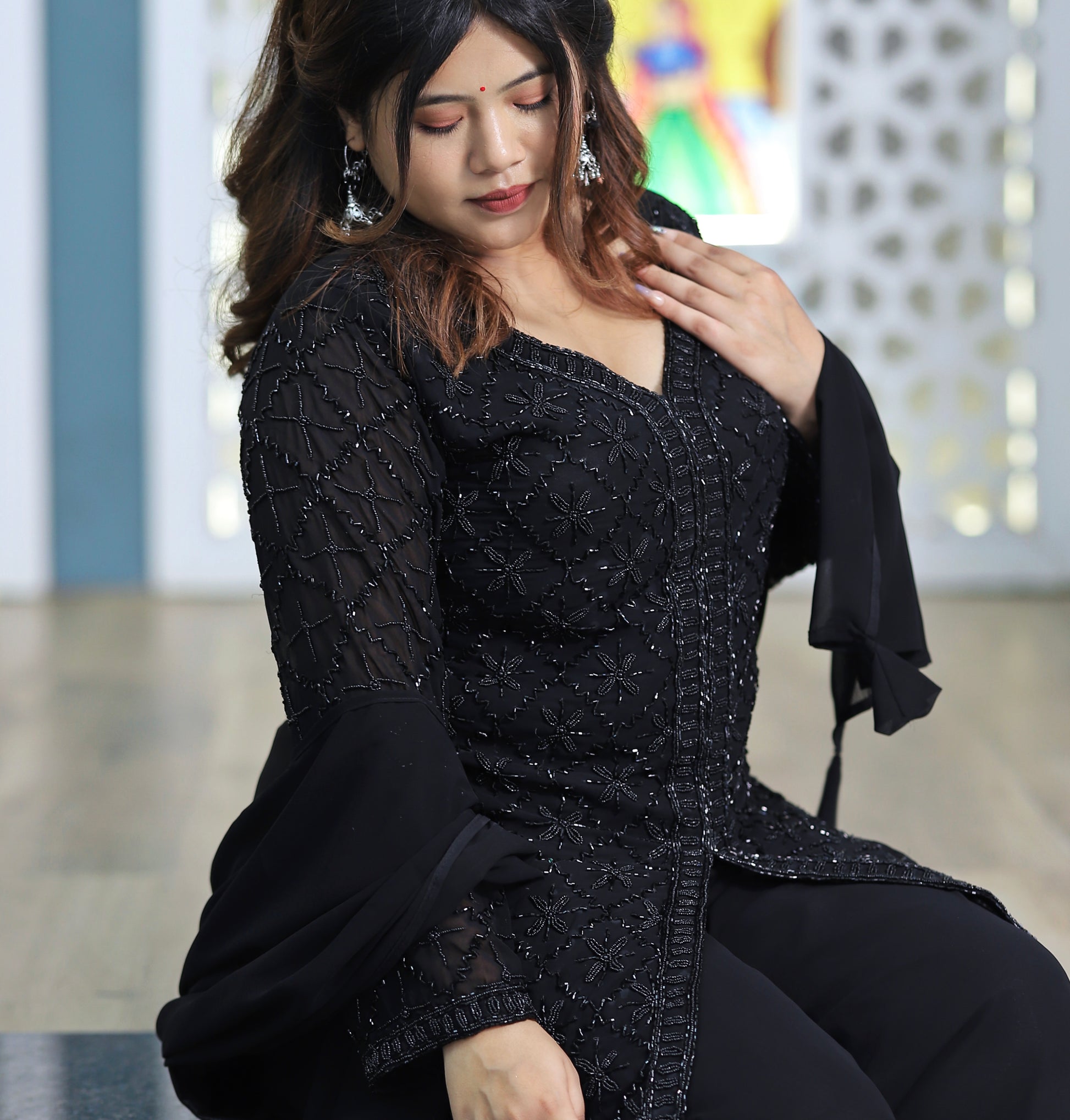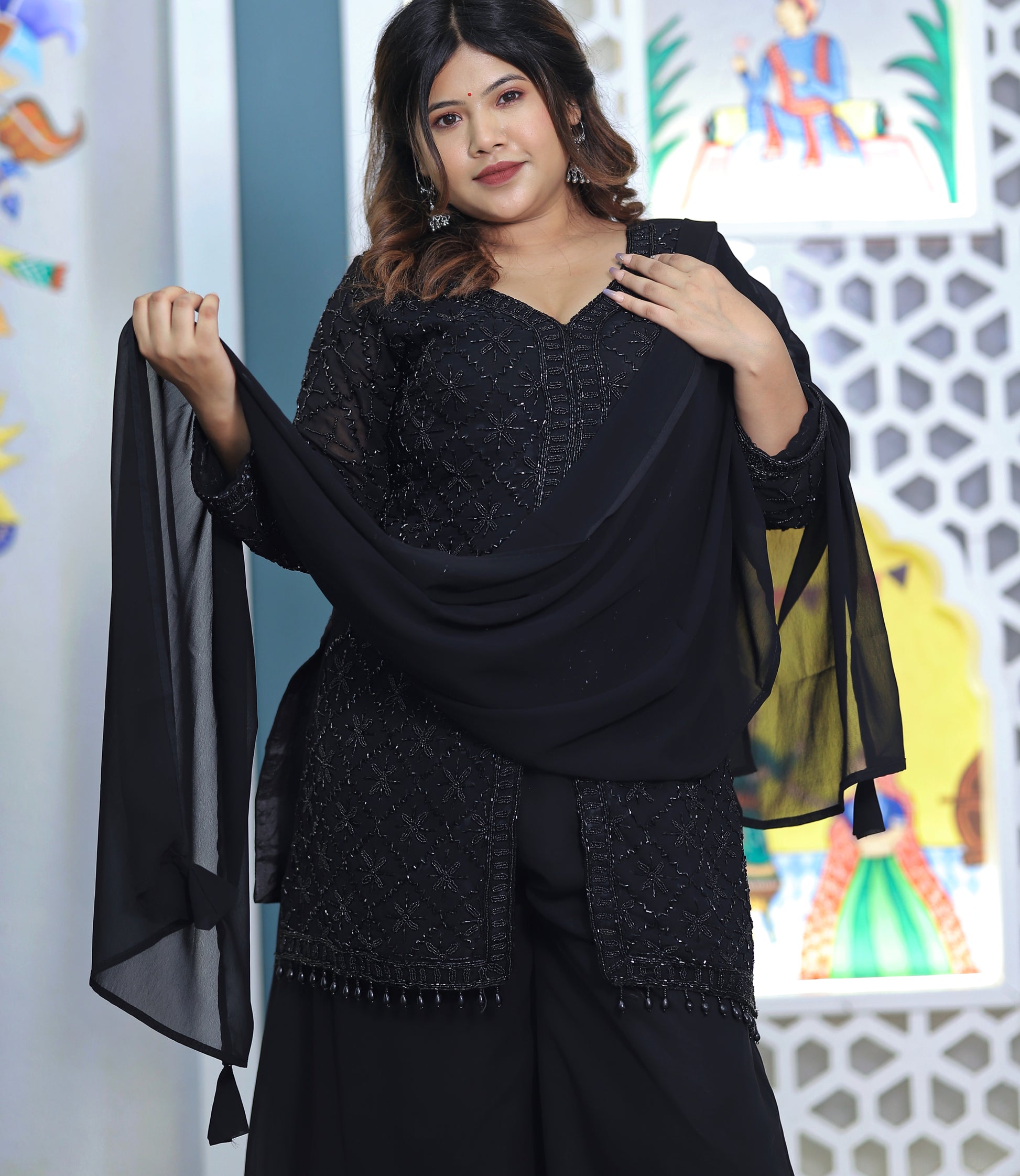 Elevate your festive wardrobe with this expertly crafted partywear black plazo set. Designed for comfort and style, the breathable fabric ensures ease of movement while the sleek black hue adds a timeless elegance. Perfect for celebrations, this set combines traditional charm with contemporary tailoring to offer a sophisticated look that stands out effortlessly.