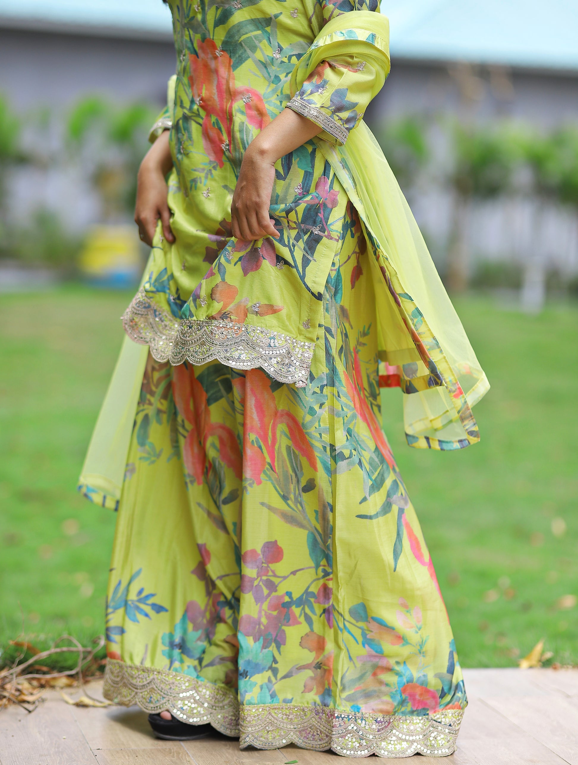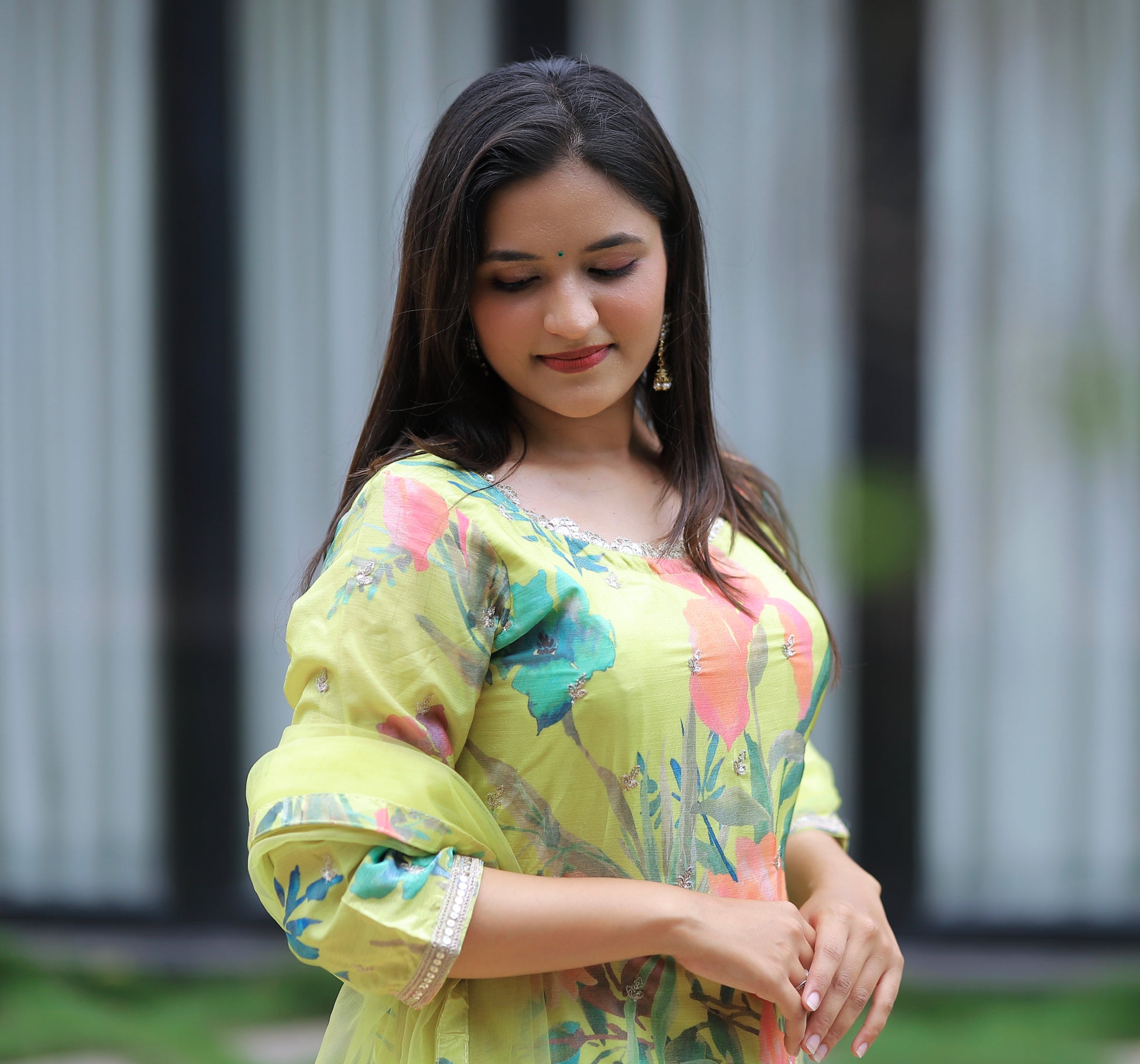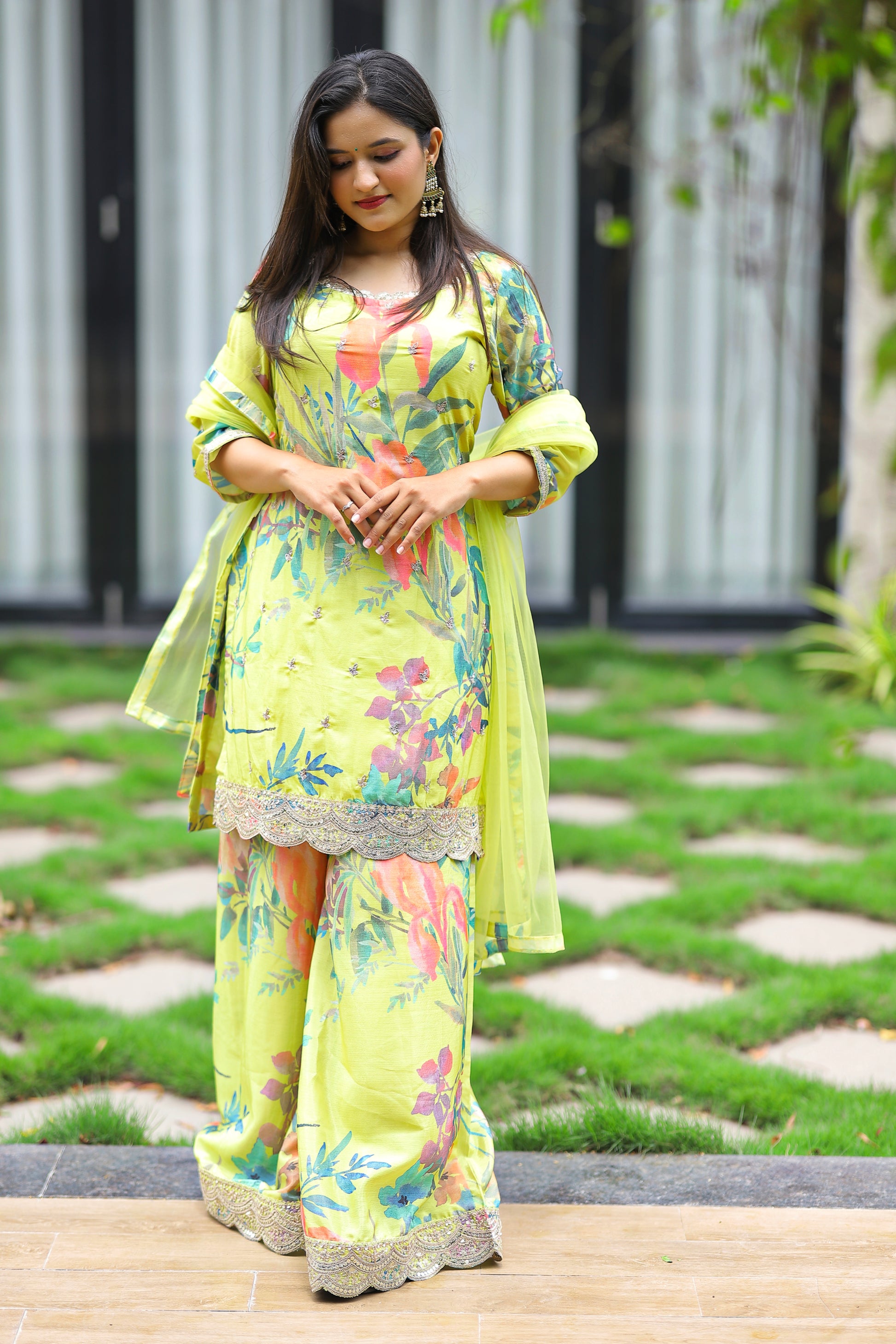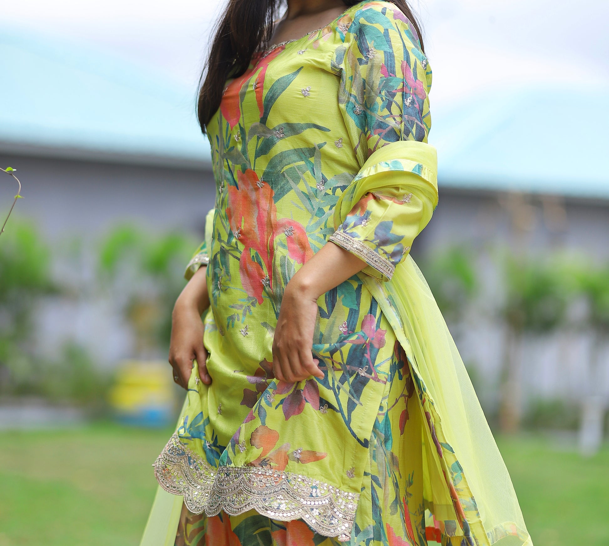 Elevate your wardrobe with the Florosent Plazo Set, expertly crafted for both comfort and style. This set features a flowing plazo paired with a matching top, designed to offer ease of movement and a flattering silhouette. Ideal for casual outings or festive occasions, it combines traditional charm with contemporary elegance, ensuring you look polished and feel confident throughout the day.
