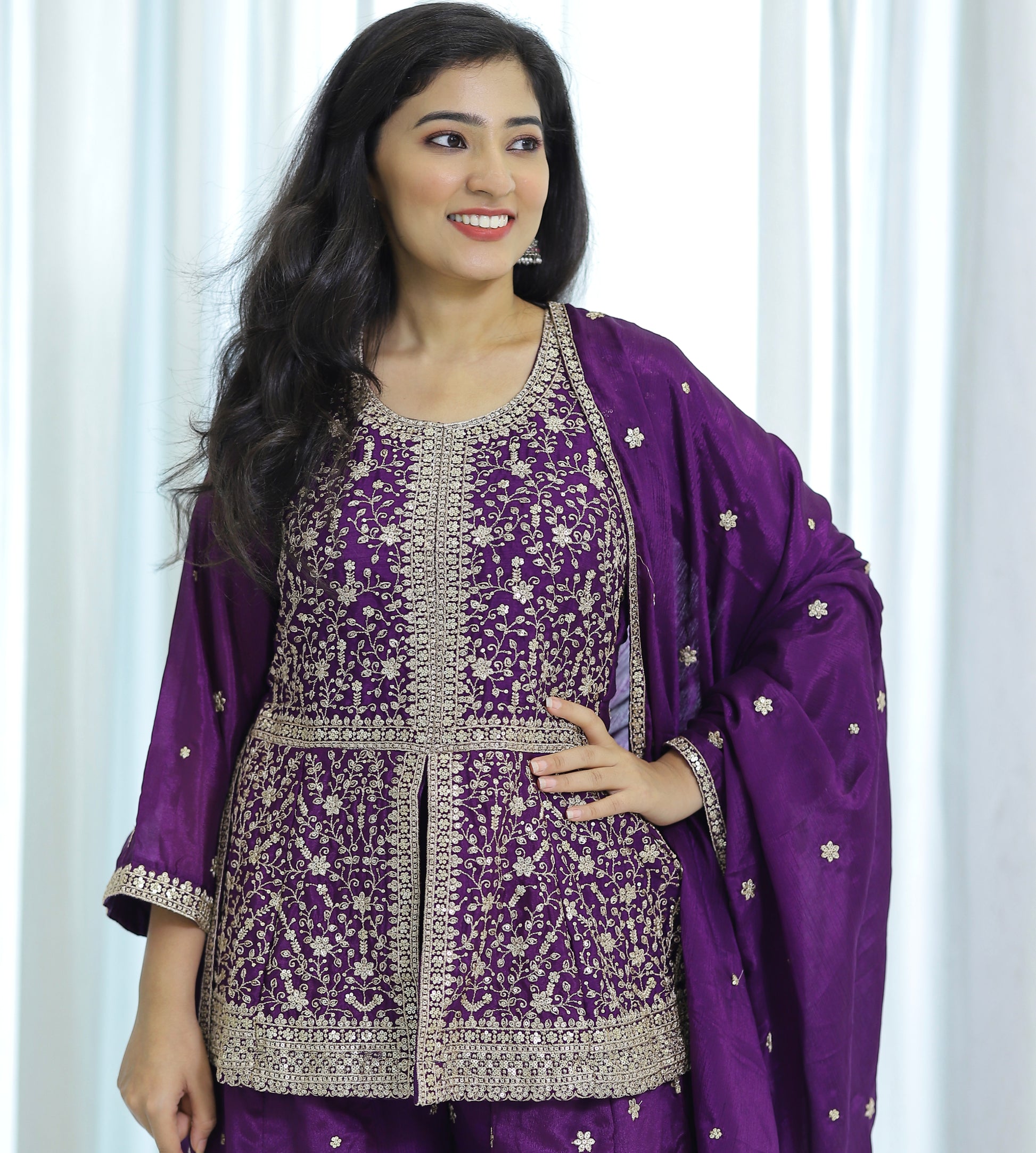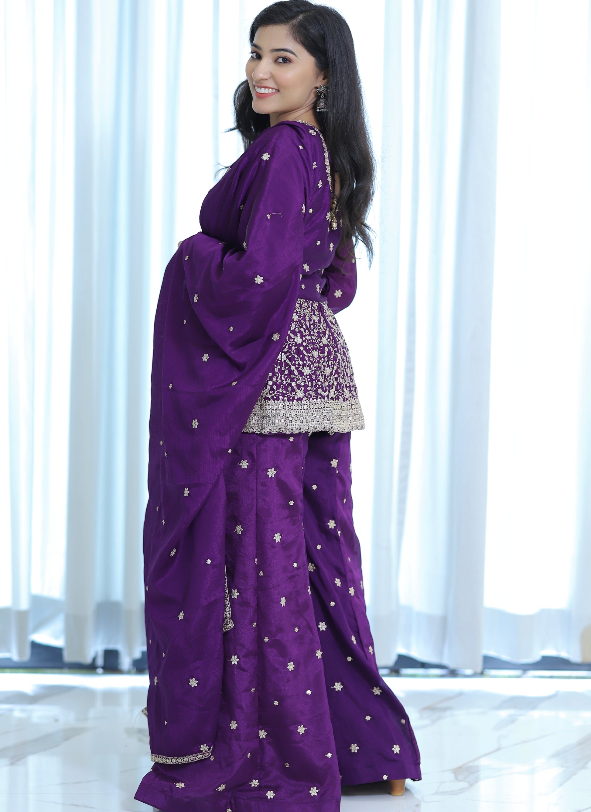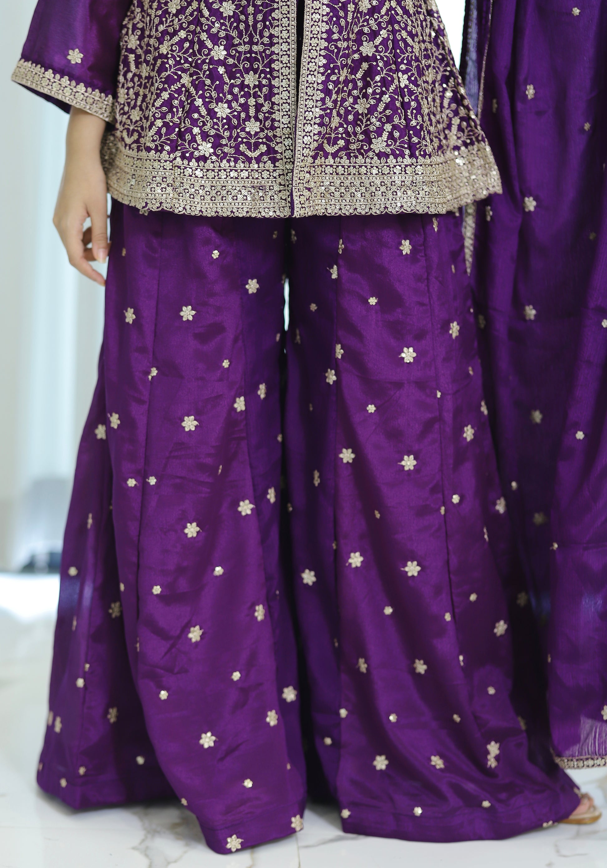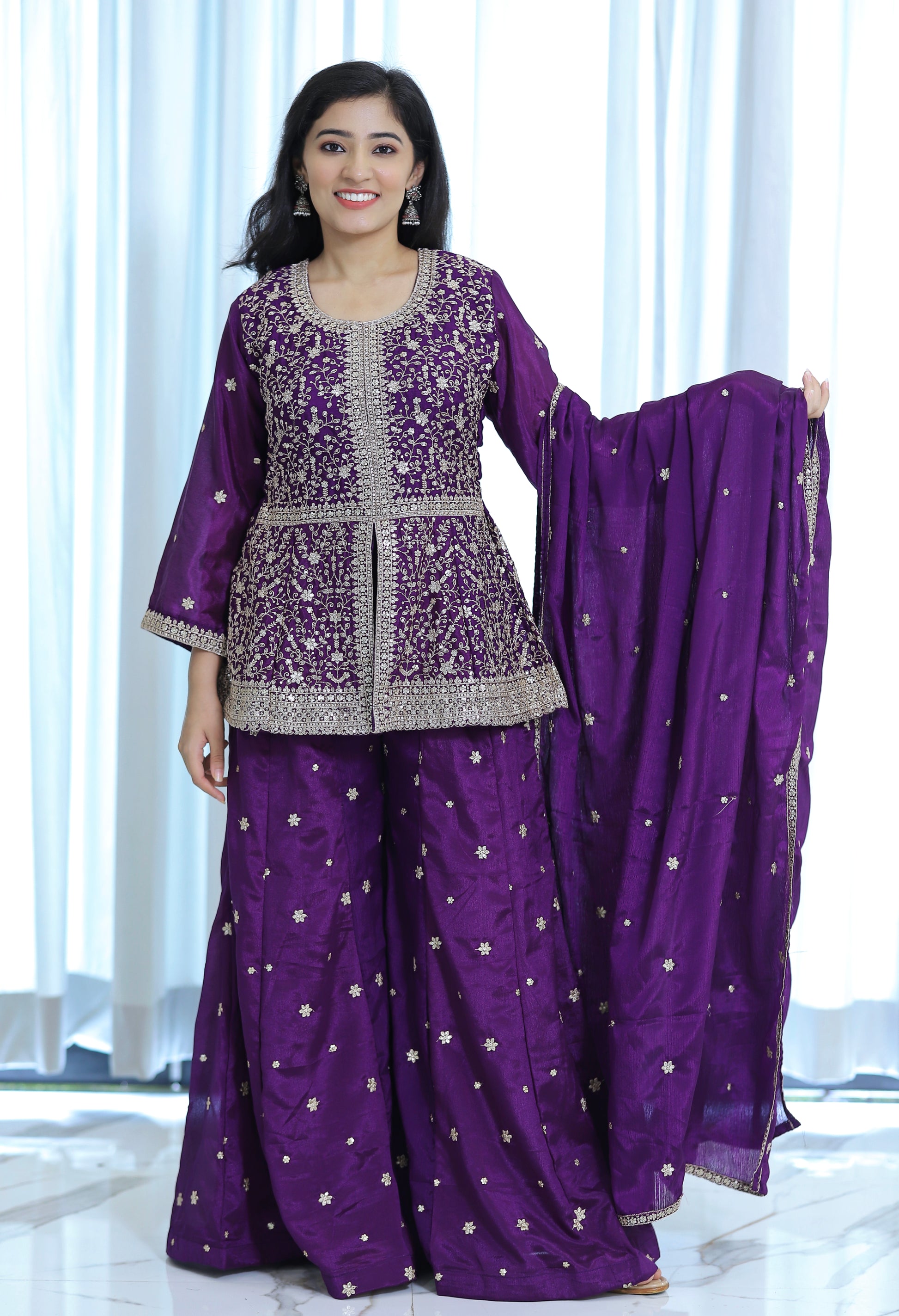 Elevate your festive wardrobe with this Purple Partywear Plazo Set, expertly crafted for style and comfort. The rich purple hue adds a regal touch, while the breathable fabric ensures ease of movement throughout your celebrations. Perfectly tailored to offer a flattering fit, this set combines traditional elegance with contemporary design, making it an ideal choice for parties and special occasions.