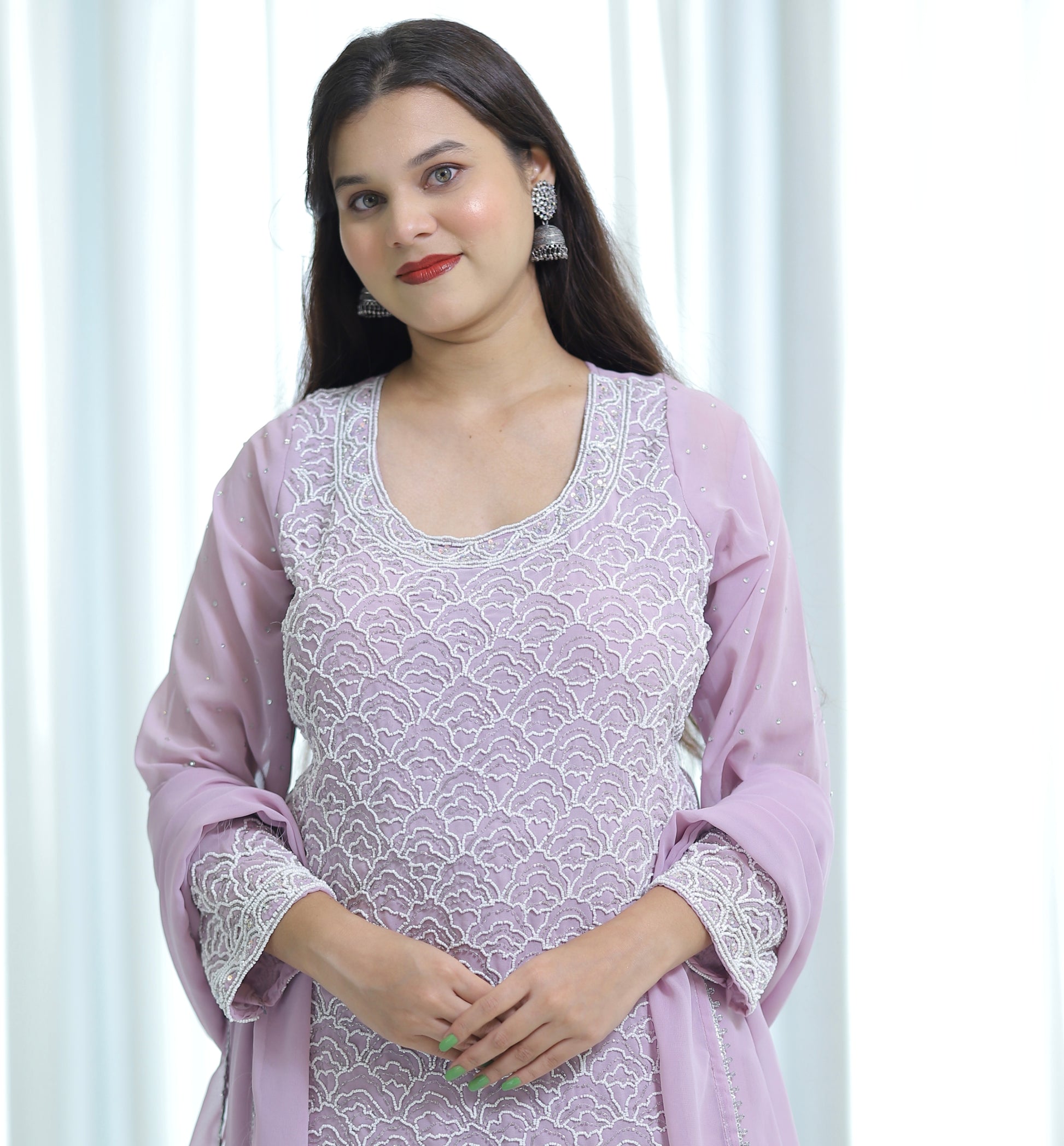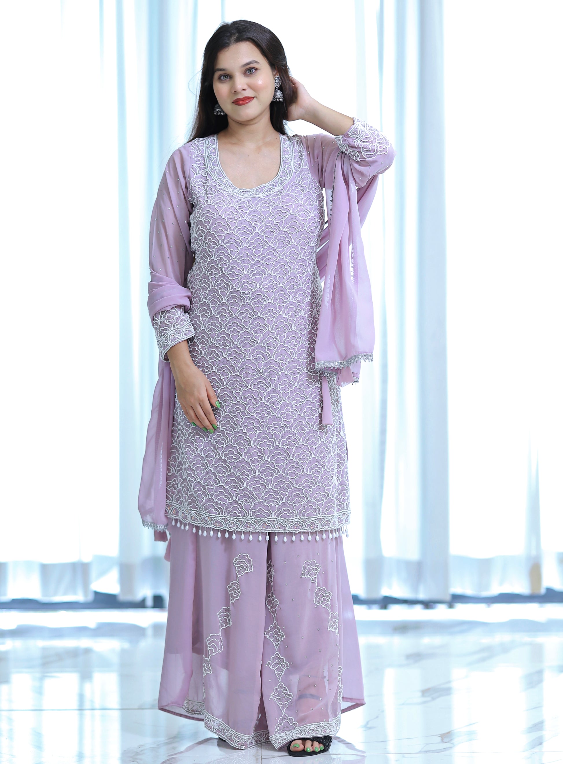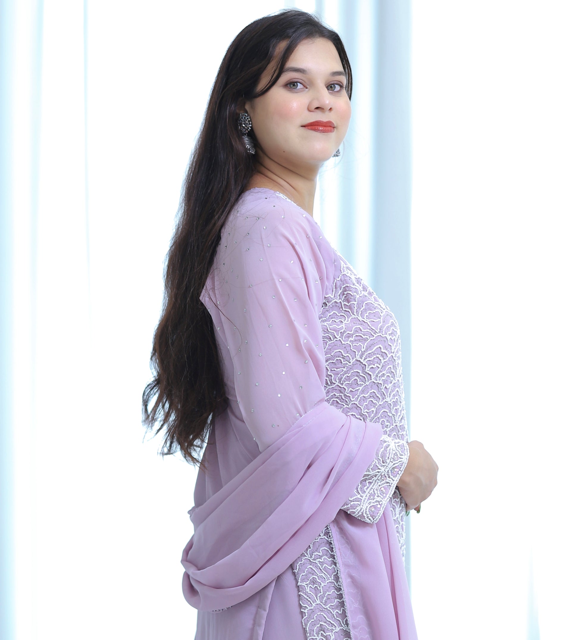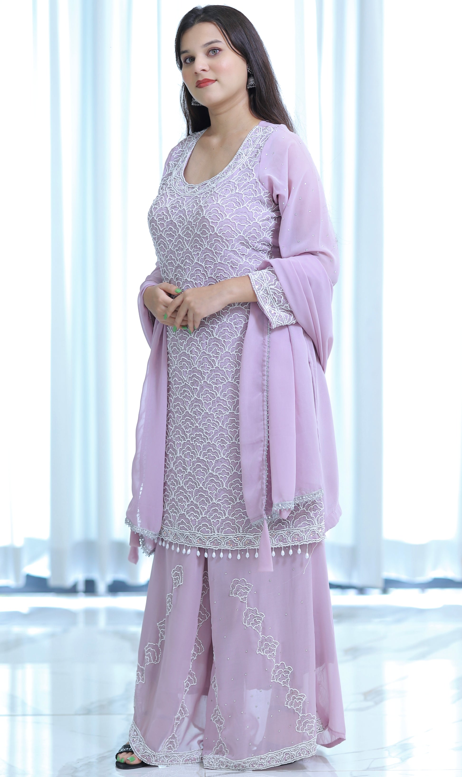 Elevate your festive wardrobe with this Partywear Lavender Plazo Set, expertly crafted for both style and comfort. The soft lavender hue adds a subtle yet sophisticated charm, while the breathable fabric ensures ease of movement throughout your celebrations. Perfectly tailored to offer a flattering fit, this set combines traditional elegance with contemporary design, making it an ideal choice for special occasions.