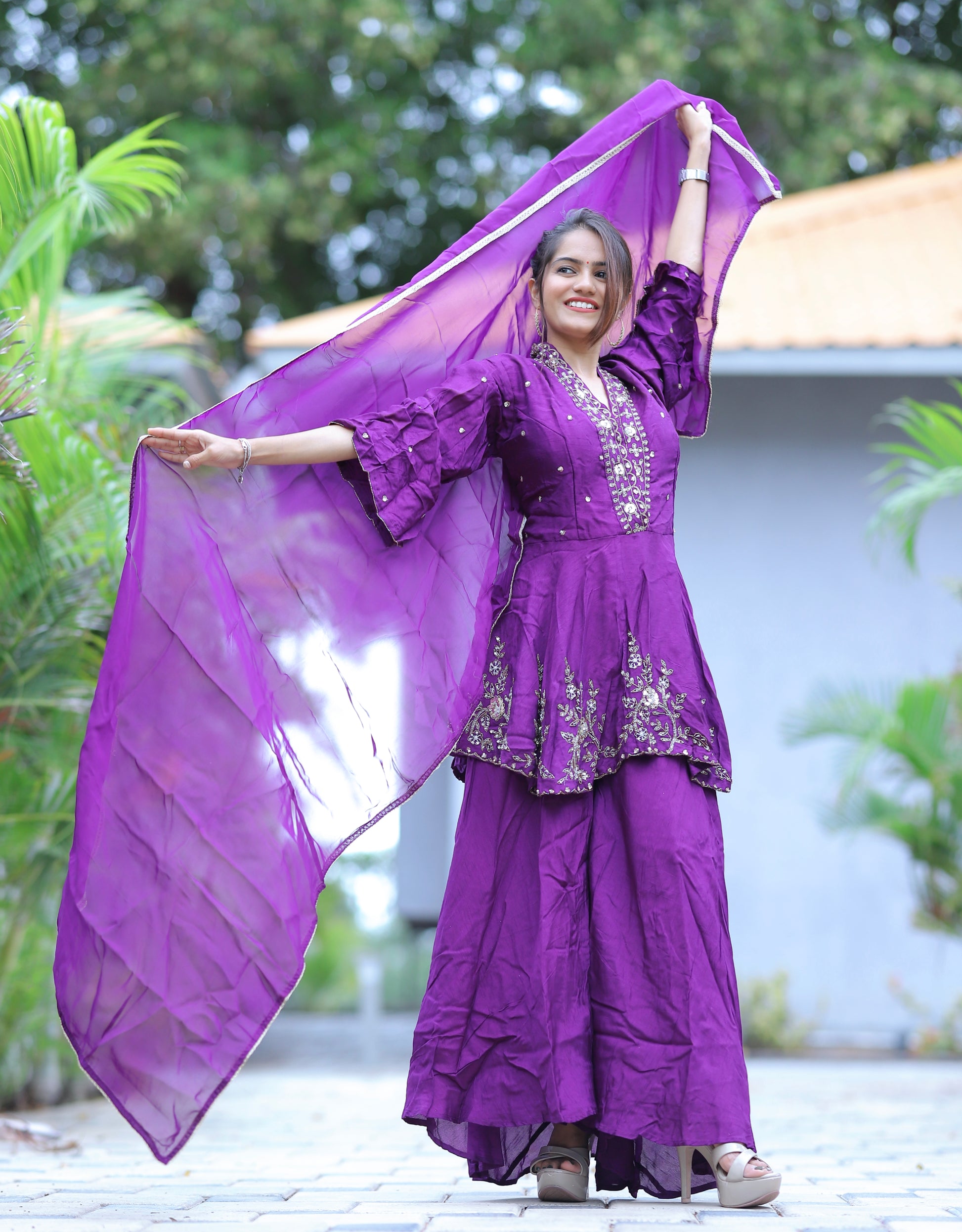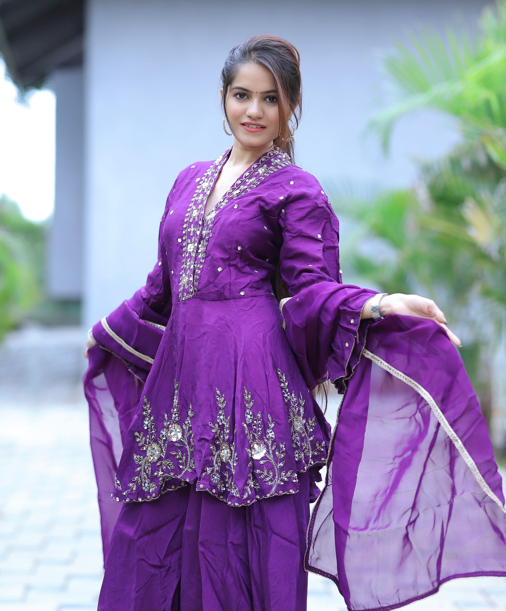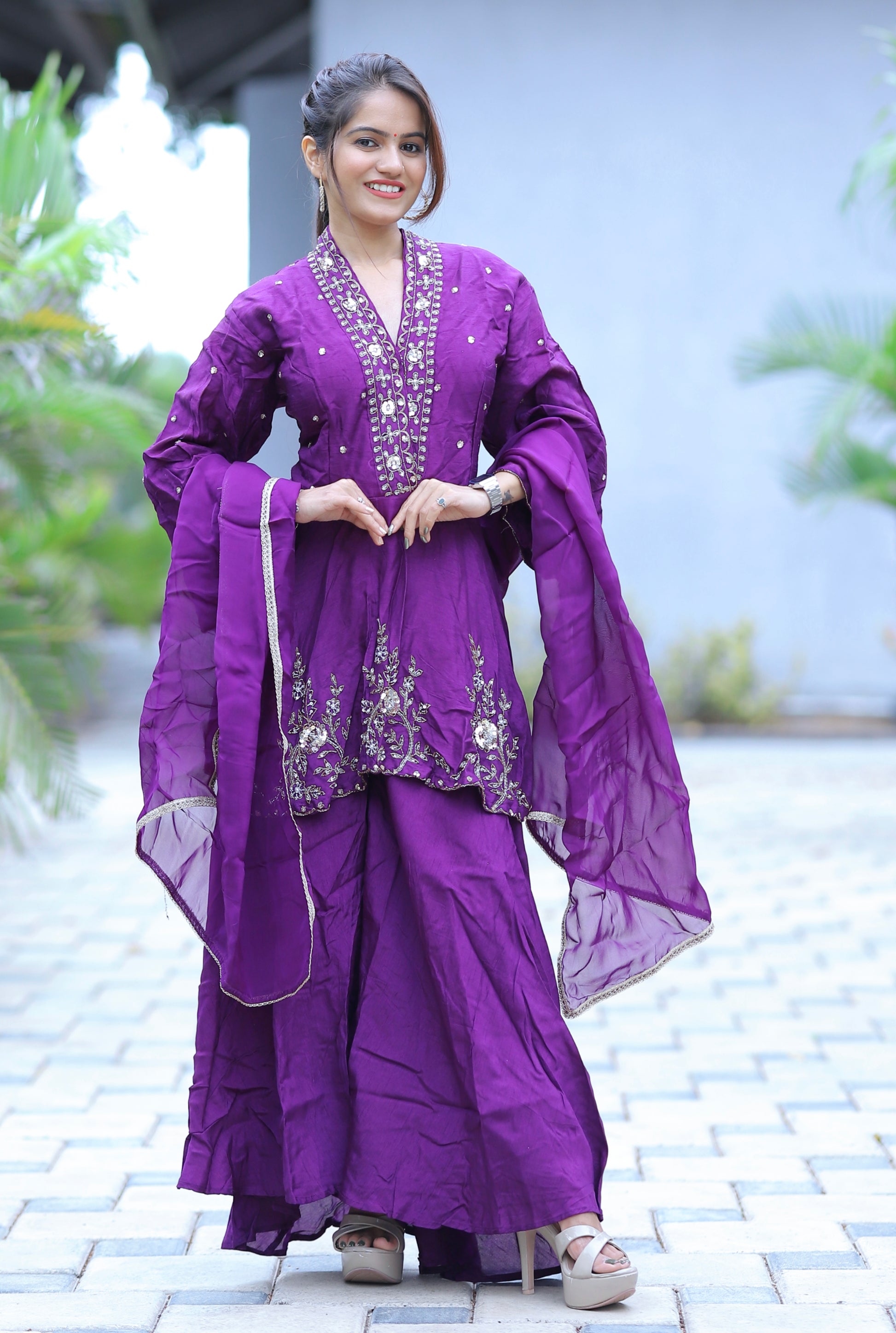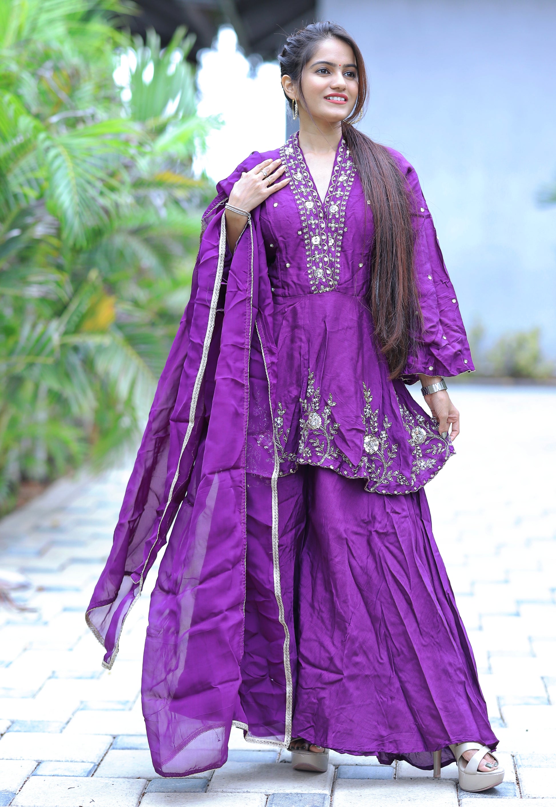 Elevate your festive wardrobe with this expert-crafted purple plazo set, designed for comfort and style. The breathable fabric ensures ease of movement, while the rich purple hue adds a regal touch perfect for parties and special occasions. Its tailored fit enhances silhouette elegance, making it a versatile choice for sophisticated celebrations.