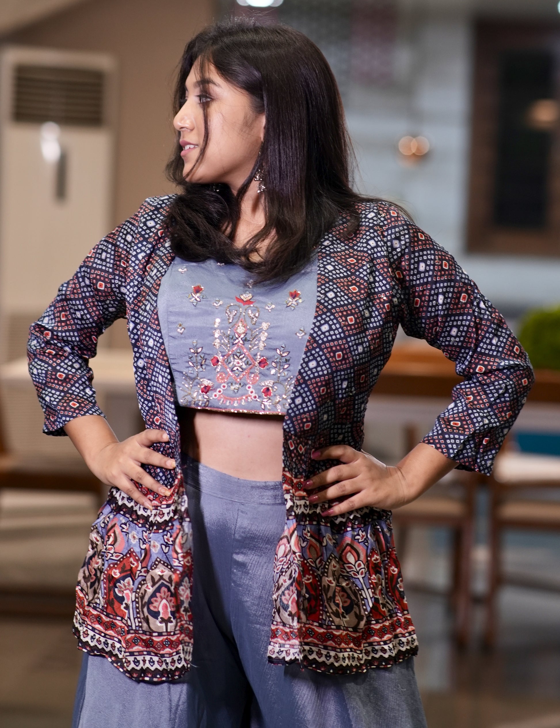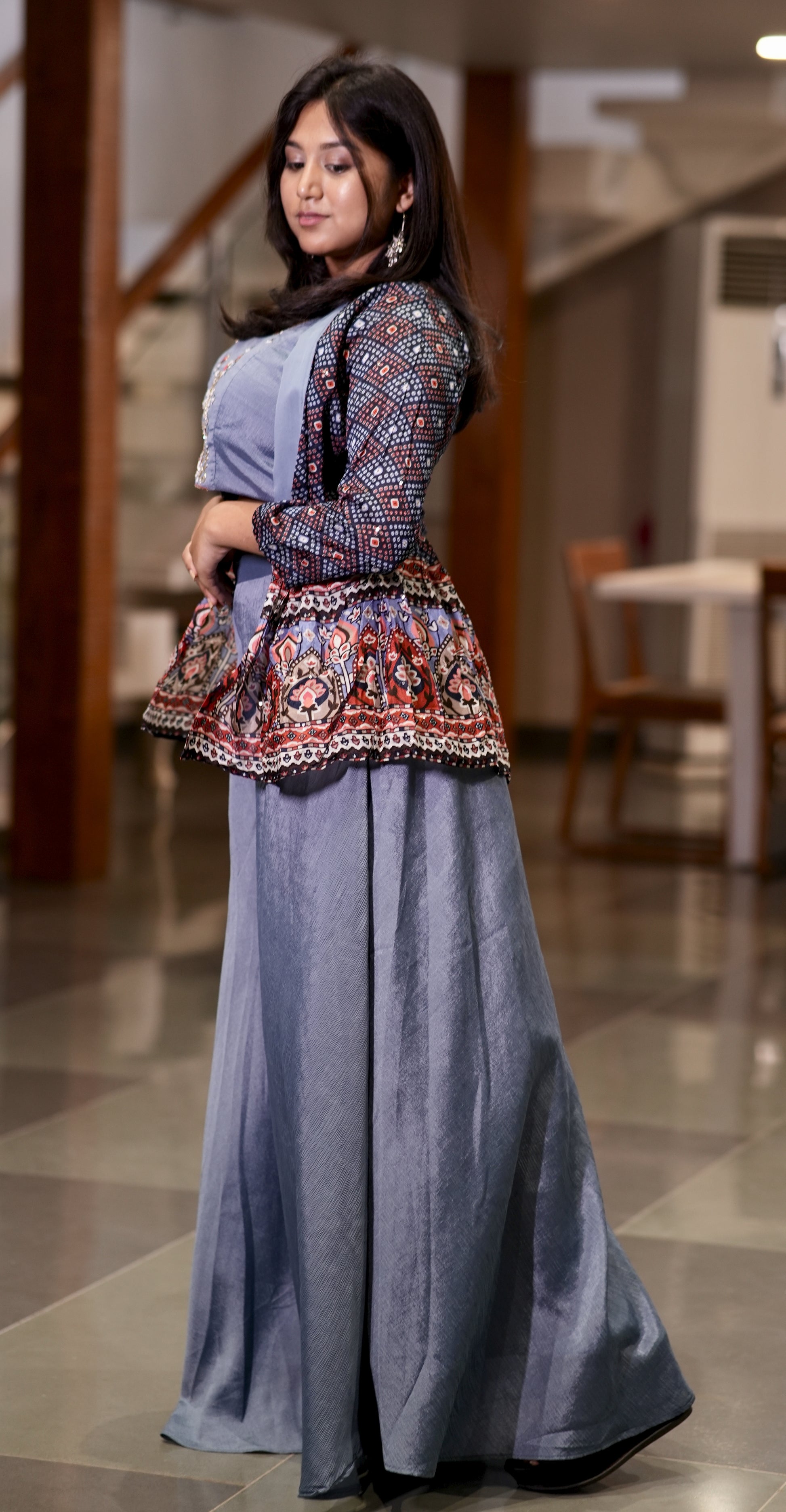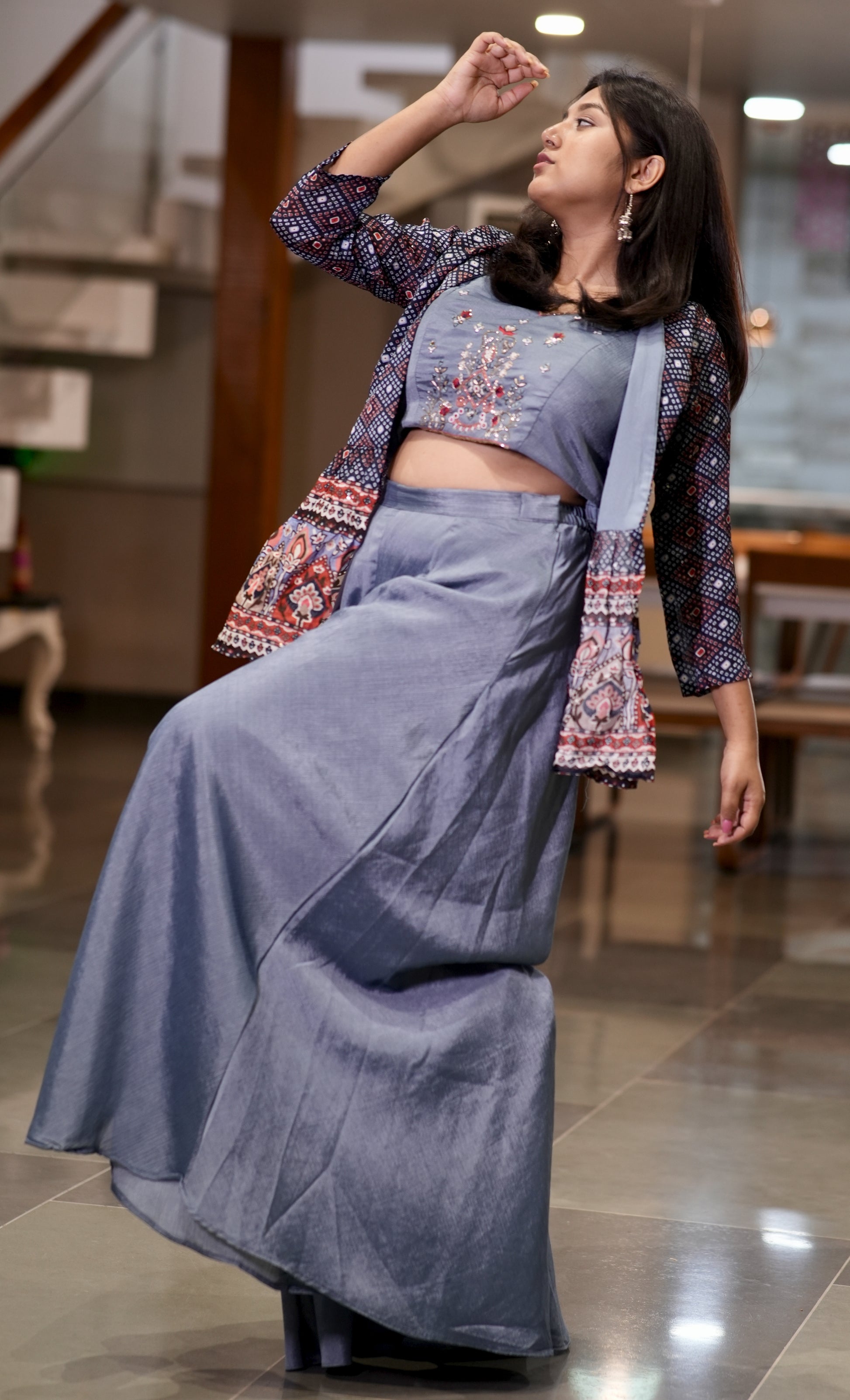 Elevate your wardrobe with this expertly crafted grey partwear plazo set, designed for both comfort and style. The breathable fabric ensures all-day ease, while the tailored fit offers a flattering silhouette. Perfect for casual outings or semi-formal occasions, this versatile set combines modern design with traditional elegance.