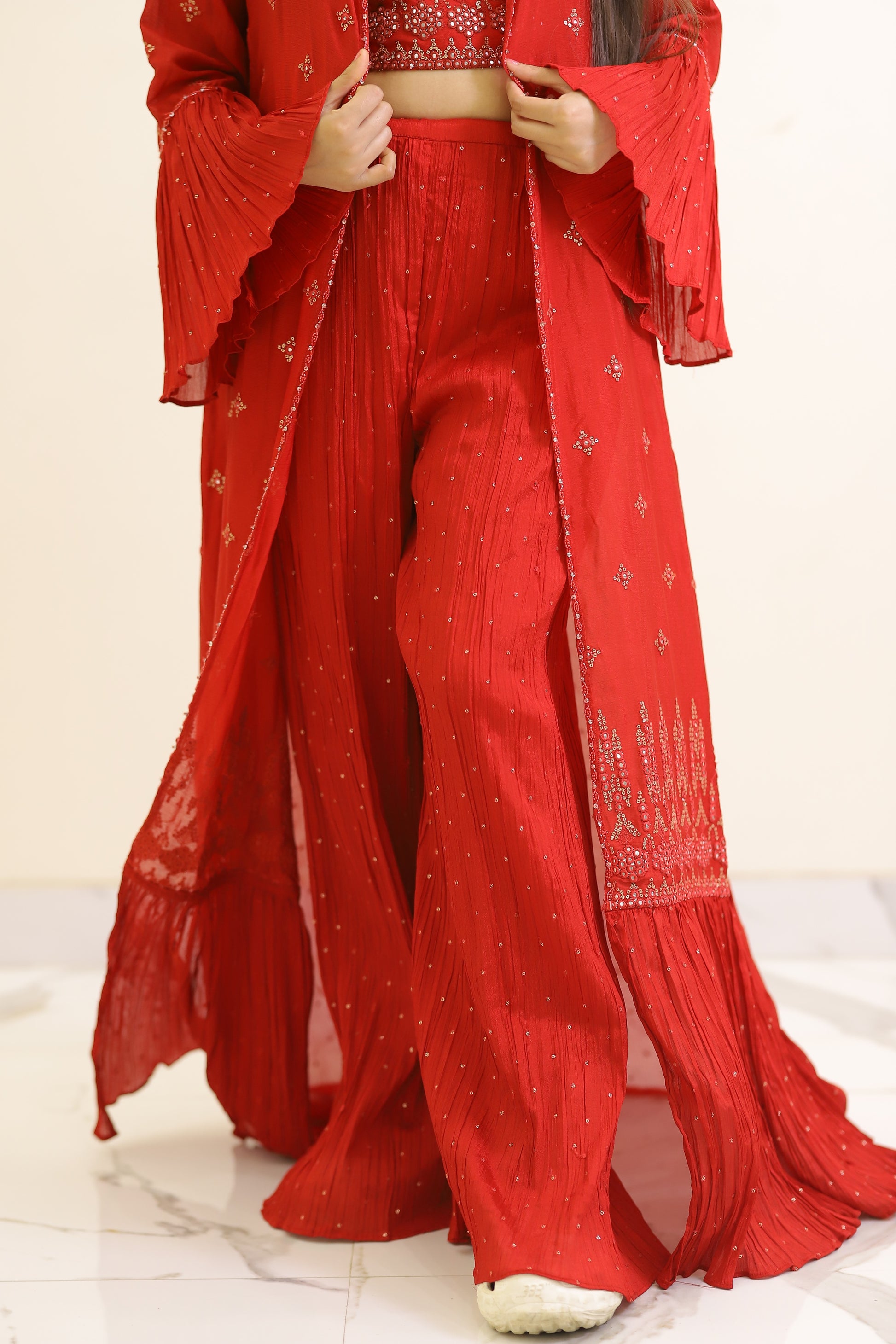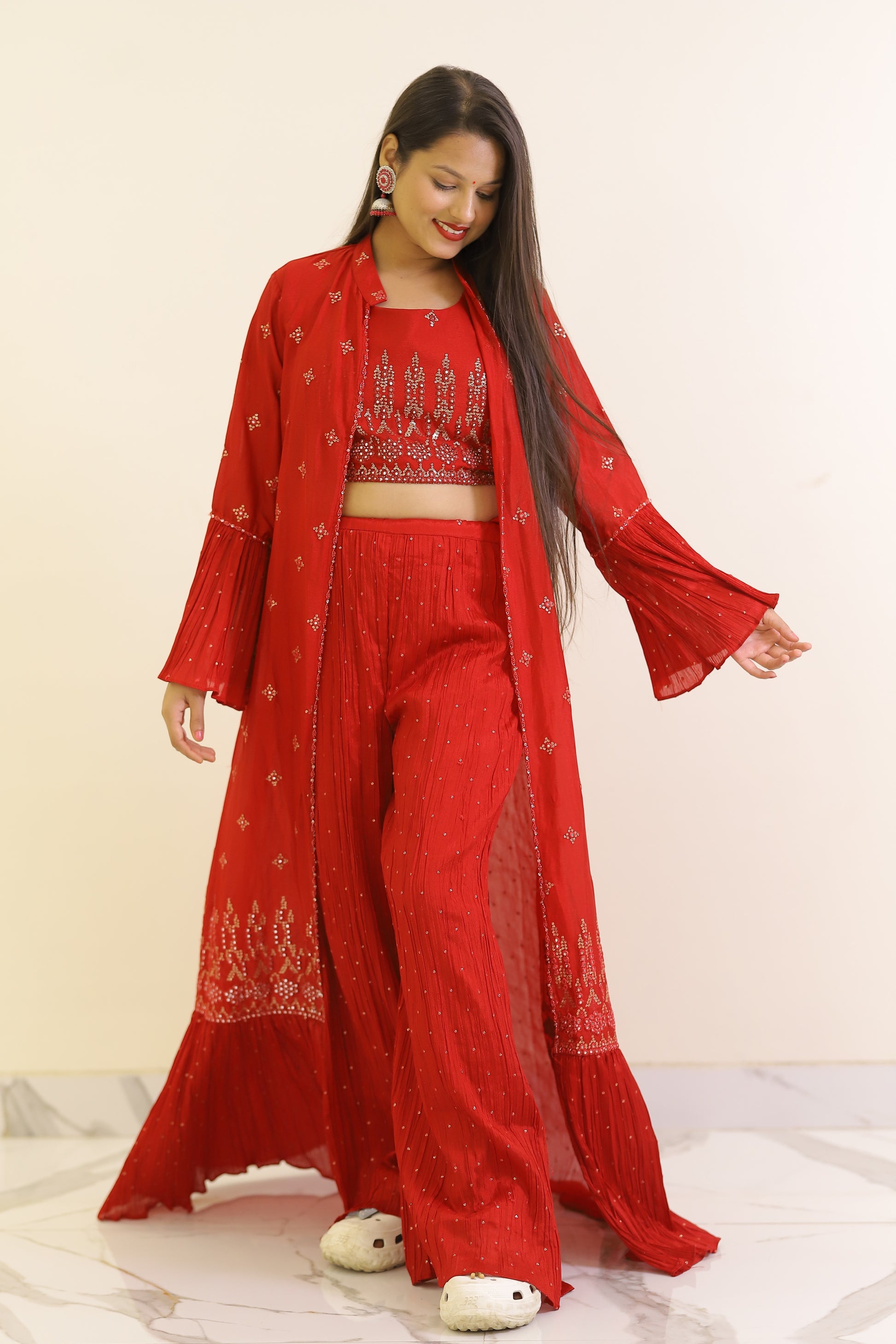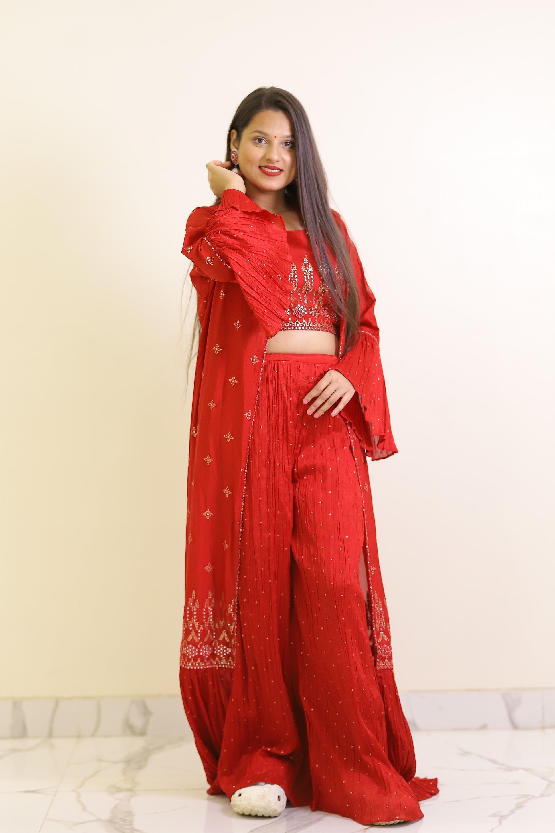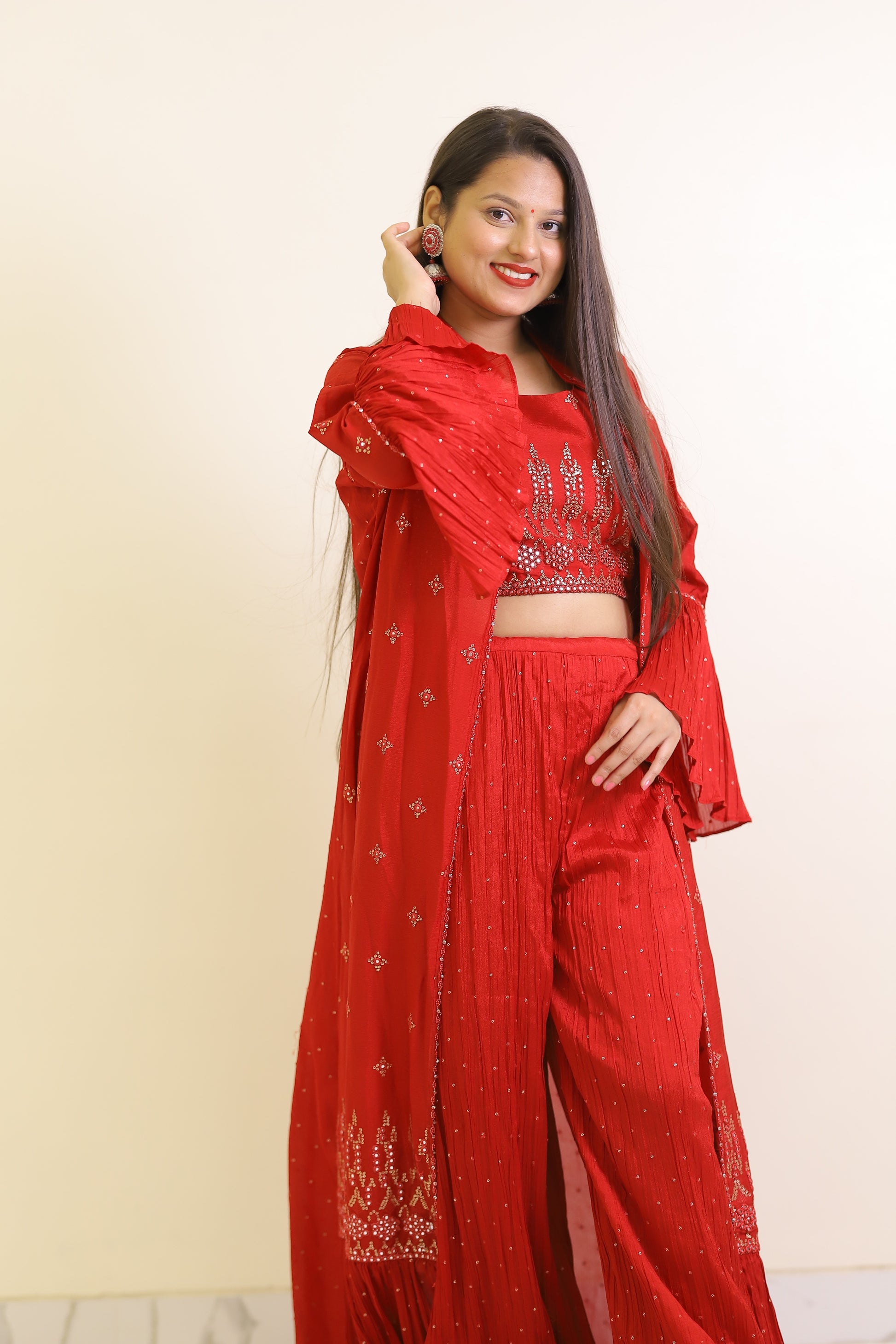 Elevate your wardrobe with this fresh red plazzo set, expertly crafted for both comfort and style. The vibrant red hue adds a bold statement, while the tailored plazzo pants provide effortless movement and a flattering silhouette. Ideal for formal occasions or casual outings, this set combines contemporary design with classic appeal for a versatile addition to your collection.