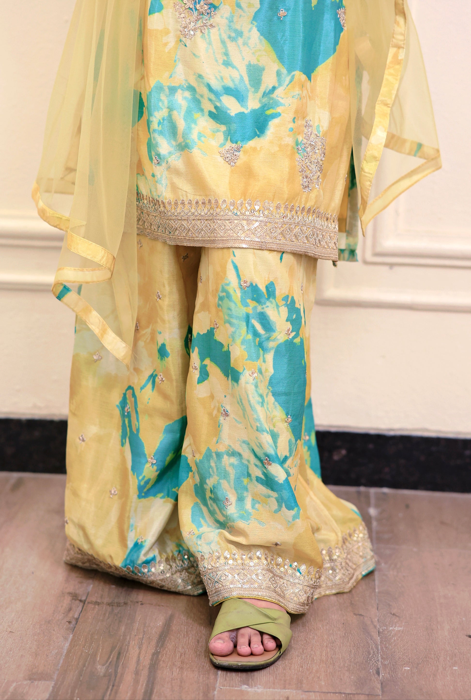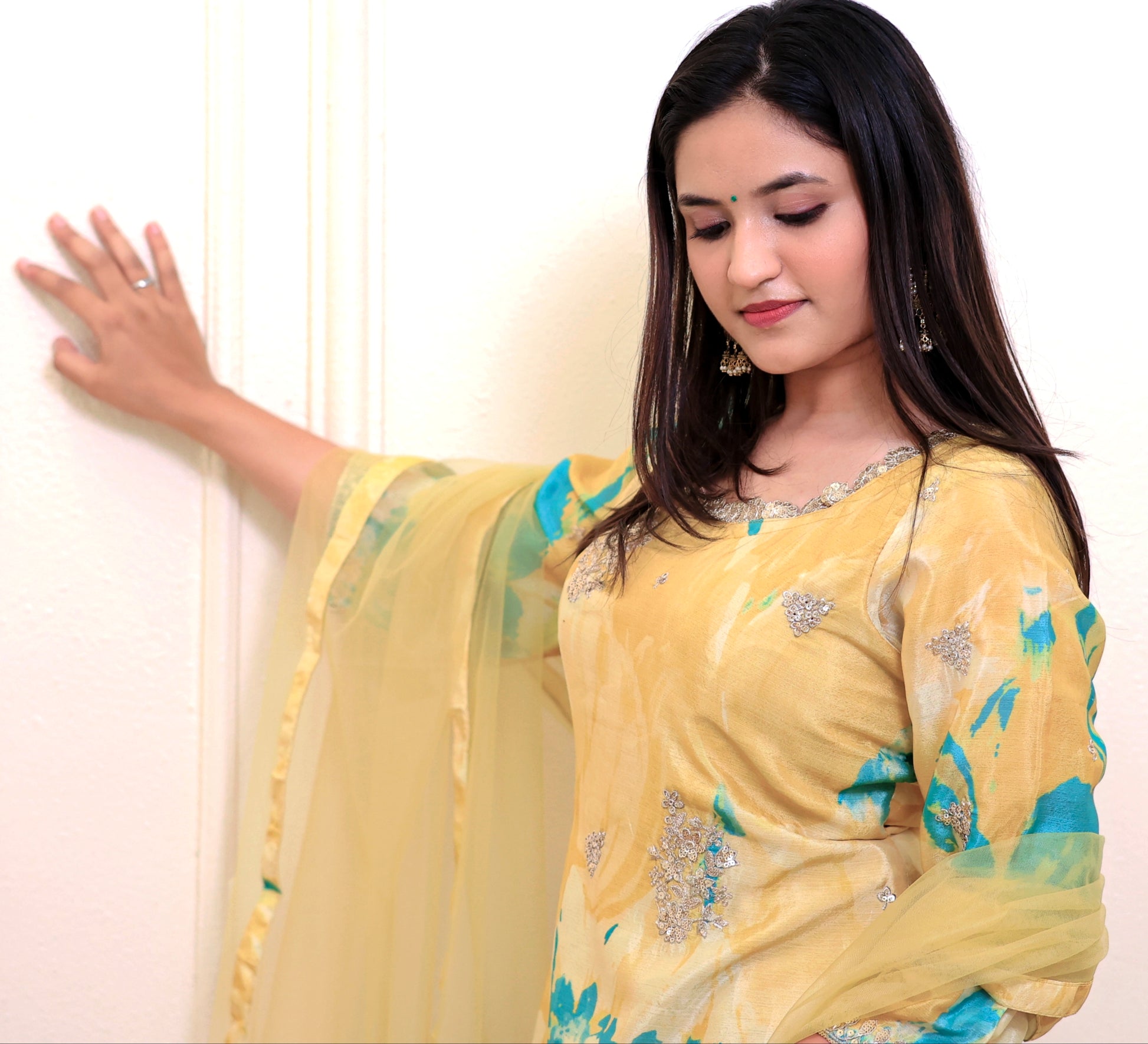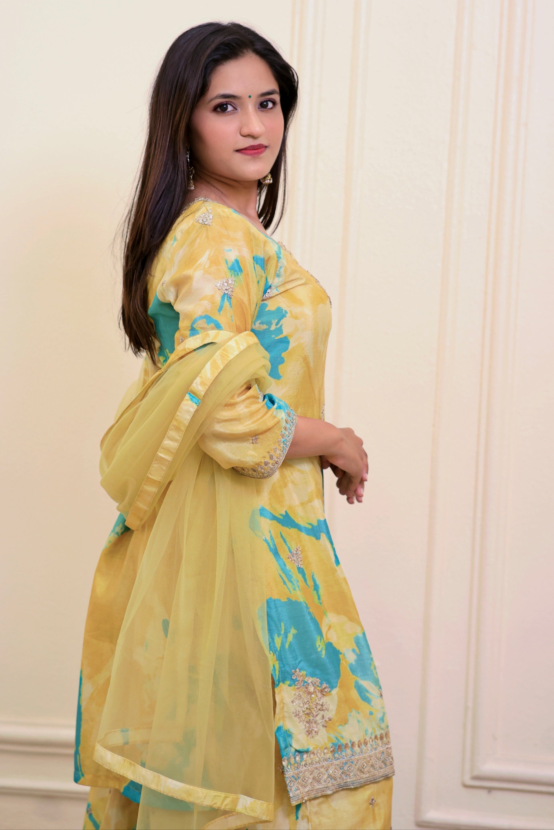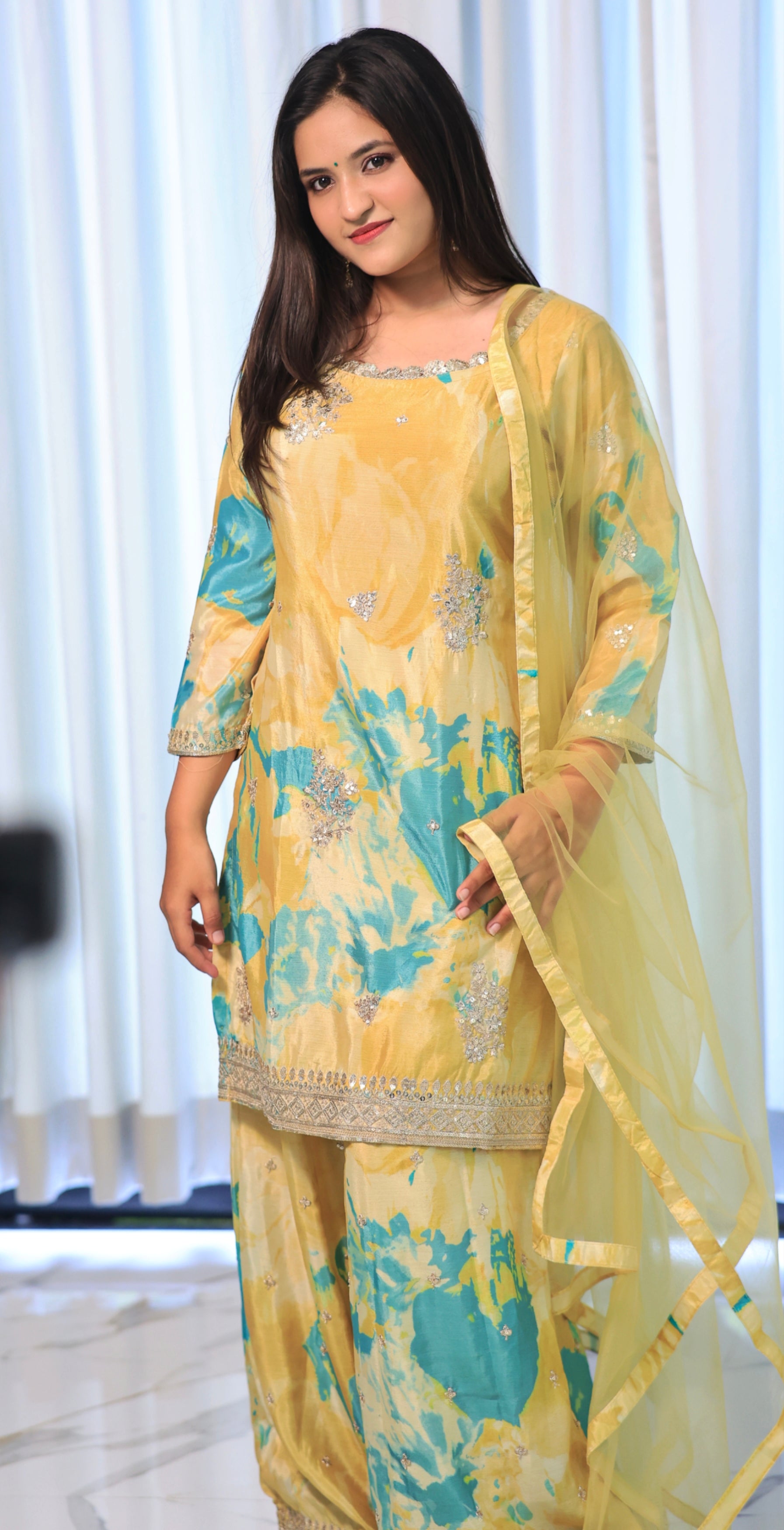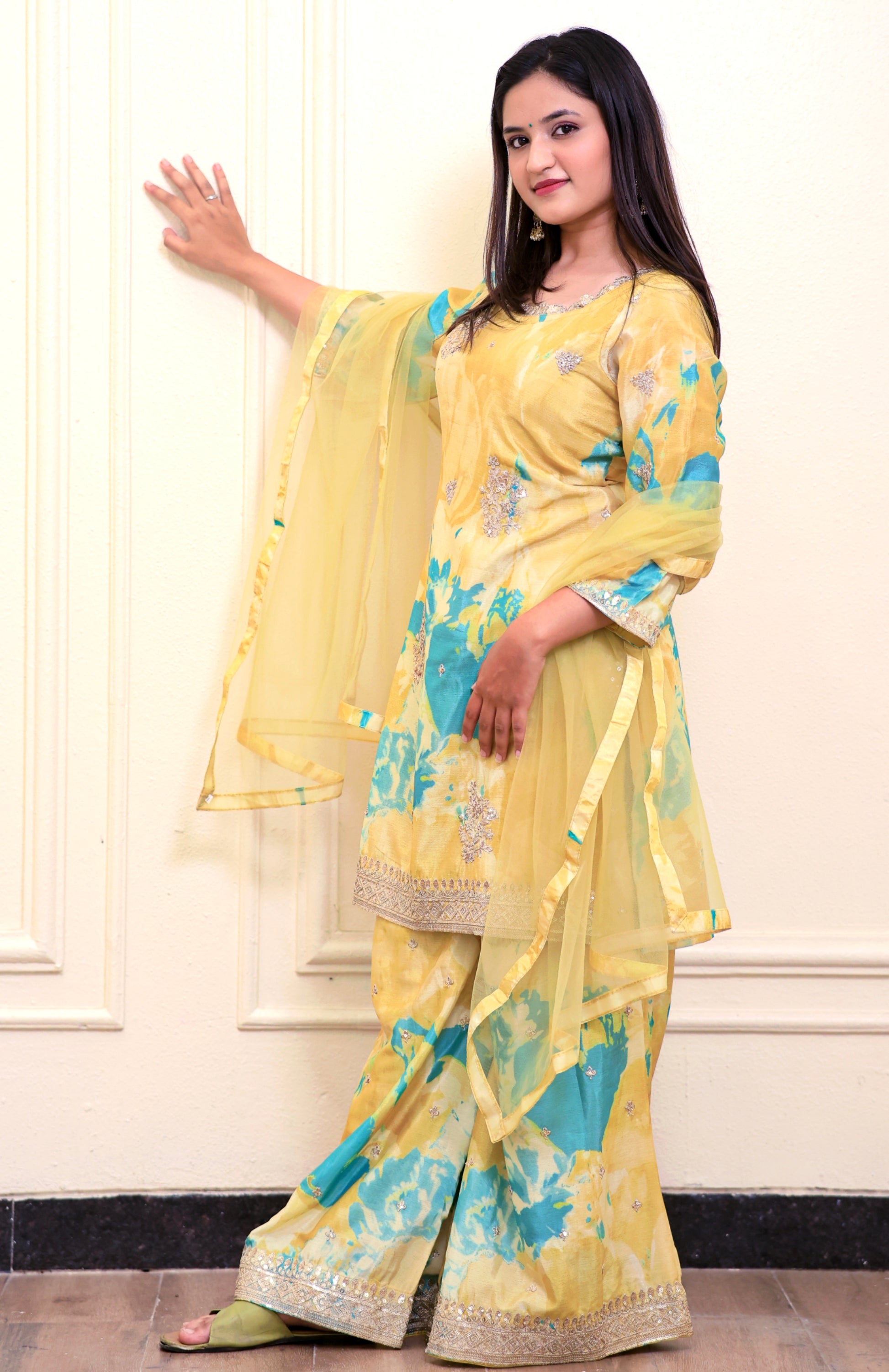 Elevate your wardrobe with this expertly crafted yellow plazo set, designed for both comfort and style. The breathable fabric ensures all-day ease, while the vibrant yellow hue adds a fresh, lively touch to your ensemble. Perfect for casual outings or festive occasions, this set combines traditional charm with modern tailoring for a versatile look.